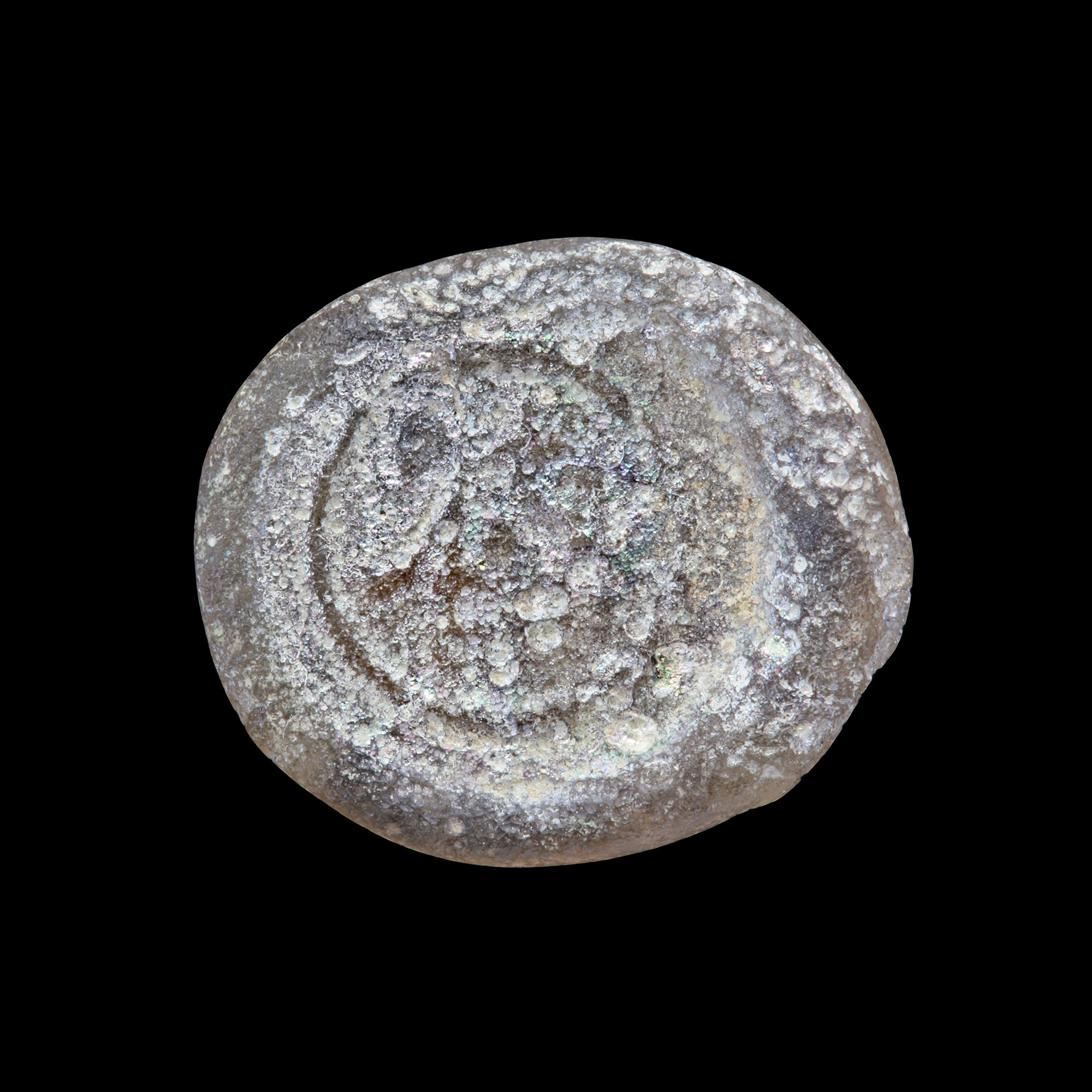 Glass weight, moulded and stamped, transparent pale in colour, citing in the centre with the name Al-Hakim bi-Amr Allah(386-411 AH/996-1021 AD).