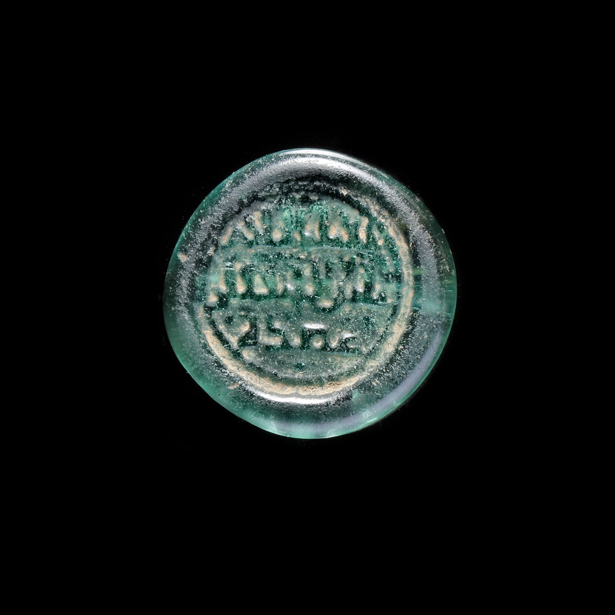 Glass weight, moulded and stamped, transparent dark-green in colour, citing in the centre with the name Al-Hakim bi-Amr Allah and his crown prince, reverse with kalimaat al-tawhid, 2.969g, 21.2 by 21.4 mm, coin weight: 1 dirham. B145, N 38