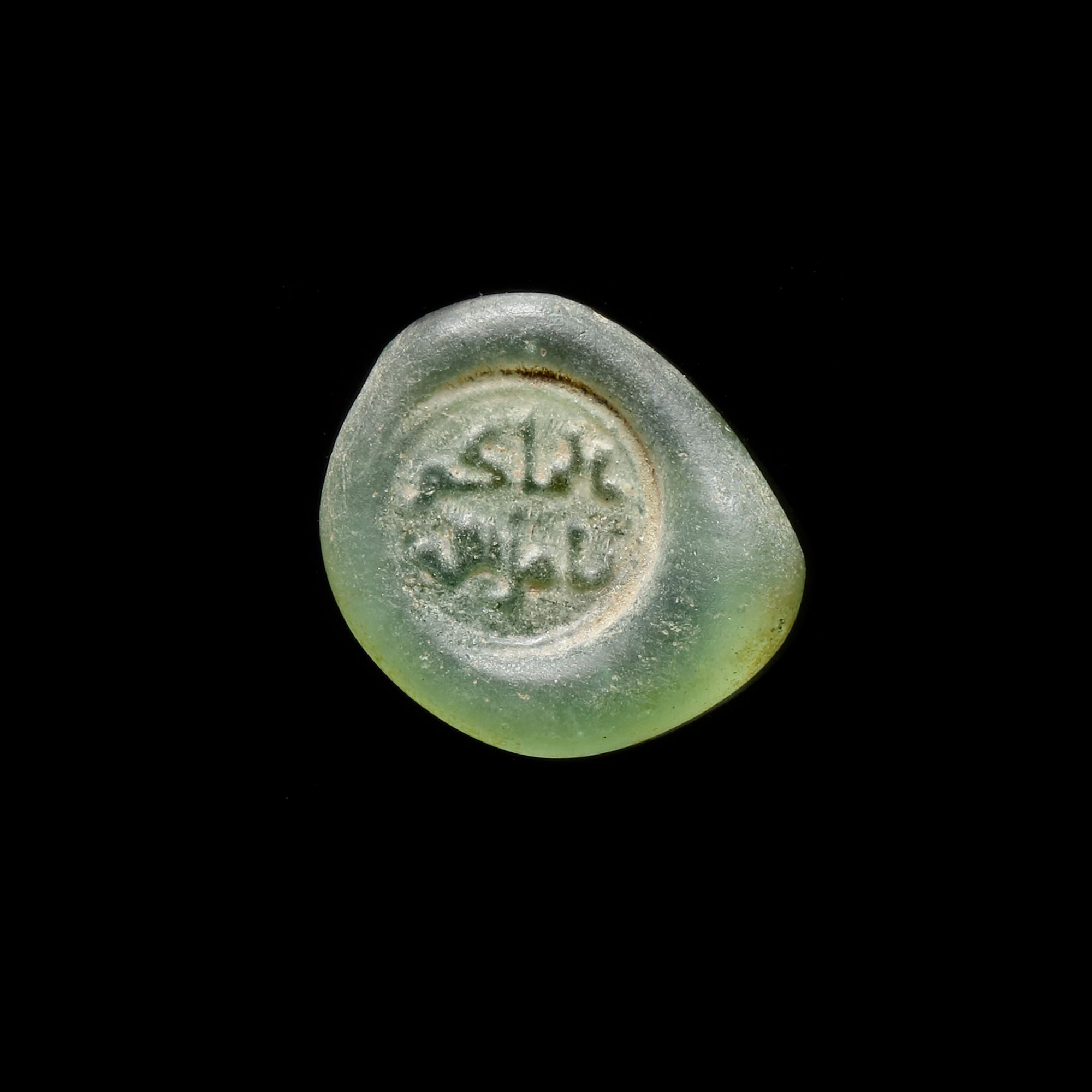 Glass weight, moulded and stamped, transparent dark-green in colour, citing in the centre with the name Al-Hakim bi-Amr Allah, 2.919g, 18 by 21 mm, coin weight: 1 dirham.