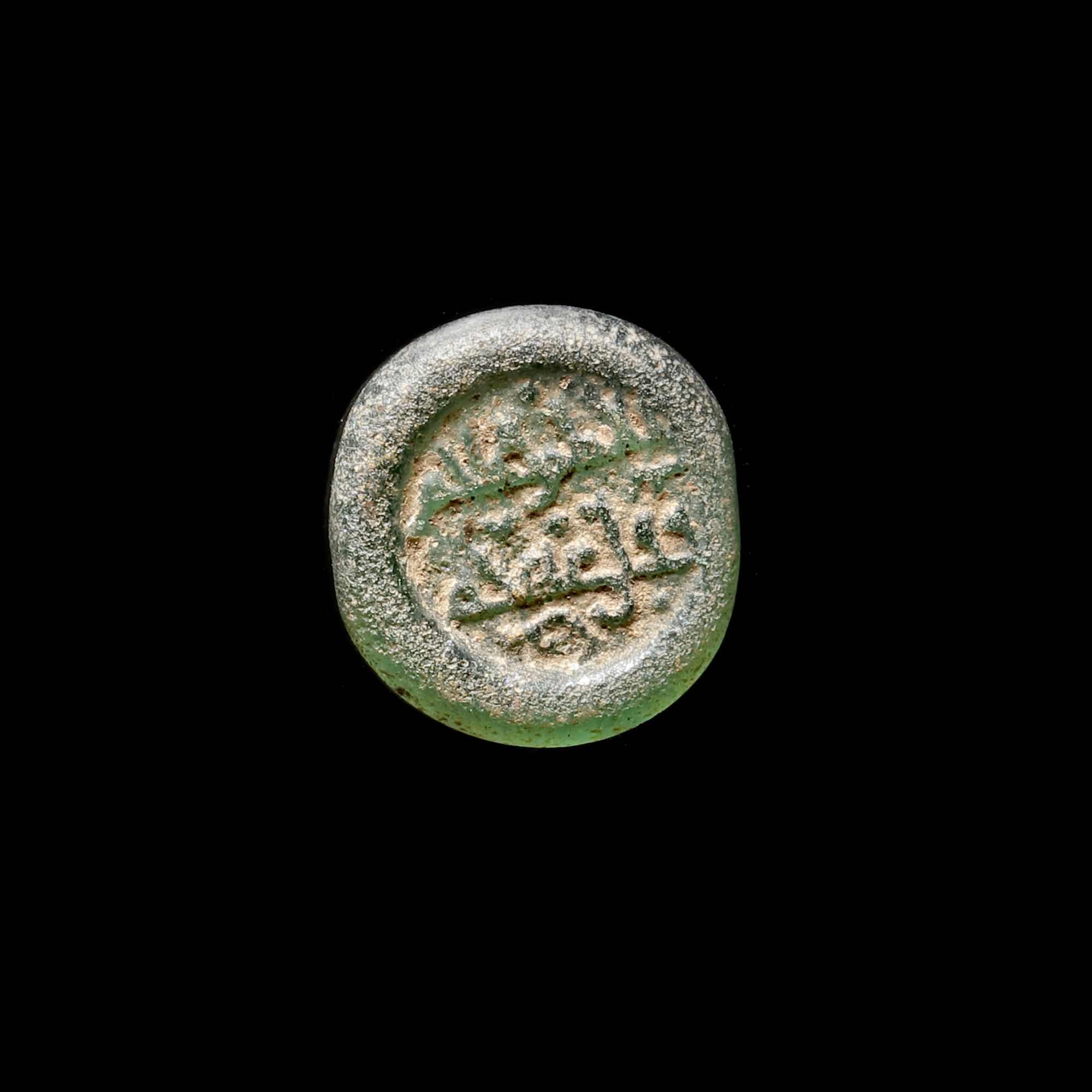 Glass weight, moulded and stamped, transparent pale-green in colour, citing in the centre with the name Al-Hakim and his crown prince, 1.432g, 15 mm, coin weight: half dirham