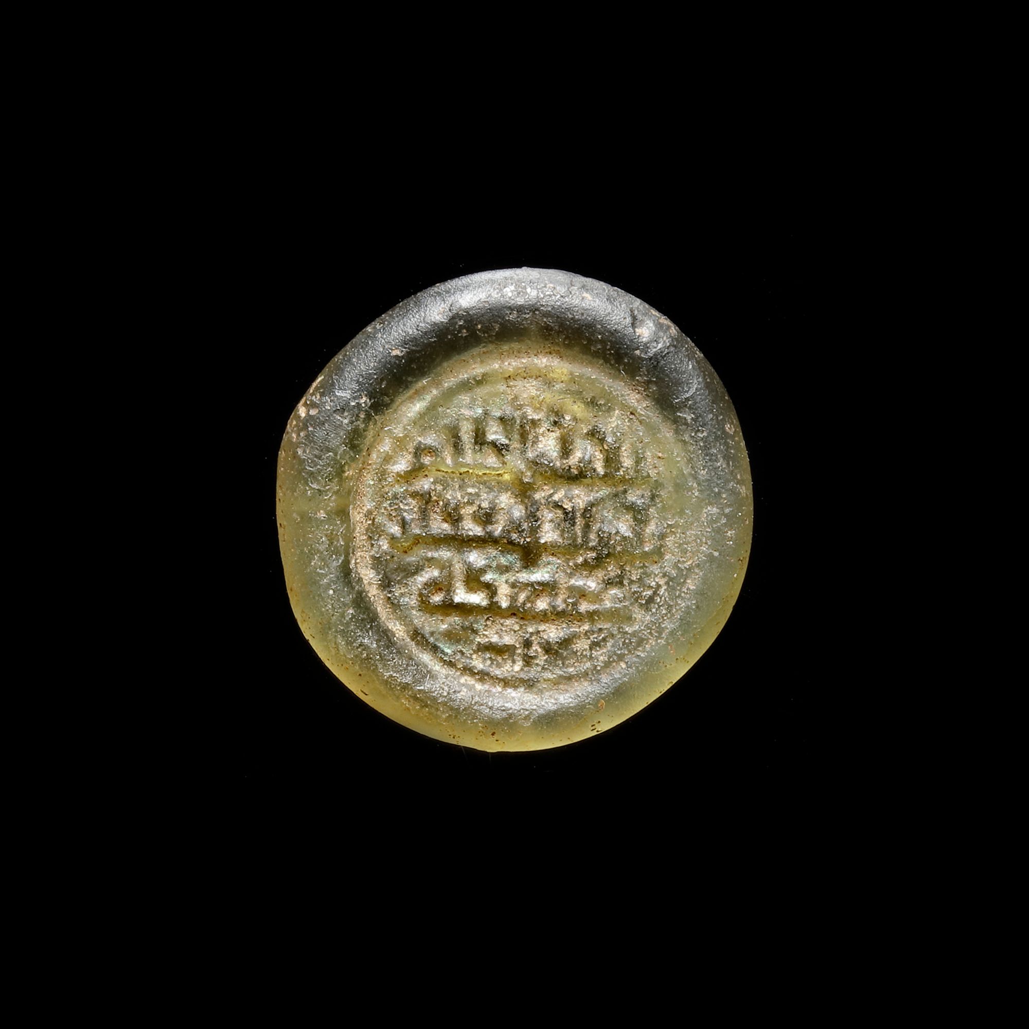 Glass weight, moulded and stamped, transparent light-green in colour, citing in the centre with the name Al-Imam Al-Hakim bi-Amr Allah and his crown prince, 2.847g, 20 mm, coin weight: 1 dirham