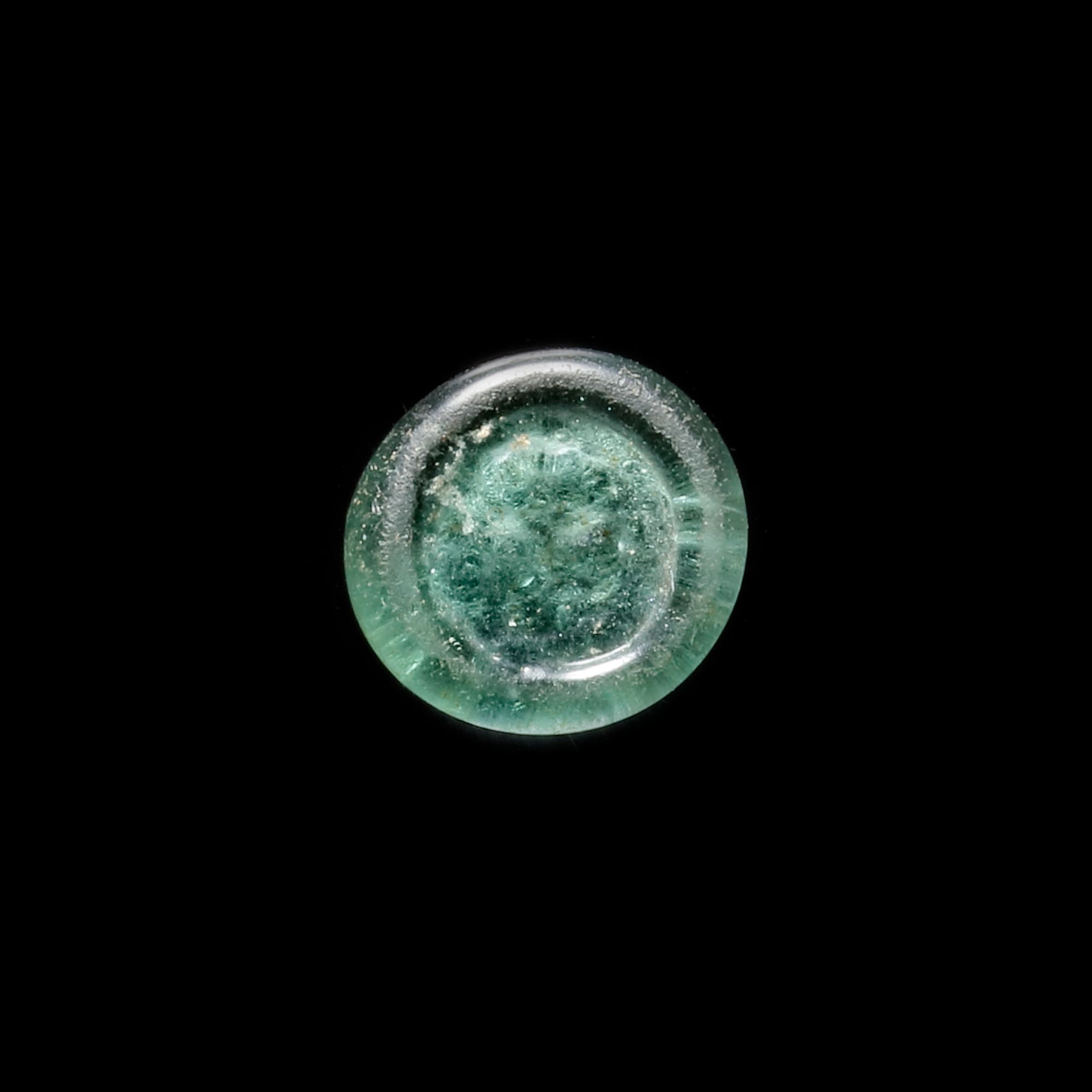Glass weight, moulded and stamped, transparent green in colour, citing in the centre with the name Al-Imam Ma'ad, 0.726g, 11 mm, coin weight: quarter dirham.