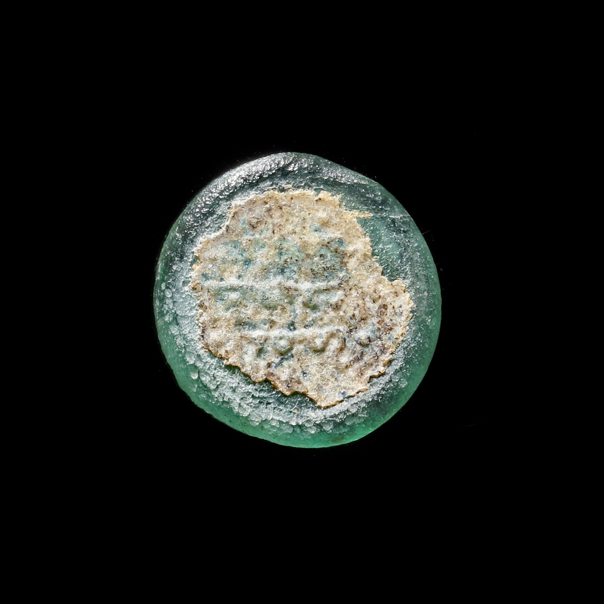 Glass weight, moulded and stamped, transparent pale-turquoise in colour, citing in the centre with the name Al-Imam Ma'ad Abu Tamim al-Mustansir, 2.283g, 19 mm, coin weight: half dinar, with lustre patina.