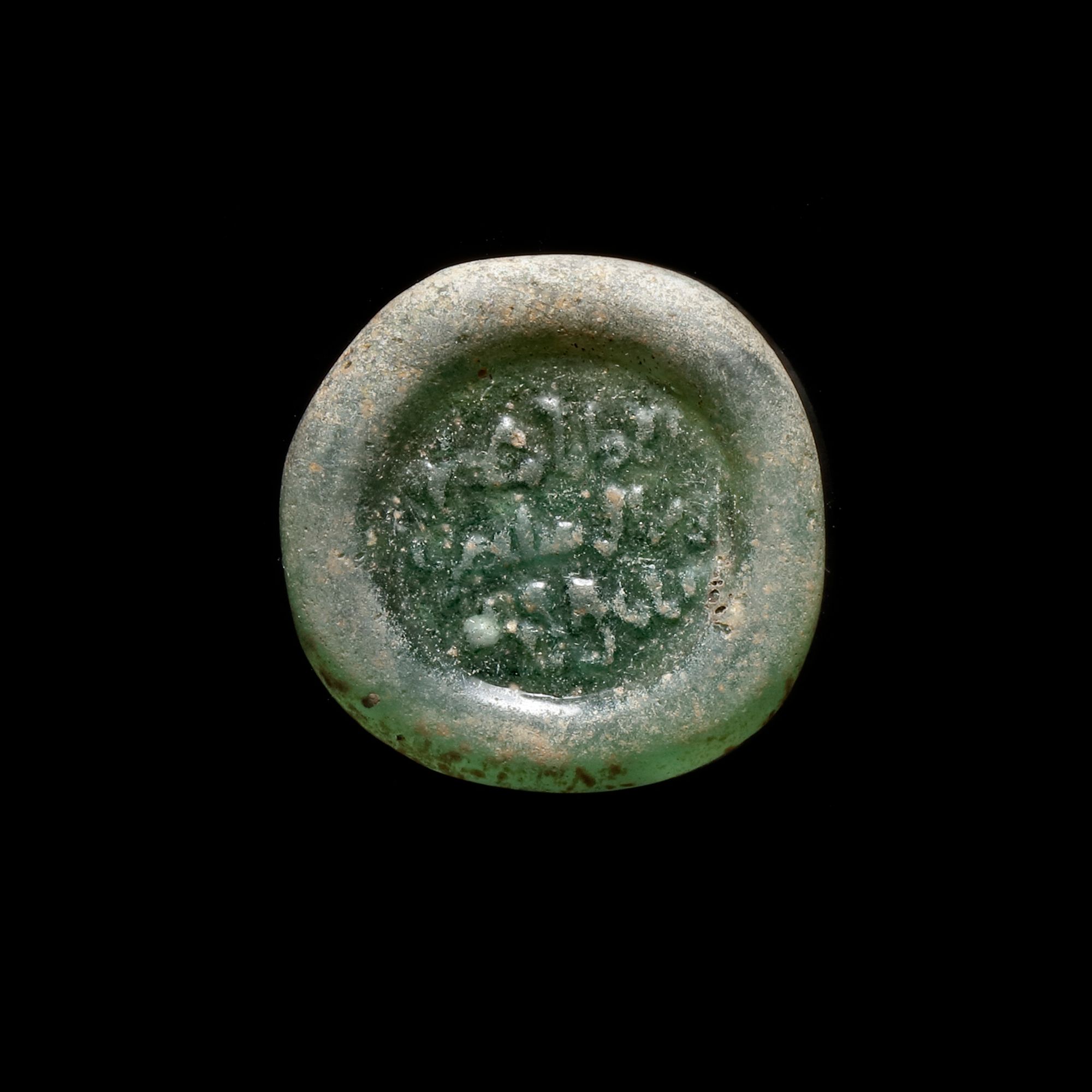 Glass weight, moulded and stamped, transparent dark-green in colour, citing in the centre with the name Al-Imam Ma'ad Abu Tamim al-Mustansir Amir al-Mu'mnin, 5.833g, 25.8 mm, coin weight: double dirham. B 262, N 73-84