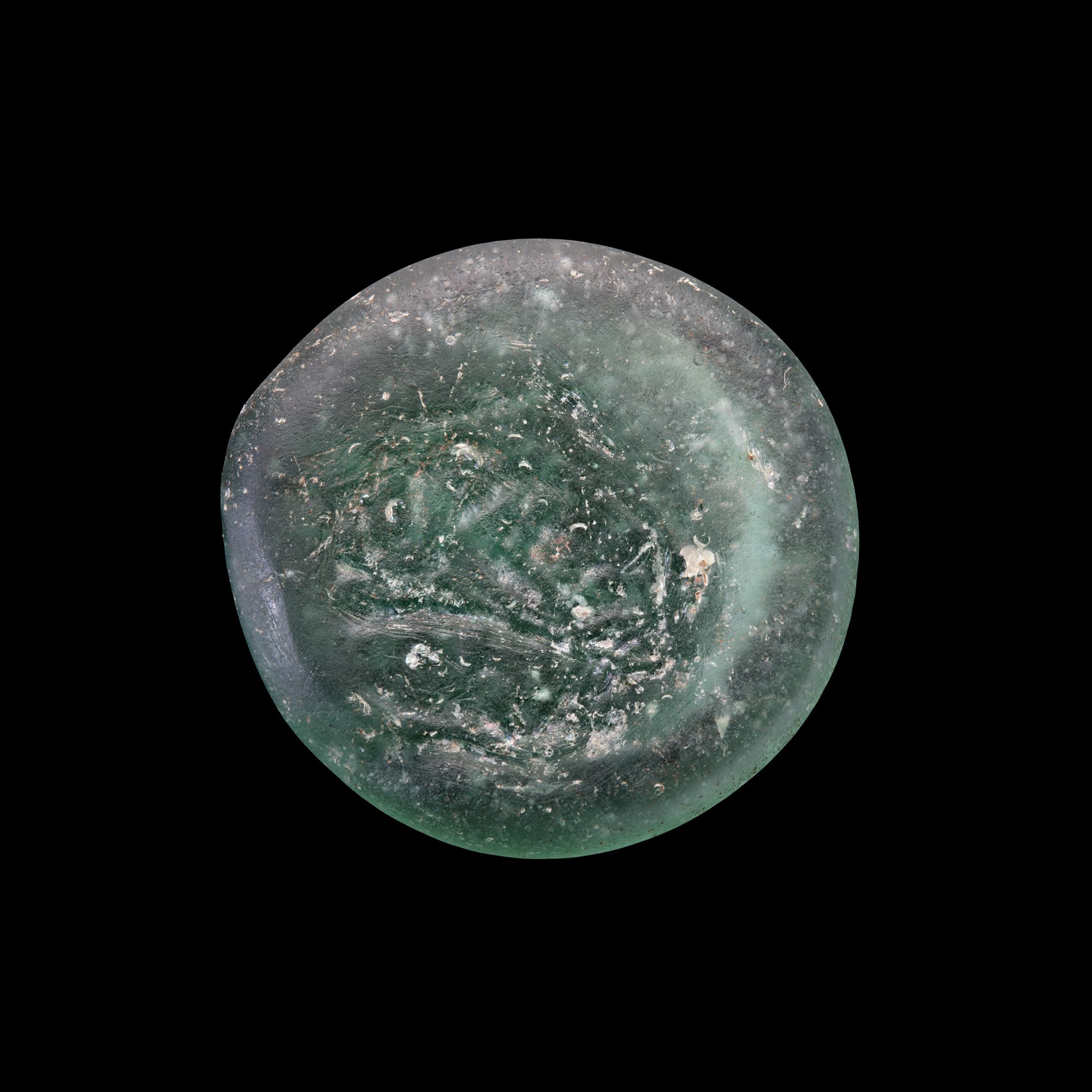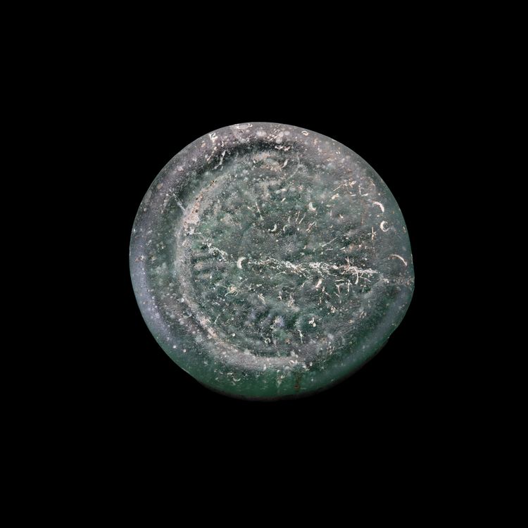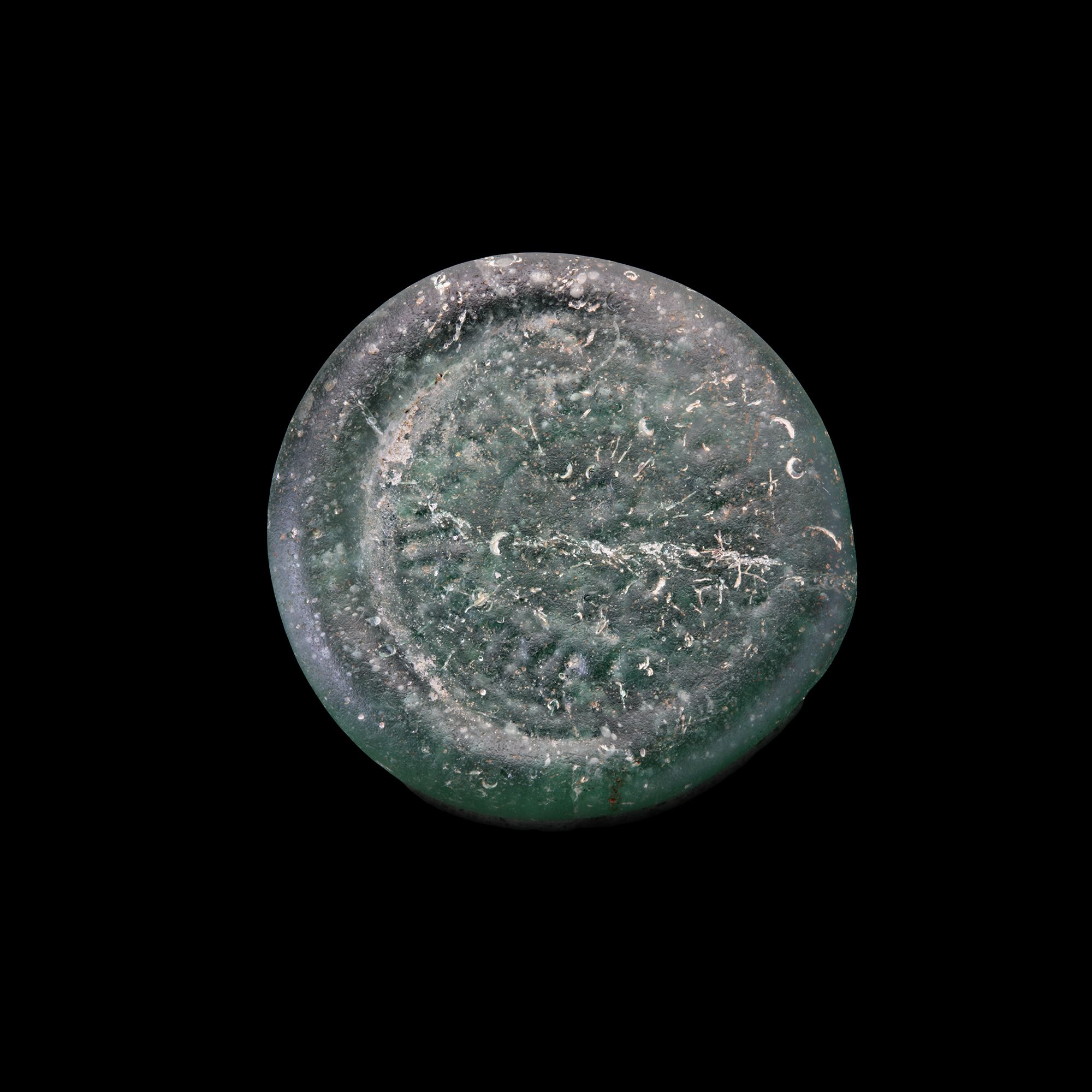 Glass weight, moulded and stamped, transparent dark-green in colour, citing in the centre with the name Amir al-Mu'mnin, surrounded by Al-Imam Ma'ad Abu Tamim al-Mustansir (427-487 AH/1036-1094 AD).