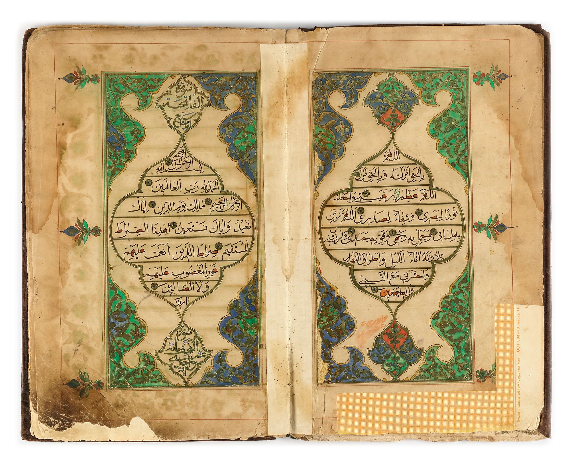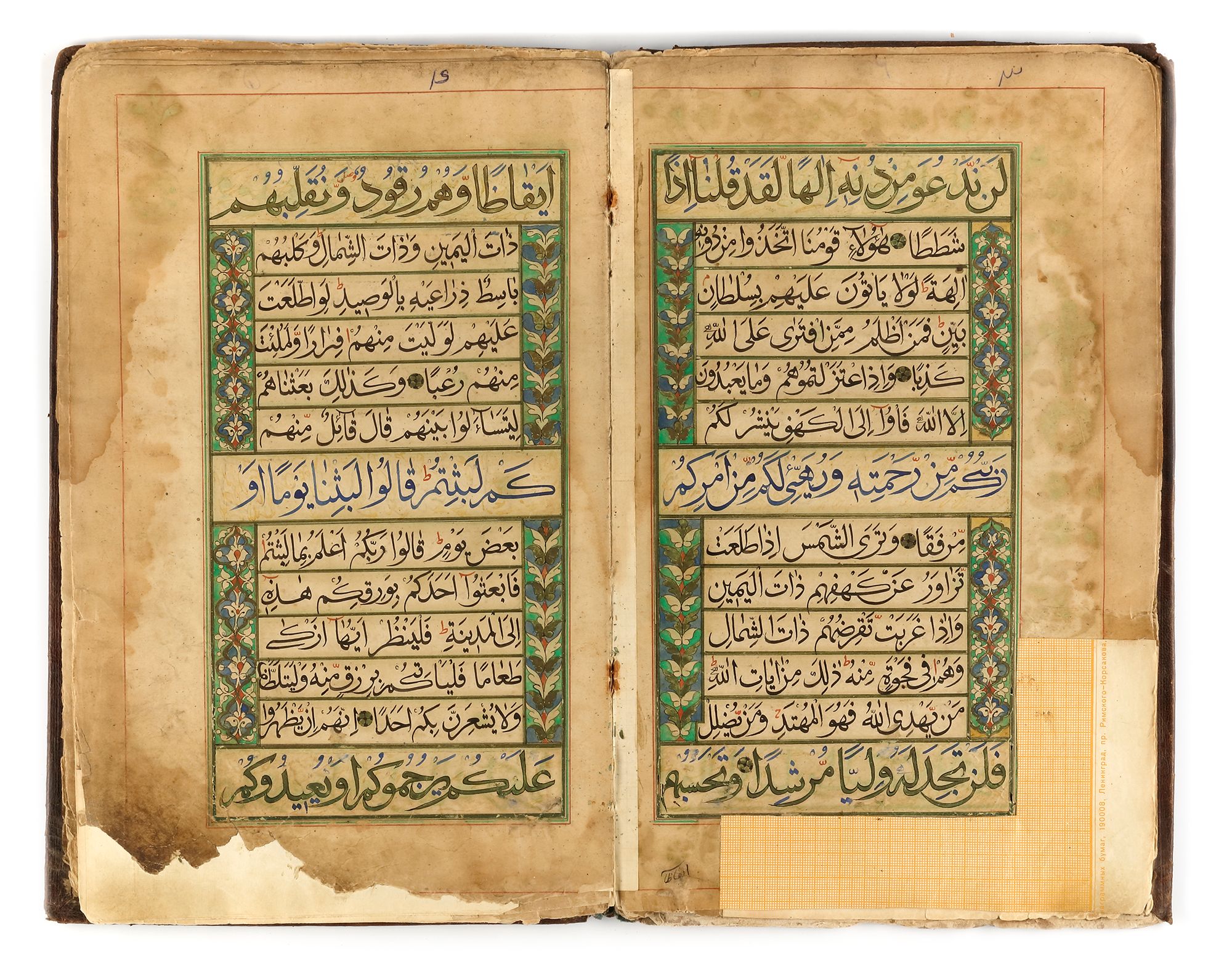 Arabic manuscript on paper, 15 leaves with 13 lines to each page. First, seventh and last line written in strong large thuluth blue and light green script on light yellow ground. The other 10 lines arranged in two blocks of 5 lines, each of elegant smaller black naskh script, polychrome roundel verse markers outlined in blue and pointed in blue, text ruled in polychrome floral decorated borders. The first page with floral polychrome decoration enclosing floral design containing seven lines of du'a and al-Fatiha. The last page with dua'a al-khatm and signed "written by al-hajj Ibn Khudr al-Kashani".