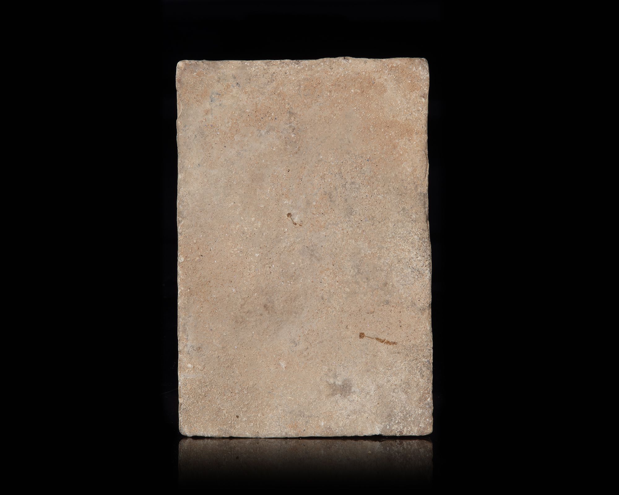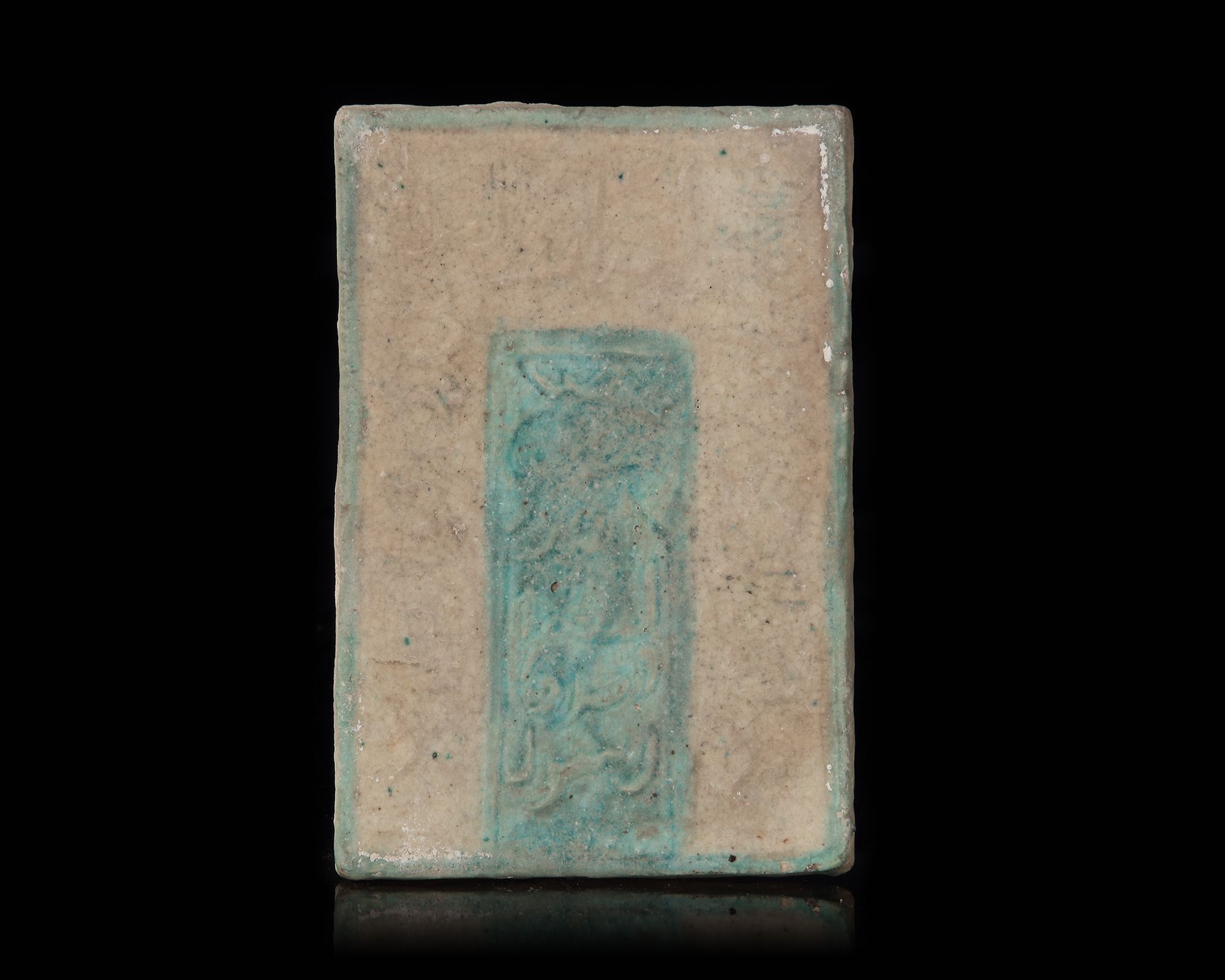 Of rectangular shape, decorated with a turquoise glazed mihrab shaped panel with an undeciphered Arabic calligraphy. 16.5 by 11 cm.