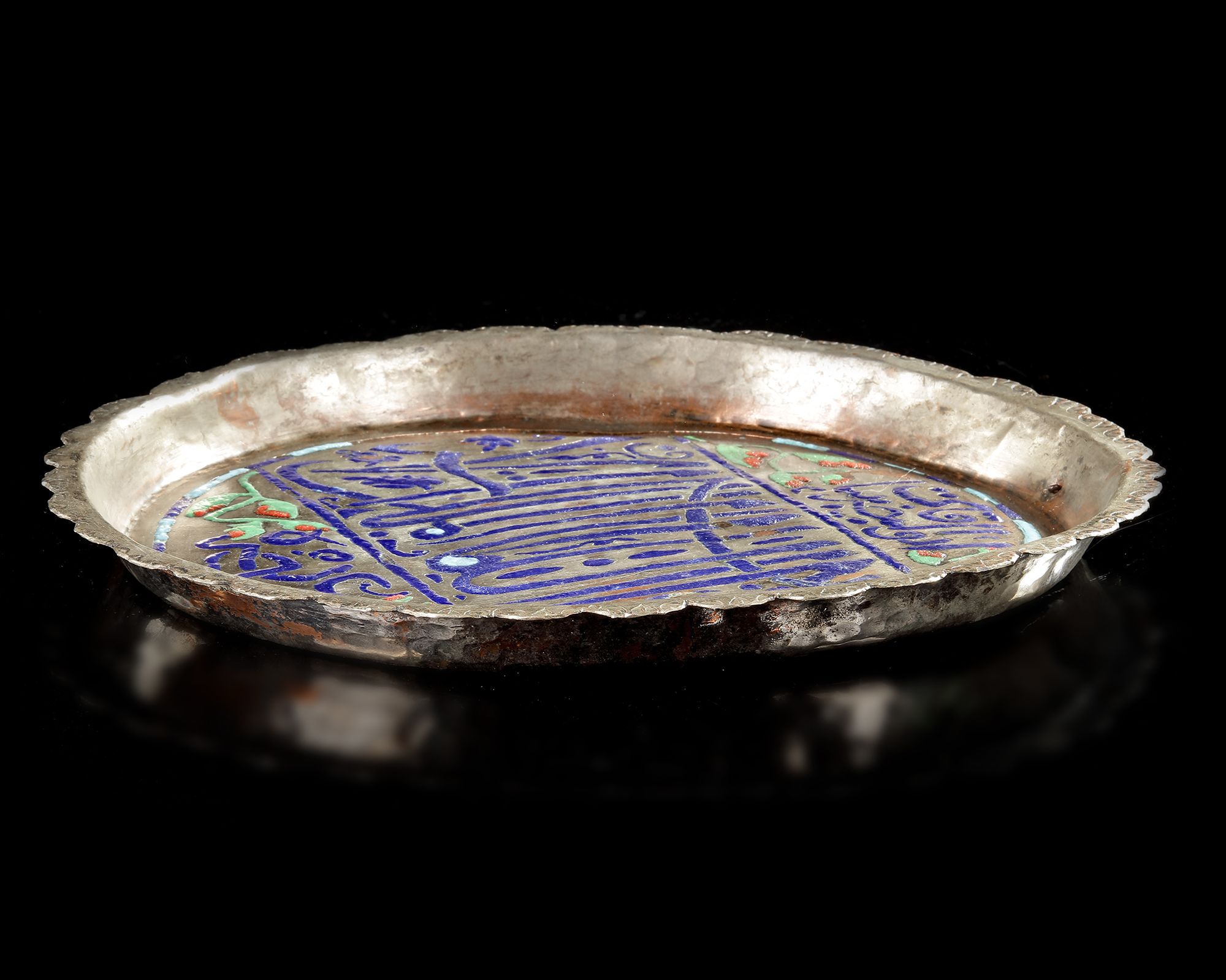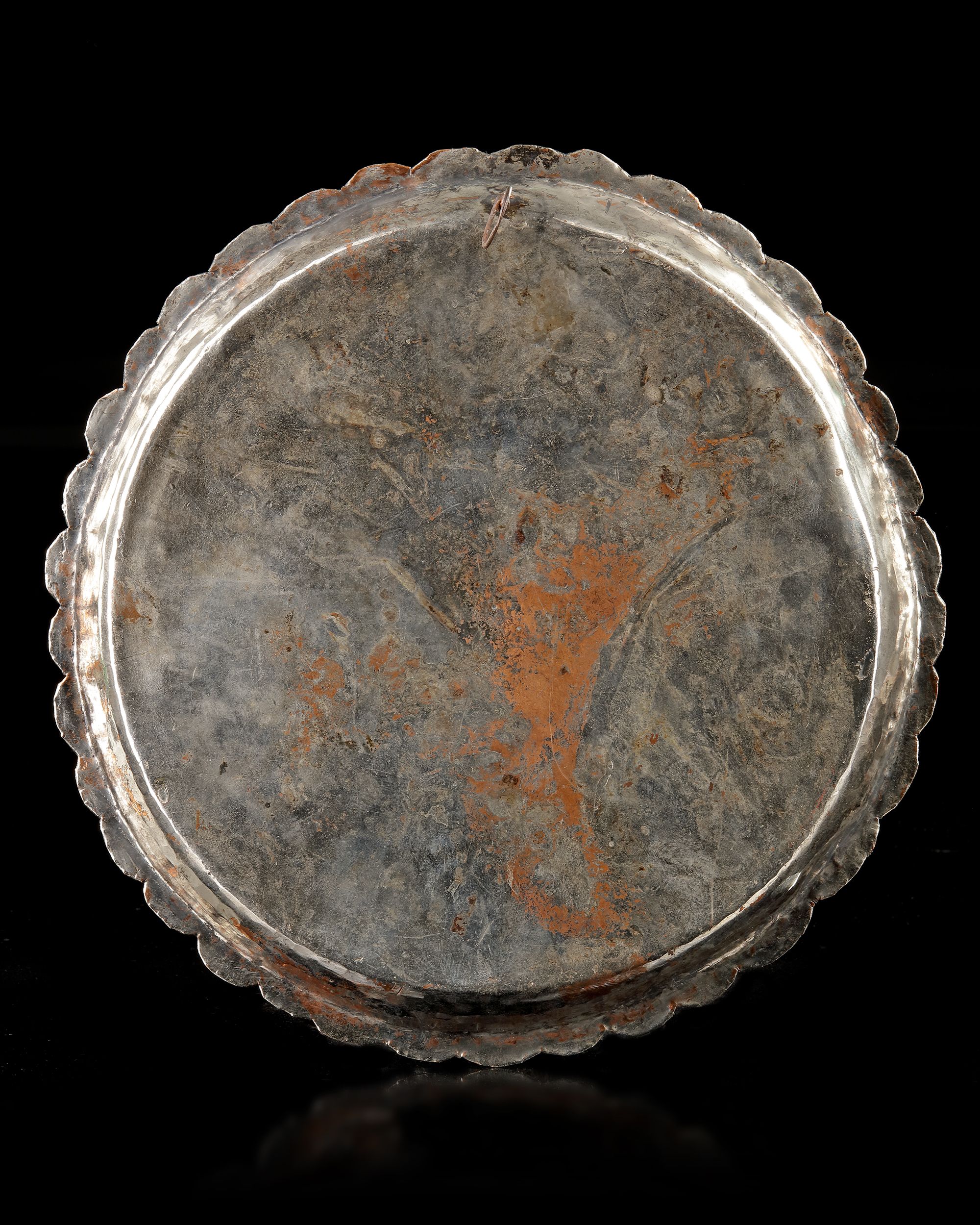 Inlay copper tray with everted rim and barbed rim, inscribed with a central roundel in large Thuluth inscriptions.