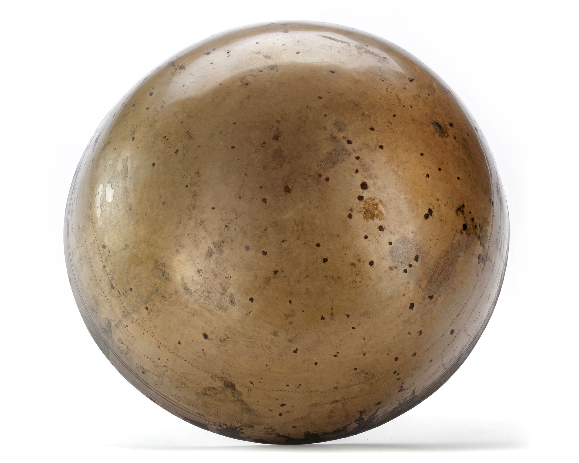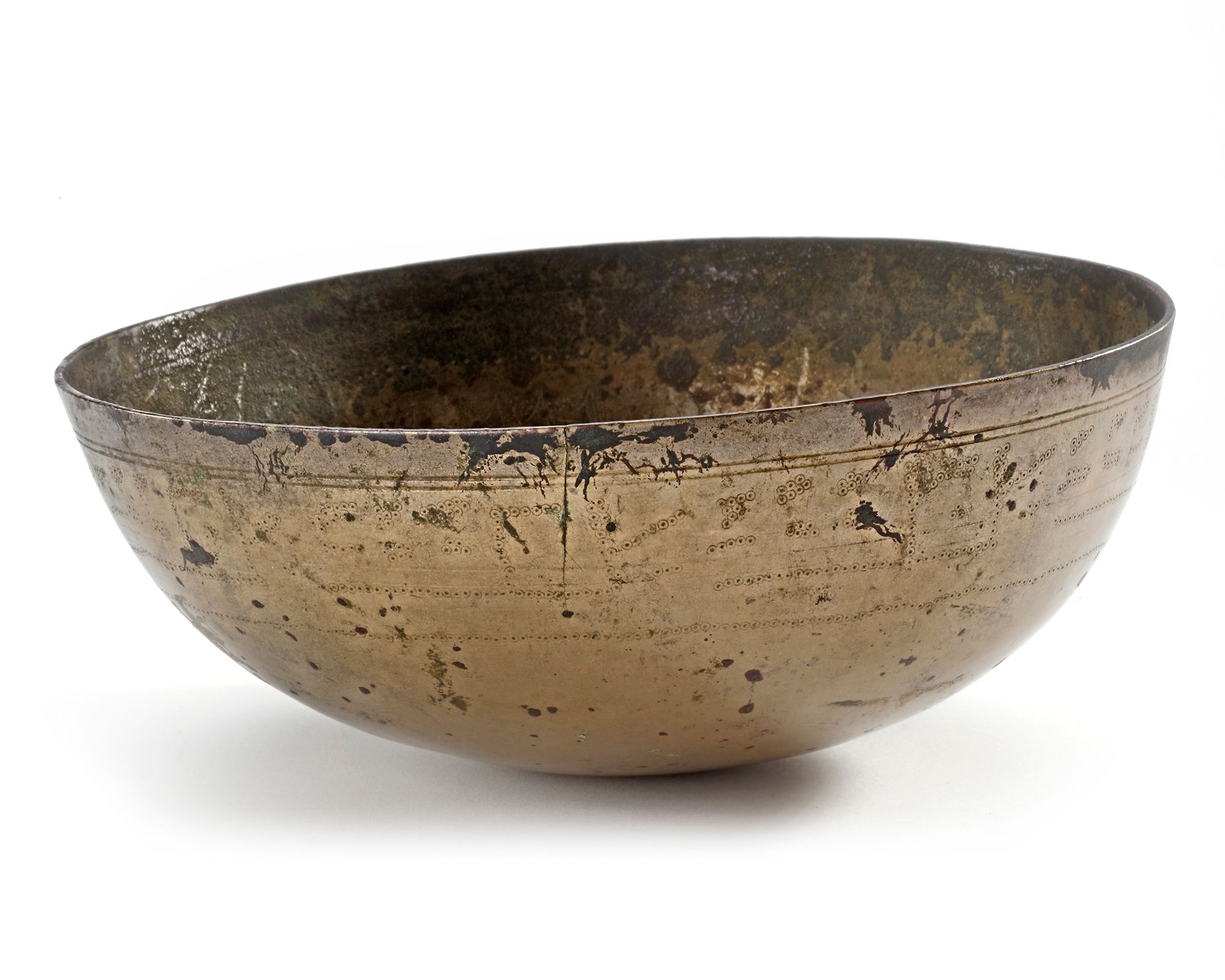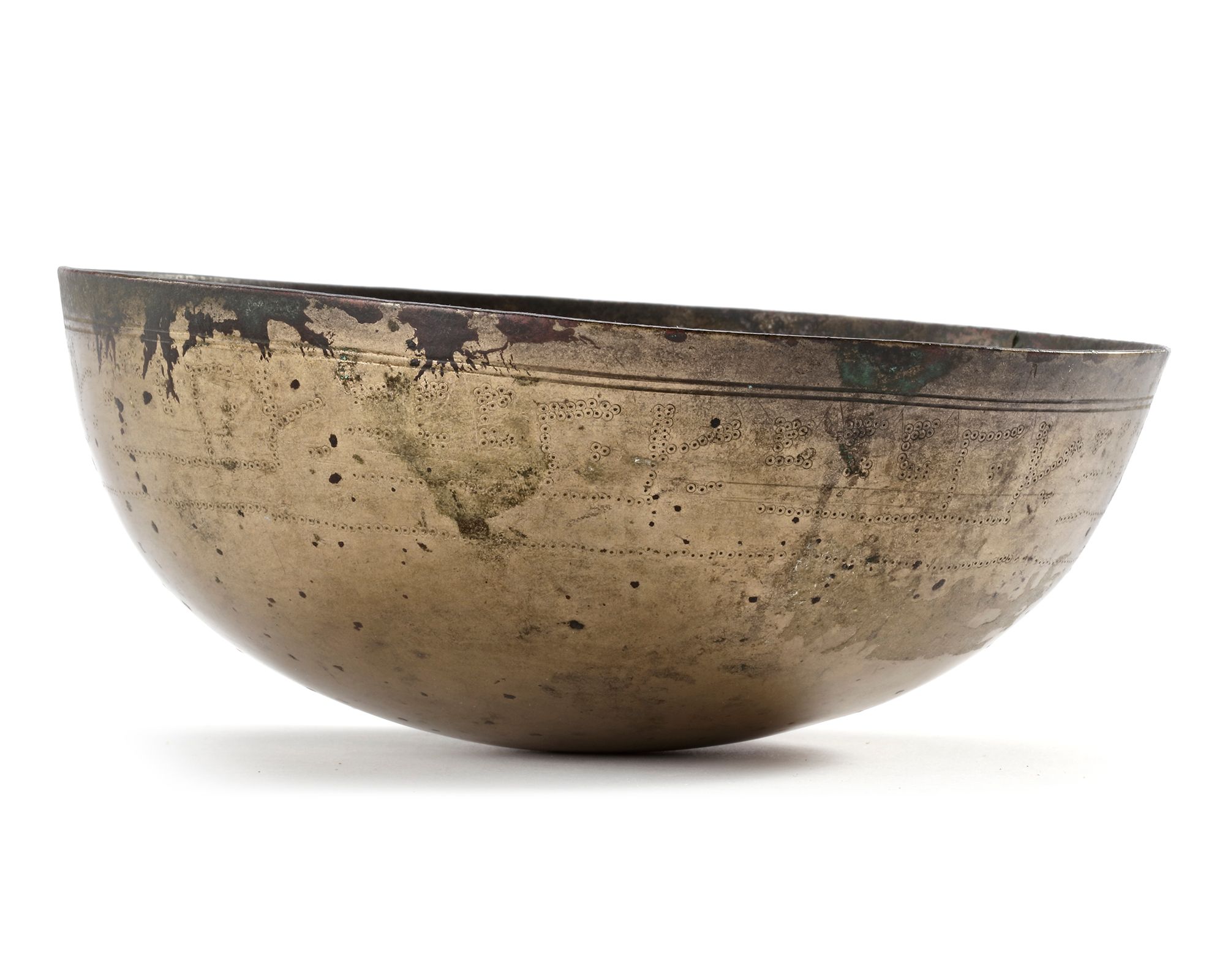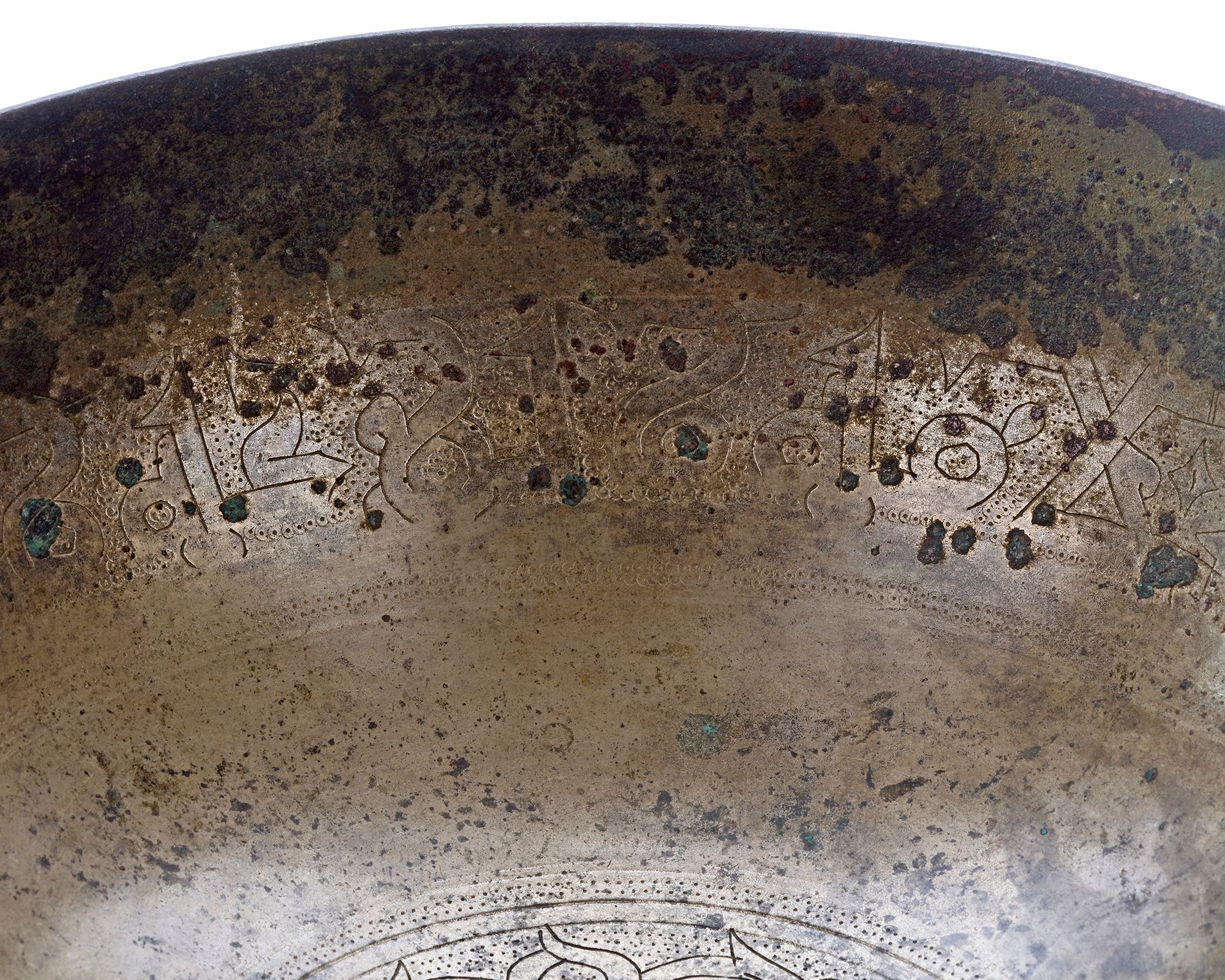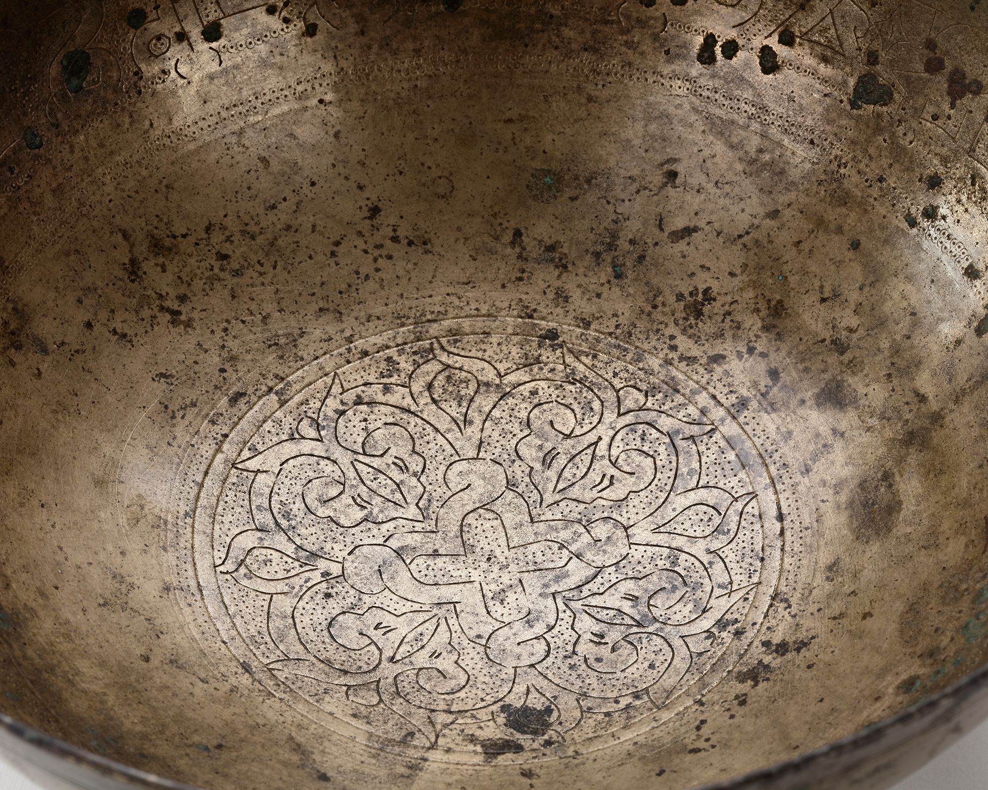 Of deep form with curved edges, engraved to the interior with a central floral leafy roundel, the rim a band of angular Kufic inscription.