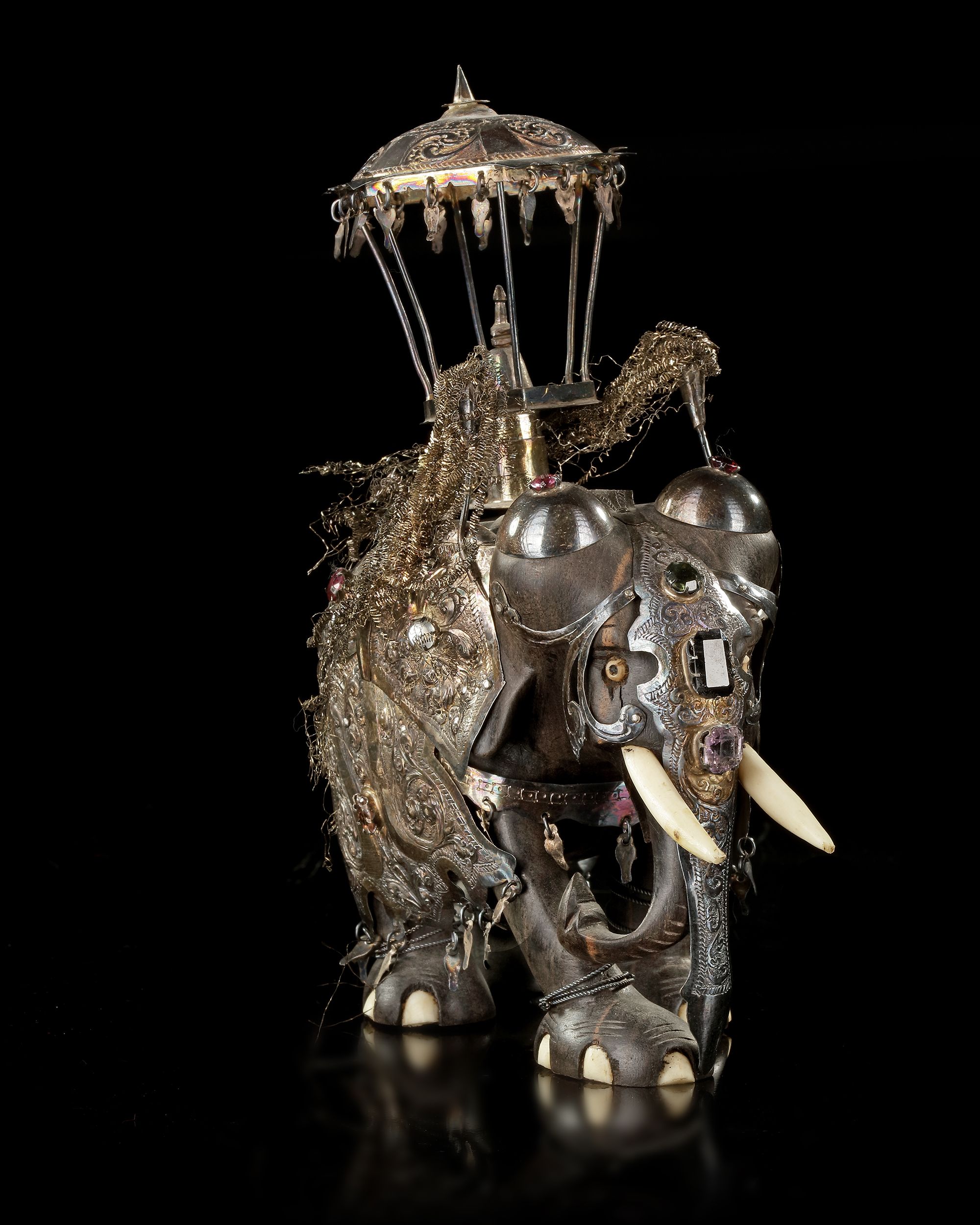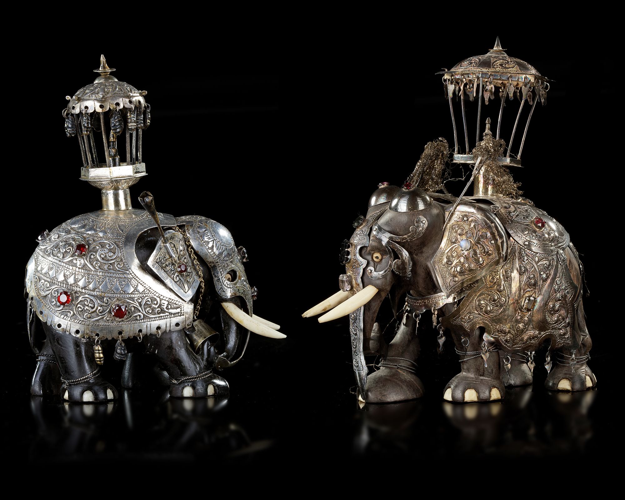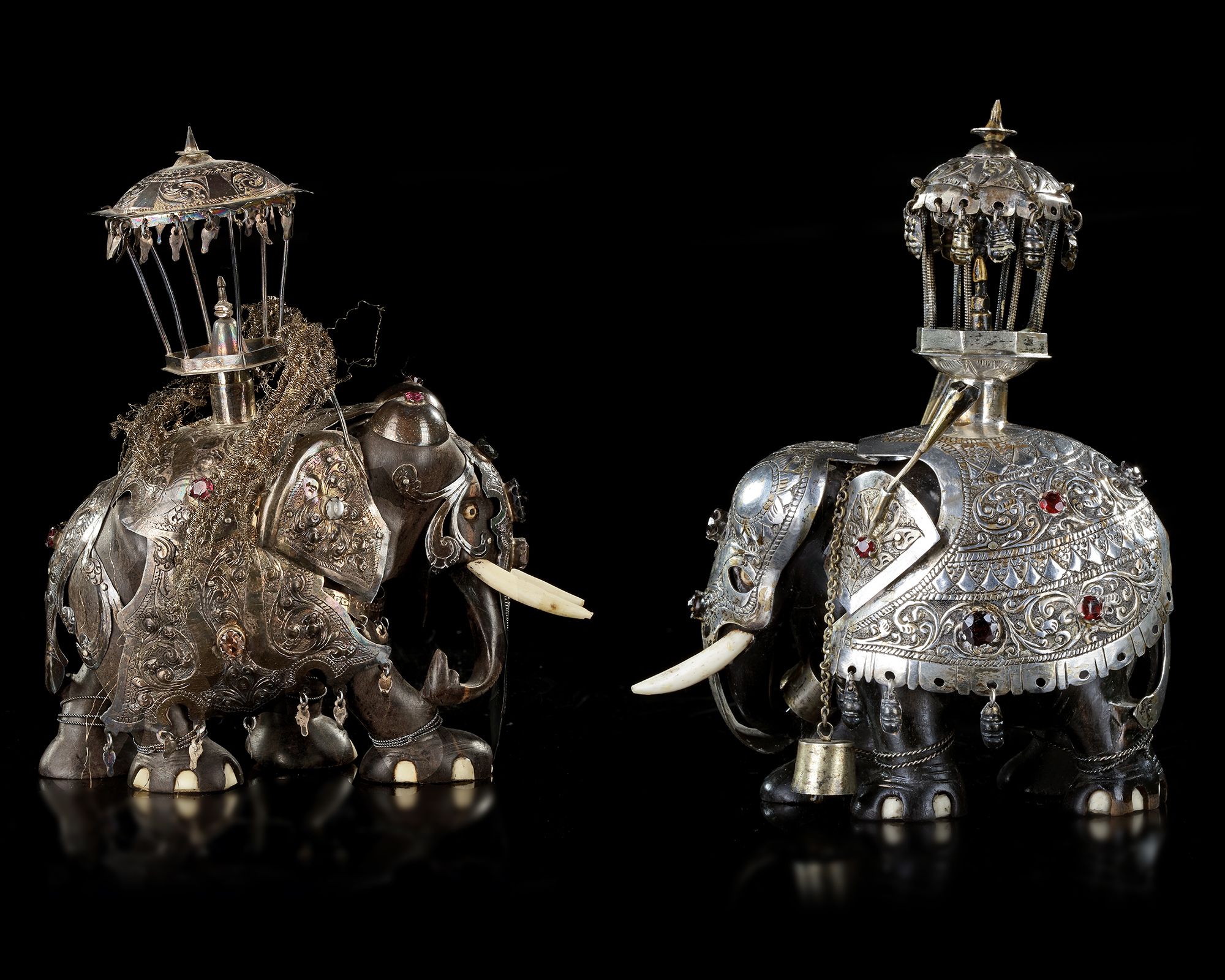Depicting two carved ebony wooden elephants covered with sterling silver and multi colored precious gems and pre-ban-ivory tusks and toe nails. This elephant is clothed for the Kandy Perahera Festival in Kandy, Sri Lanka.