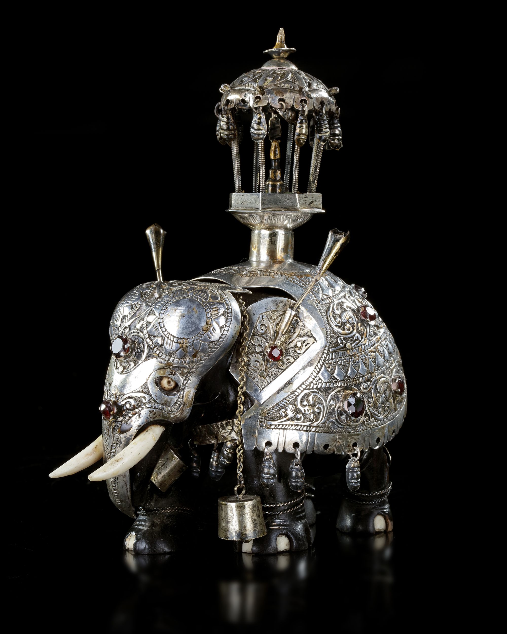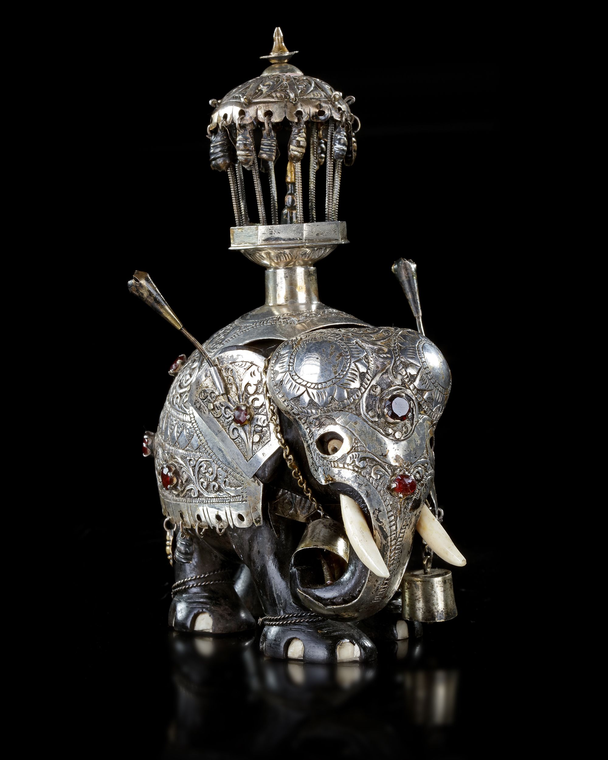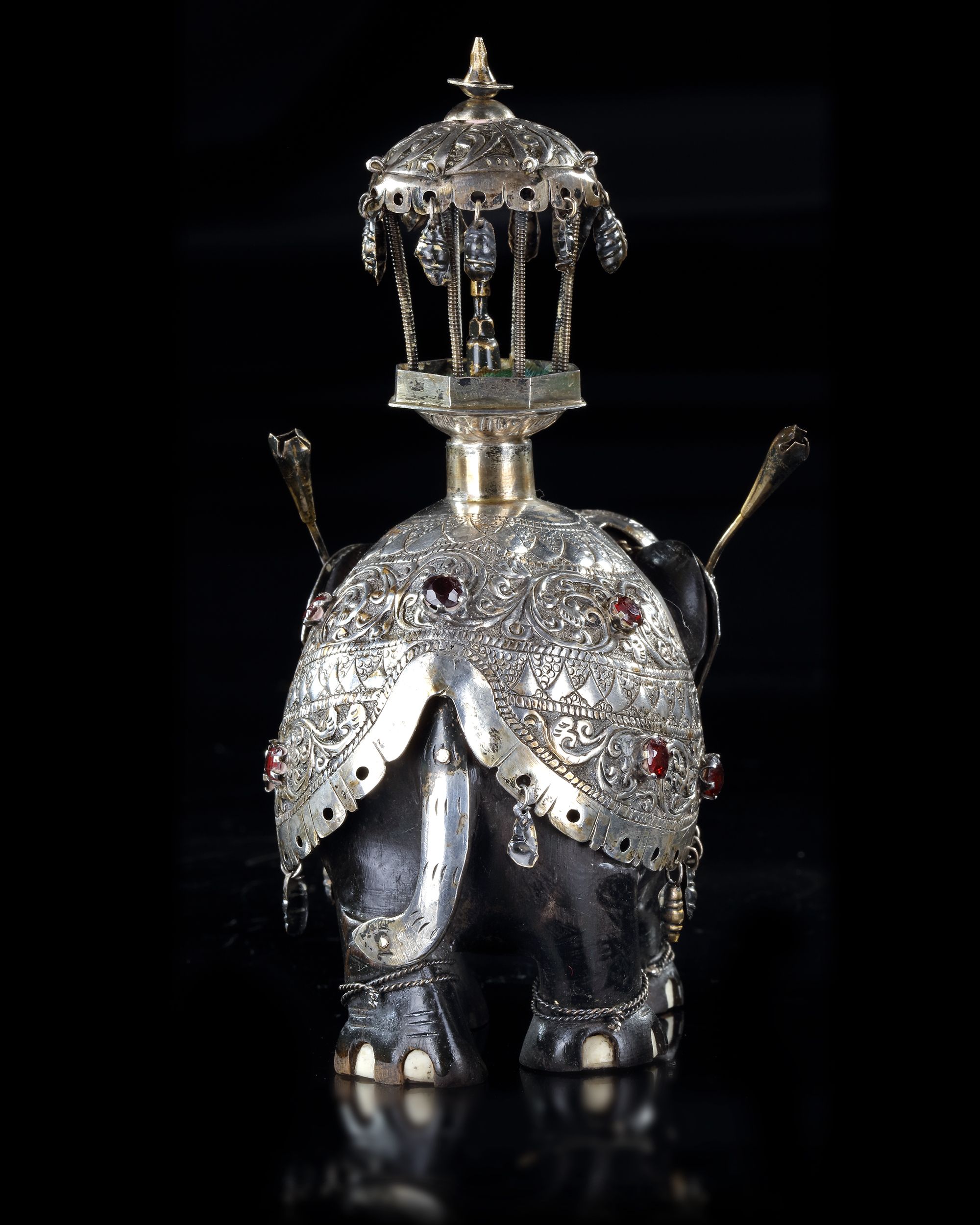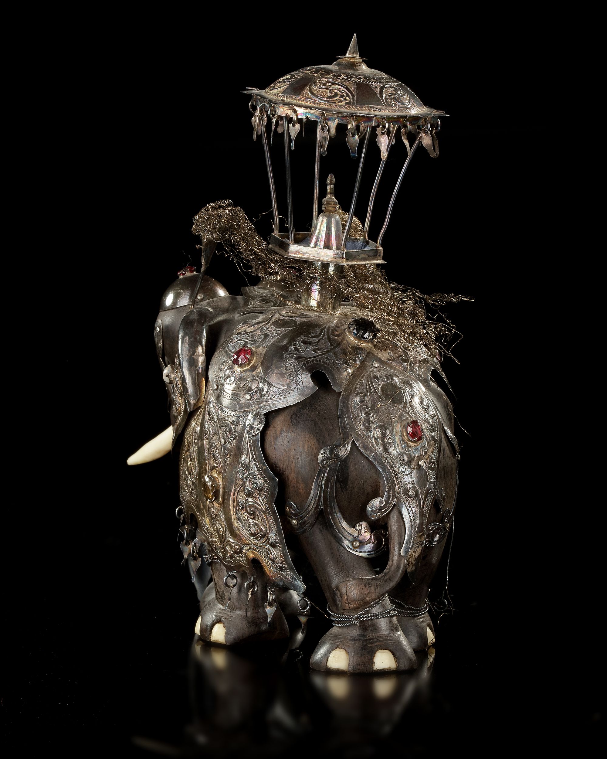 Depicting two carved ebony wooden elephants covered with sterling silver and multi colored precious gems and pre-ban-ivory tusks and toe nails. This elephant is clothed for the Kandy Perahera Festival in Kandy, Sri Lanka.