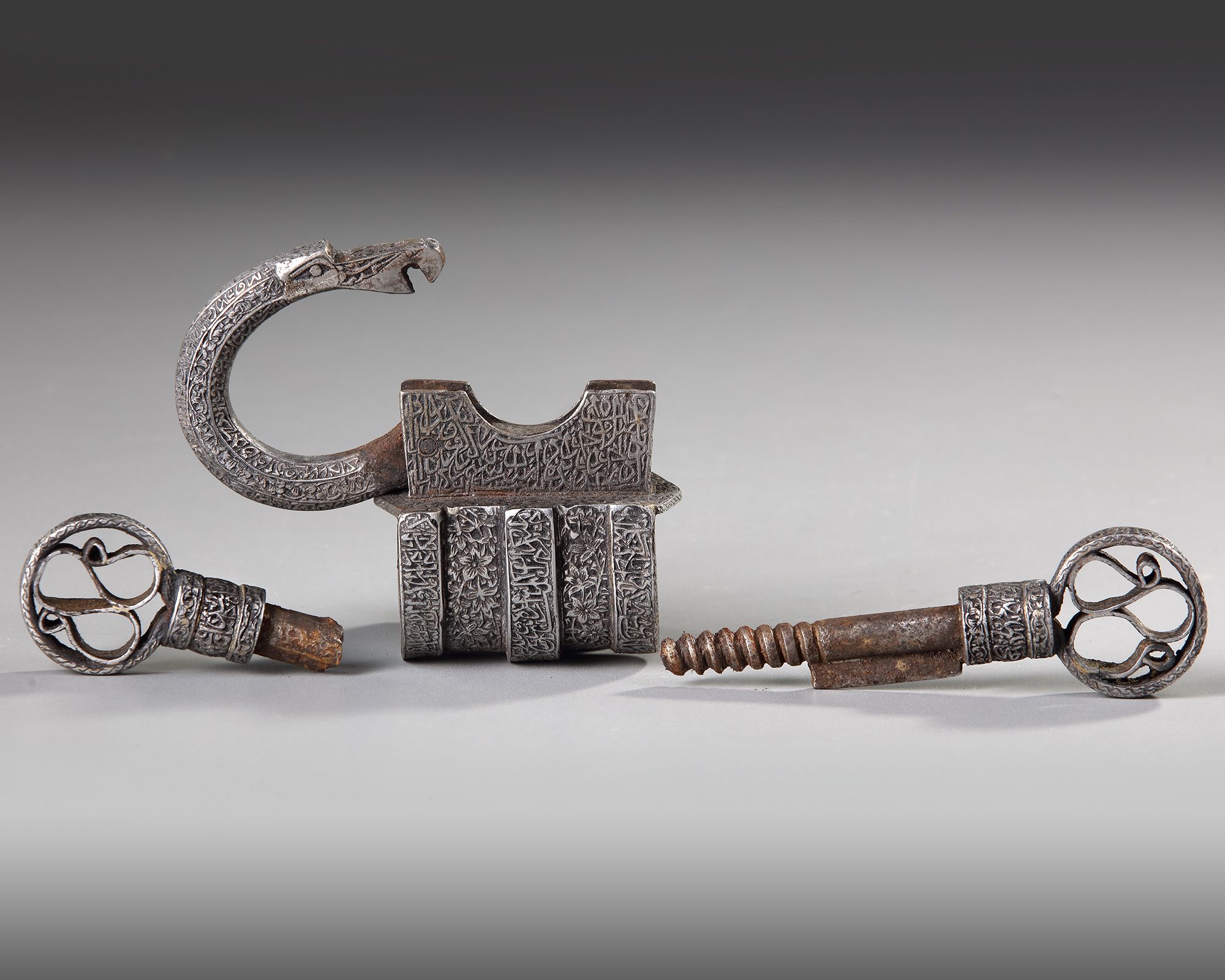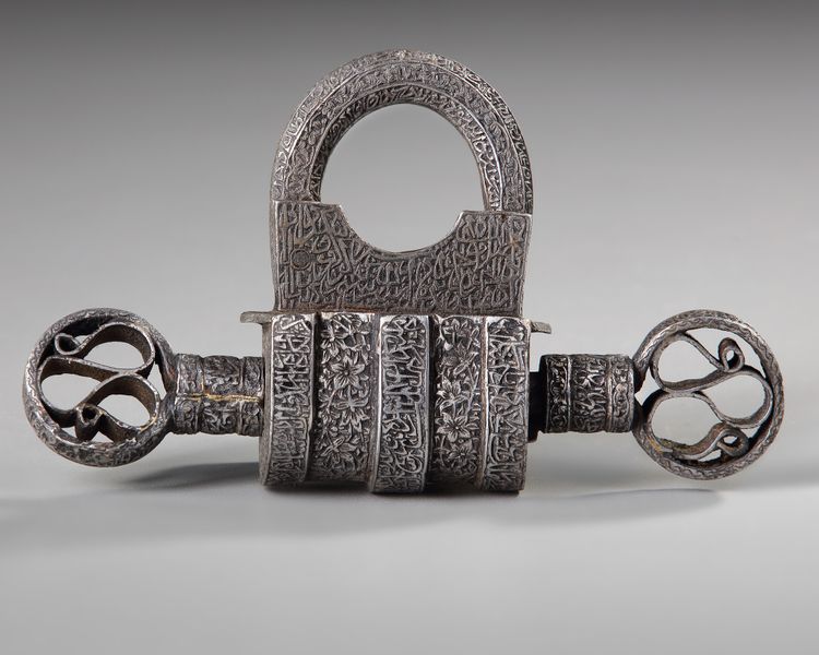 A metal lock and key inlaid excessively in silver with inscriptions of different Quran verses in thuluth script.