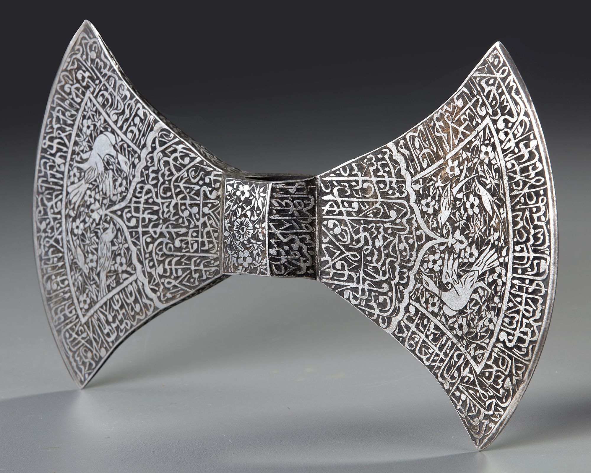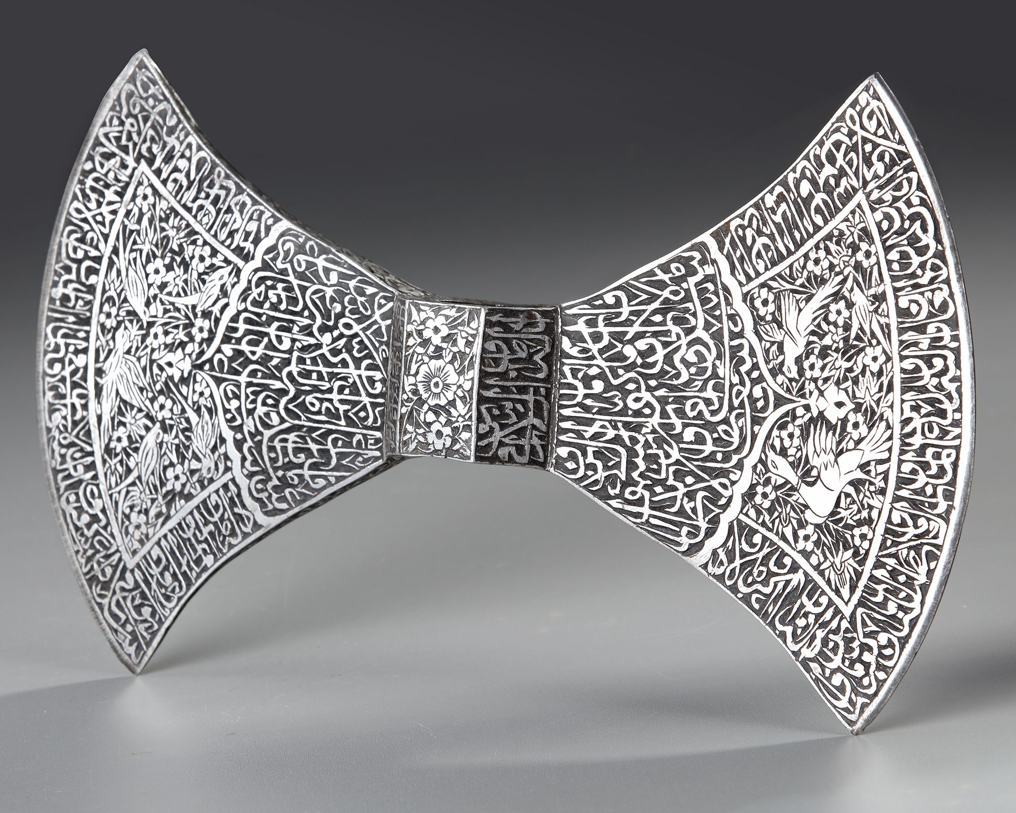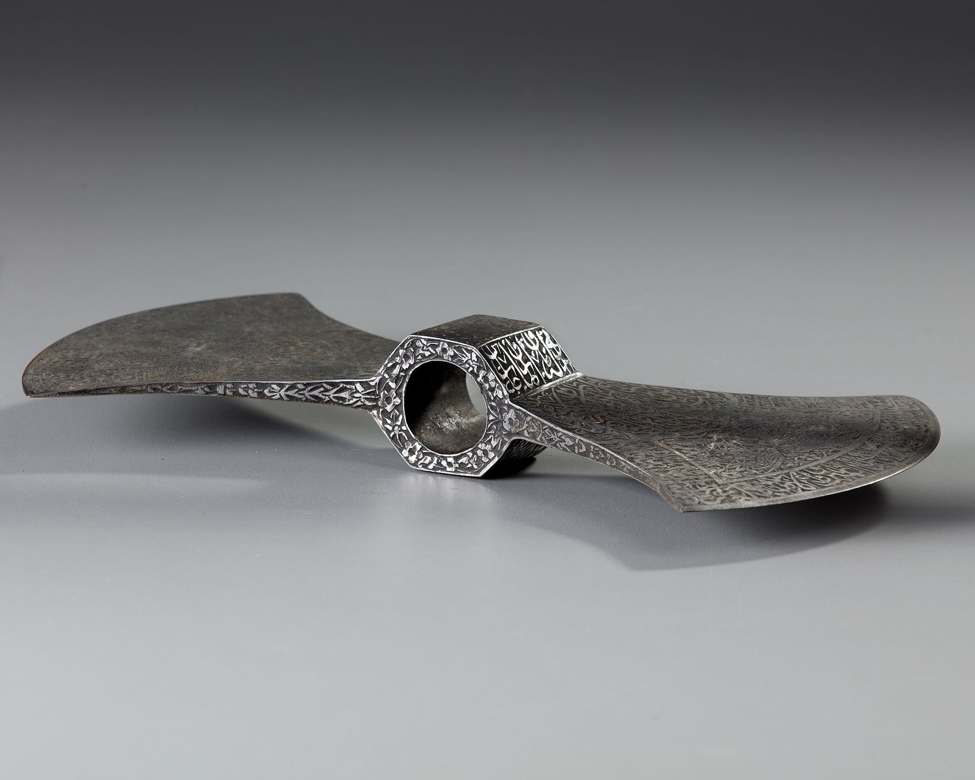 The watered-steel double headed axe, inlaid excessively in silver with inscriptions of different Quran verses in thuluth script.