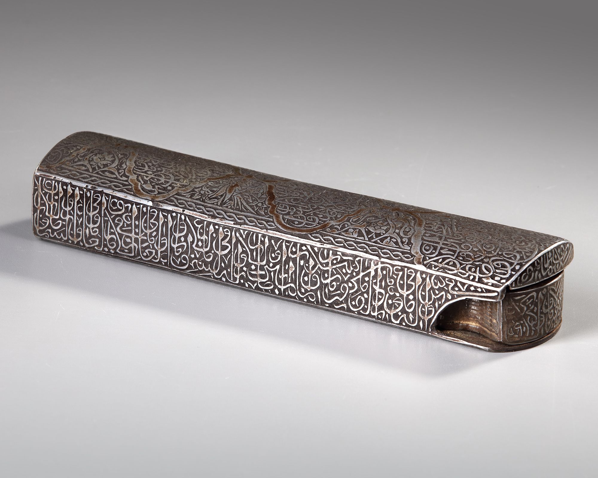 A metal pen box of typical elongated form with rounded ends and sliding tray, inlaid excessively in silver with inscriptions of different Quran verses in thuluth script.