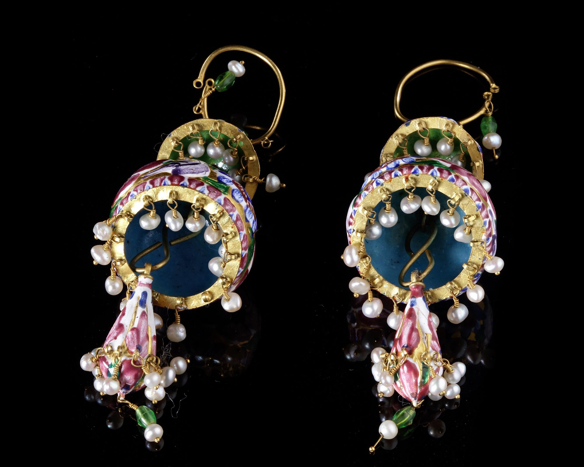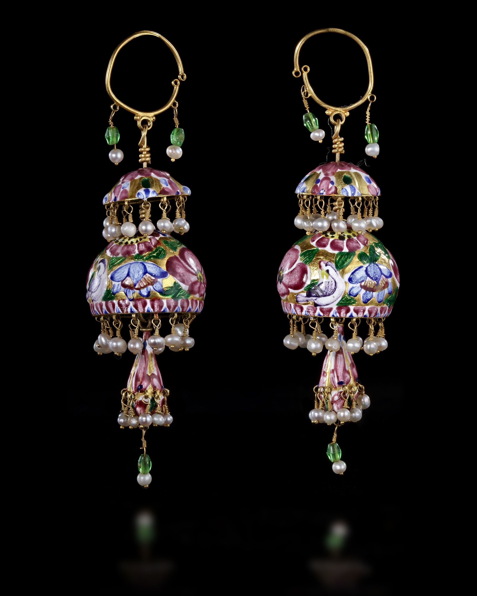 Each with an upper gadrooned shallow domed section above a larger well rounded domed element above a lower bell-shaped pendant, the main central element with polychrome enamelled flowering sprays above a band of stylised floral motifs, the upper section with similar simpler motifs to each gadroon, the pendant with flowerheads within rectangular panels, a band of pendant pearls around the lower level of each element, the lower elements with further hanging gold leaf motifs, wire loop above.