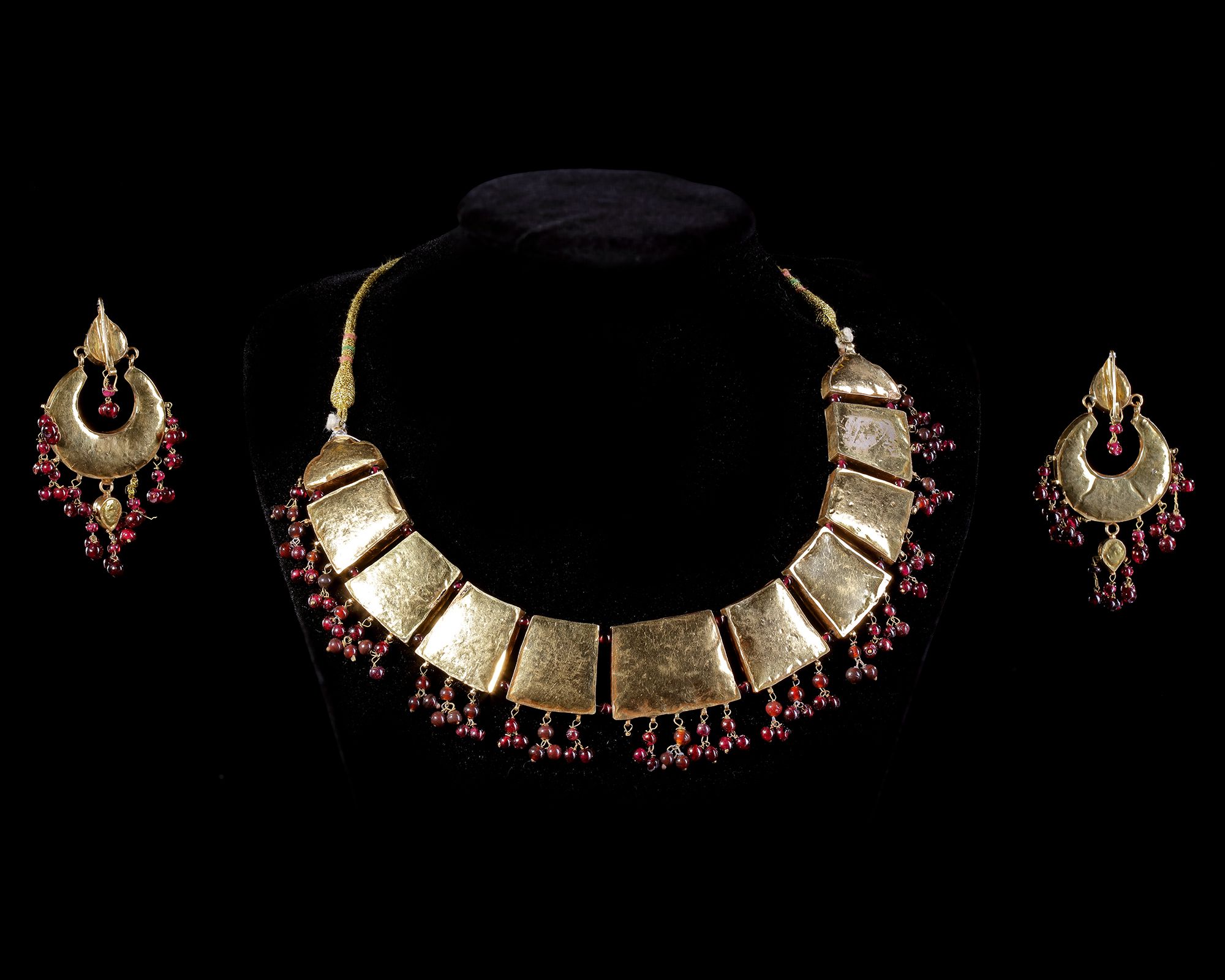 A MUGHAL GEM-SET GOLD NECKLACE, TWO EARRINGS AND A RING,19TH CENTURY