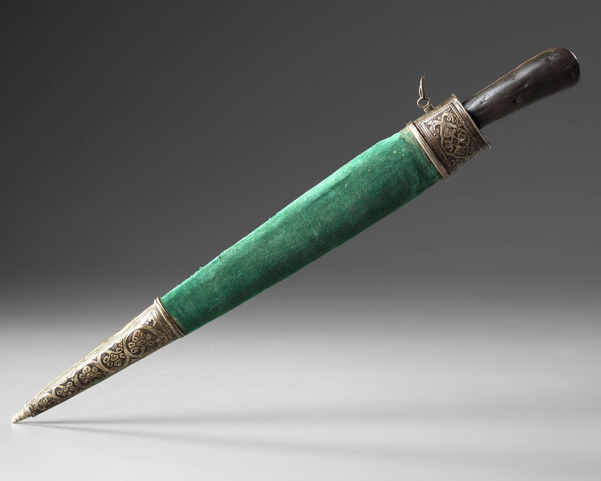 The scabbard with silver chape and throat fitting.