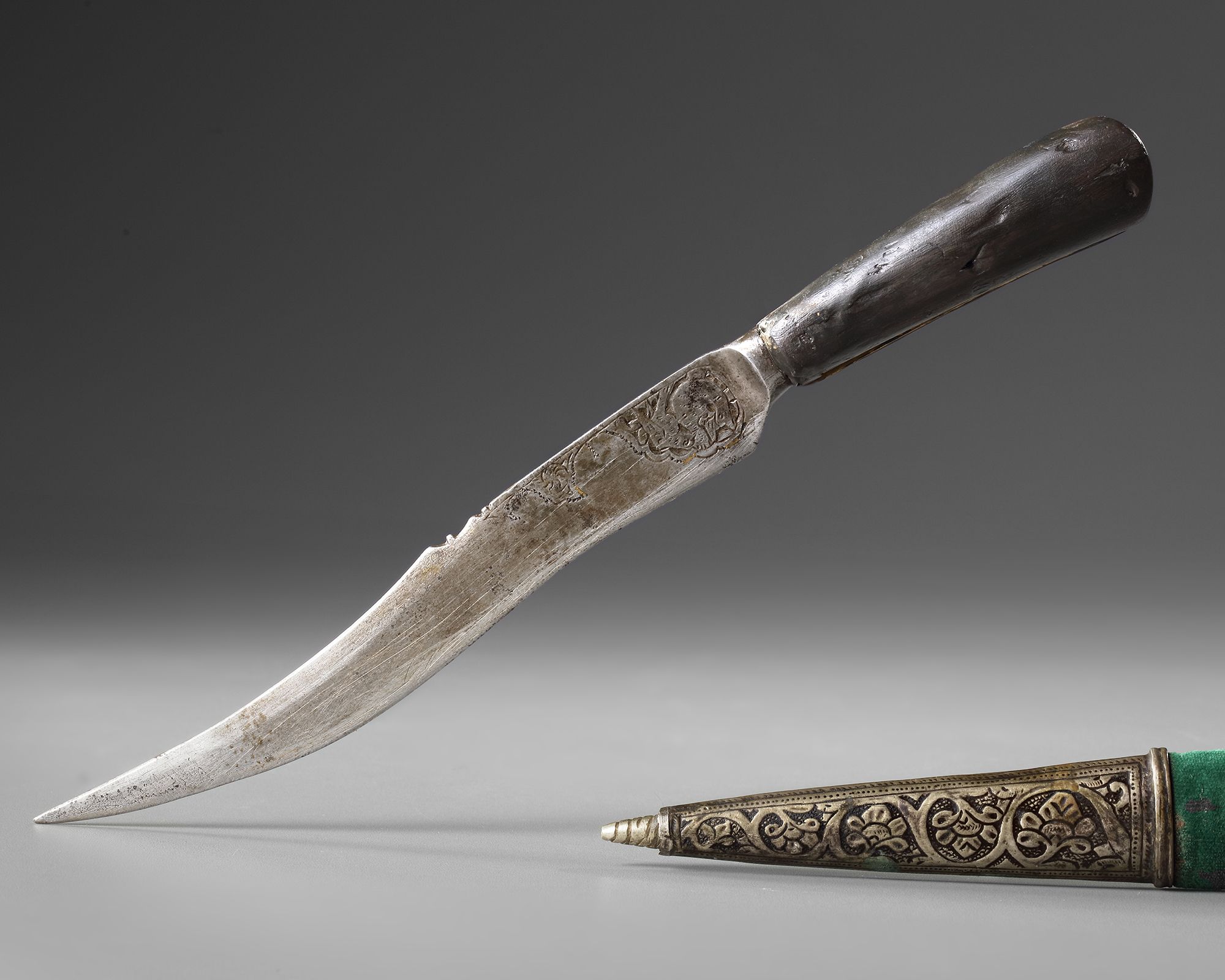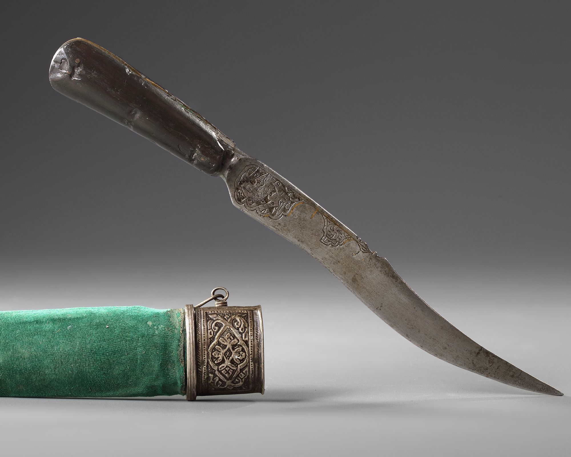 The tapering gently curving single-edged blade decorated at the forte with engraved birds, the handle engraved with" Ya Hannan, Ya Mannan", with traces of gilding.