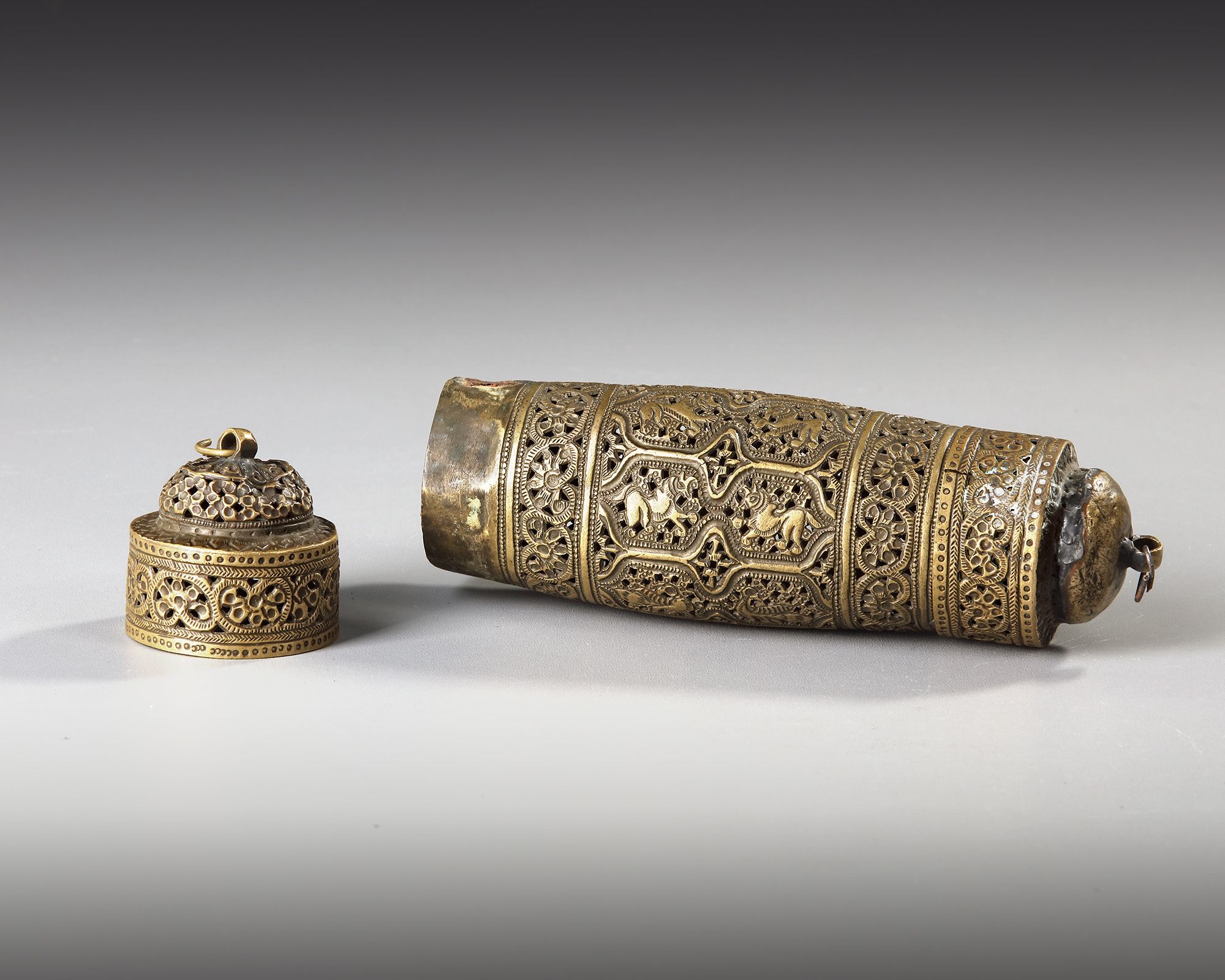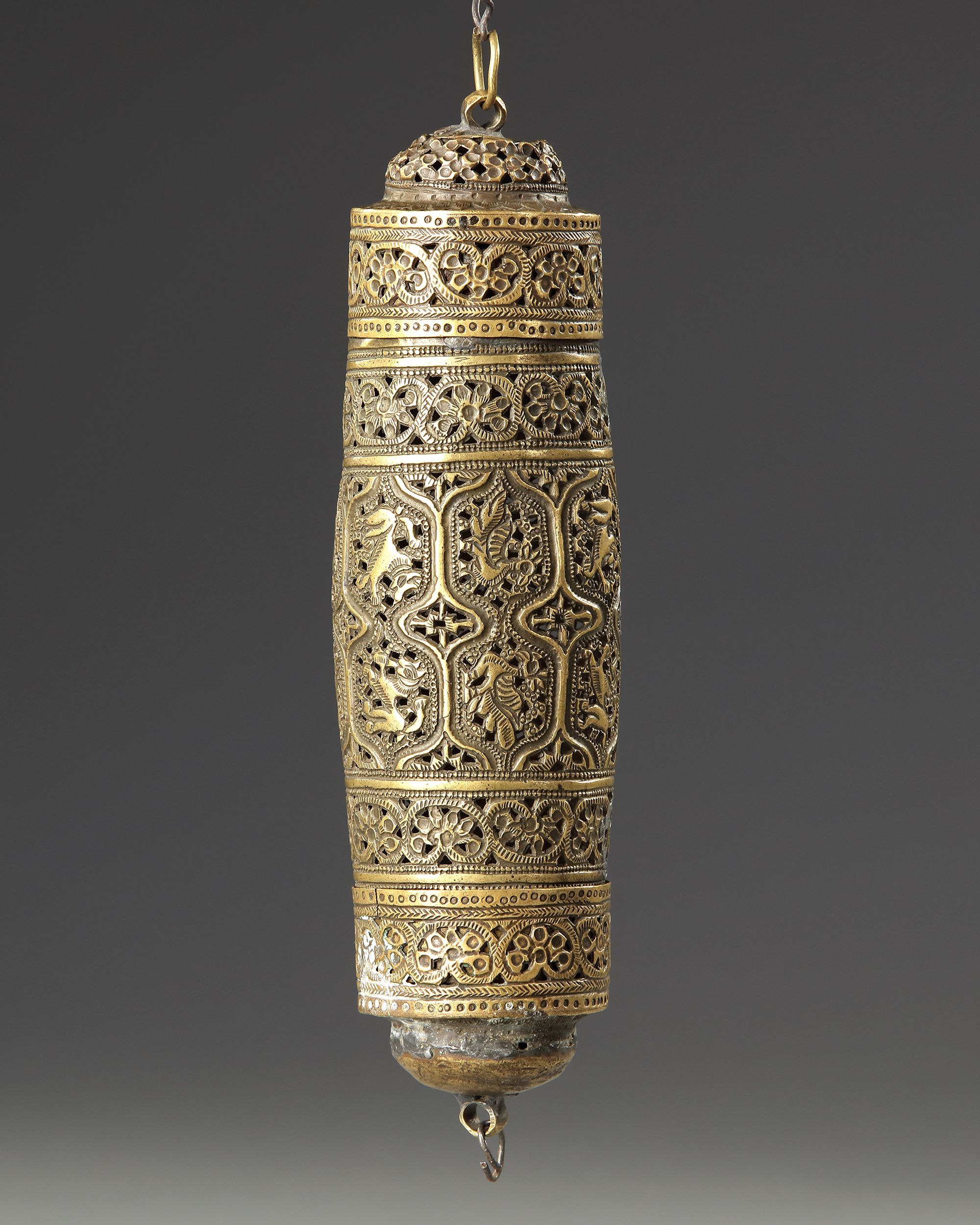 A brass scroll holder pierced with panels enclosing animals and floral sprays. 17 cm