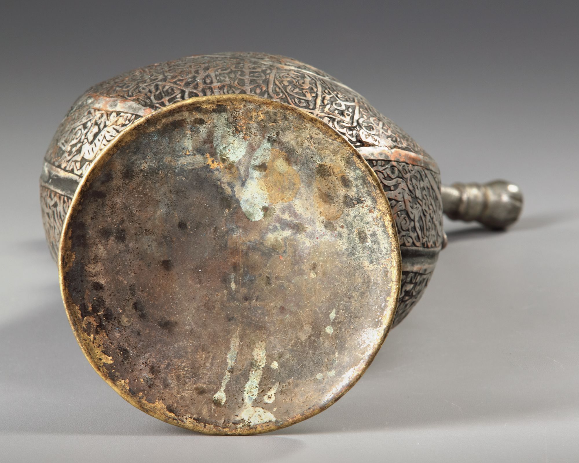 Of piriform with flaring neck and resting on a spreading foot, engraved on both sides excessively with a central cartouche enclosing floral scrolls, surrounded with inscriptions of Ayat al-Kursi in thuluth script.
