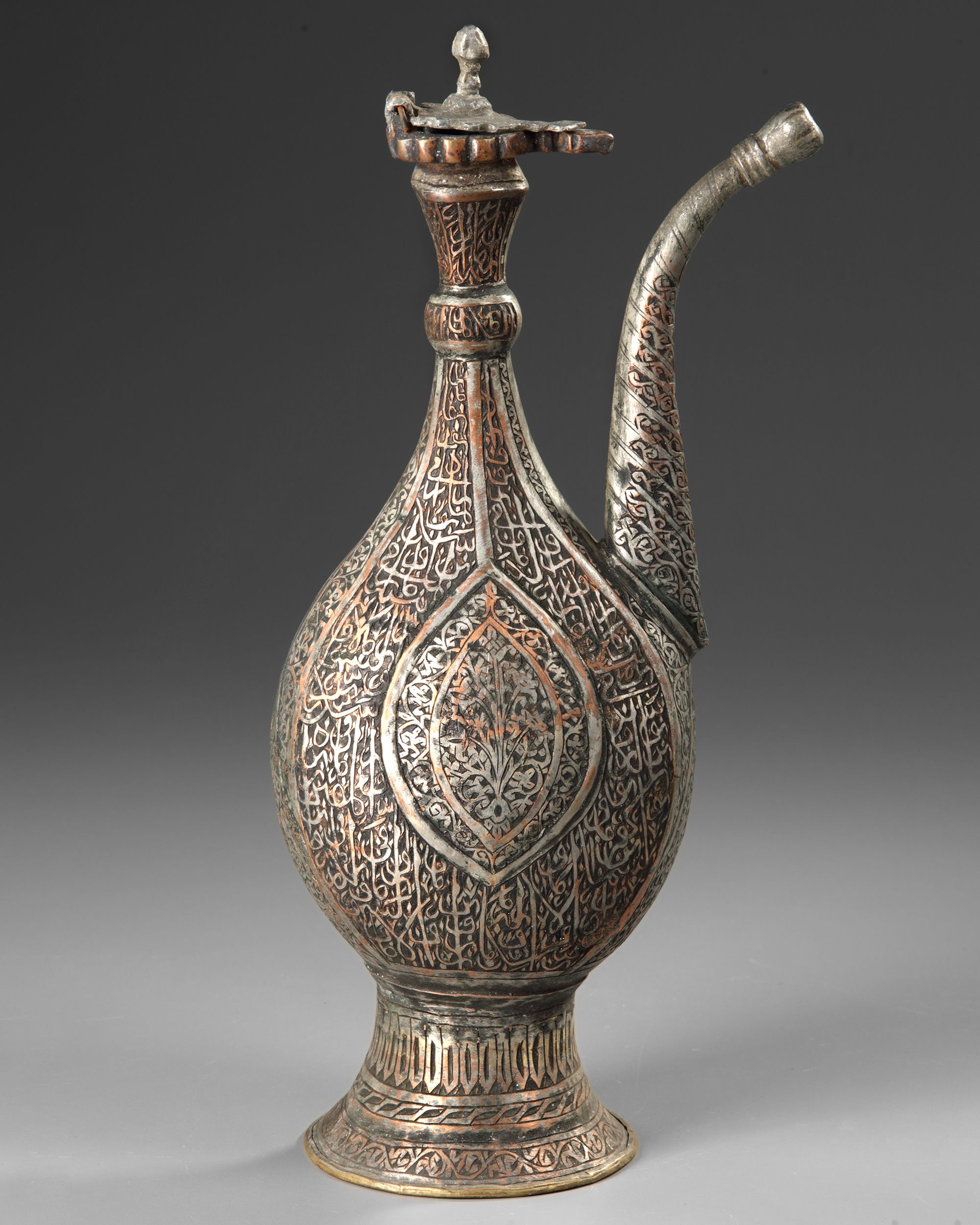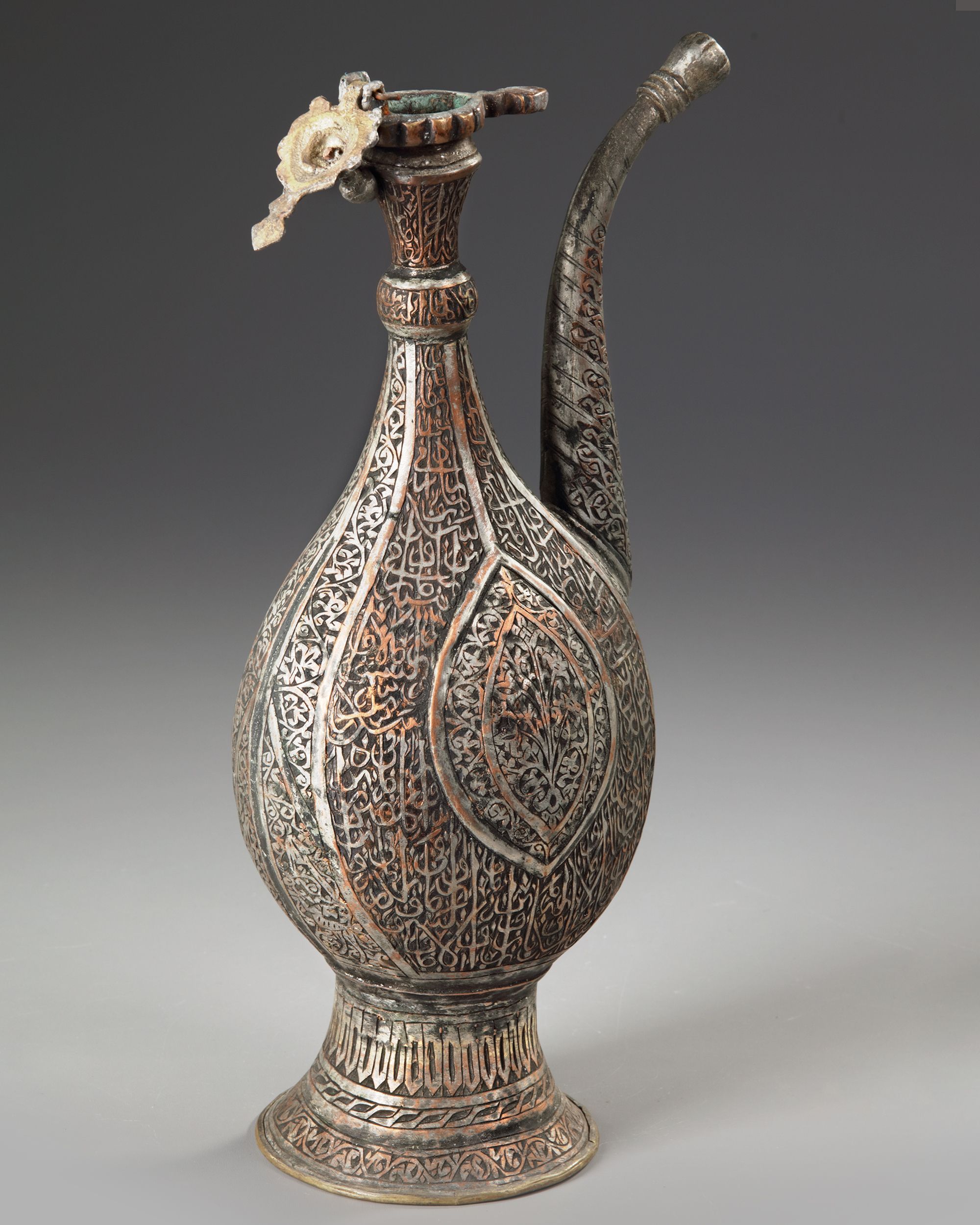 A COPPER INLAID ENGRAVED METAL EWER, 19TH-20TH CENTURY