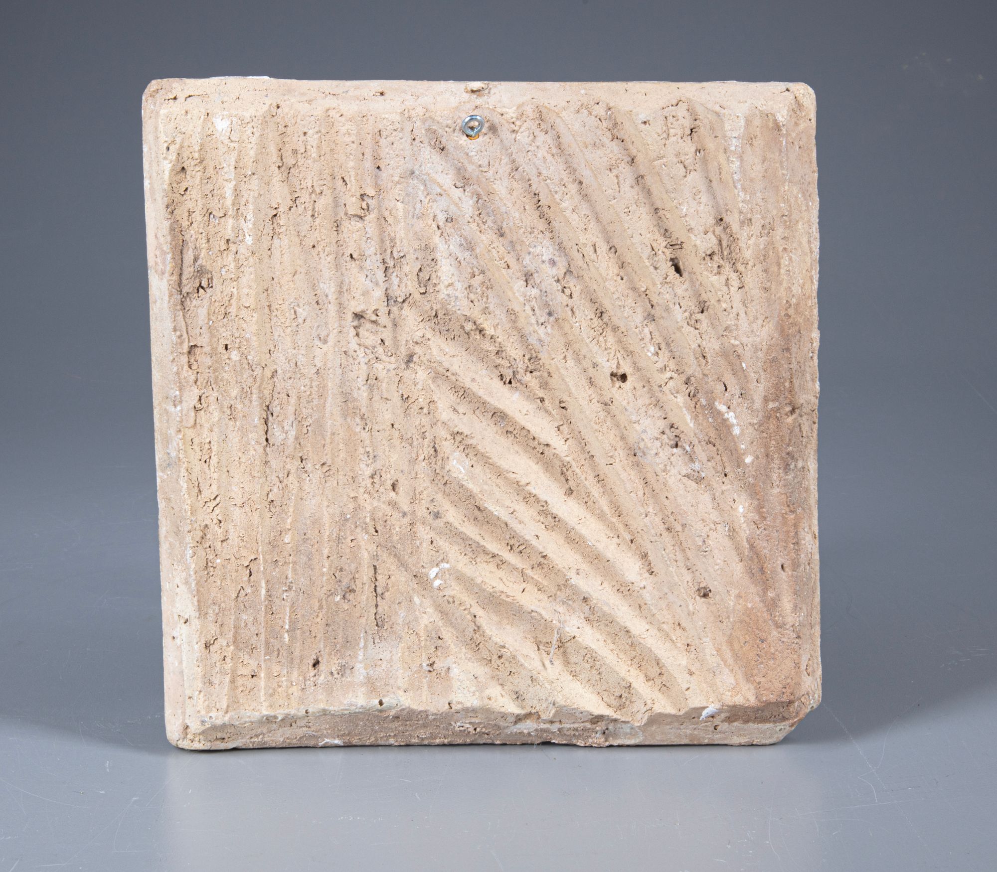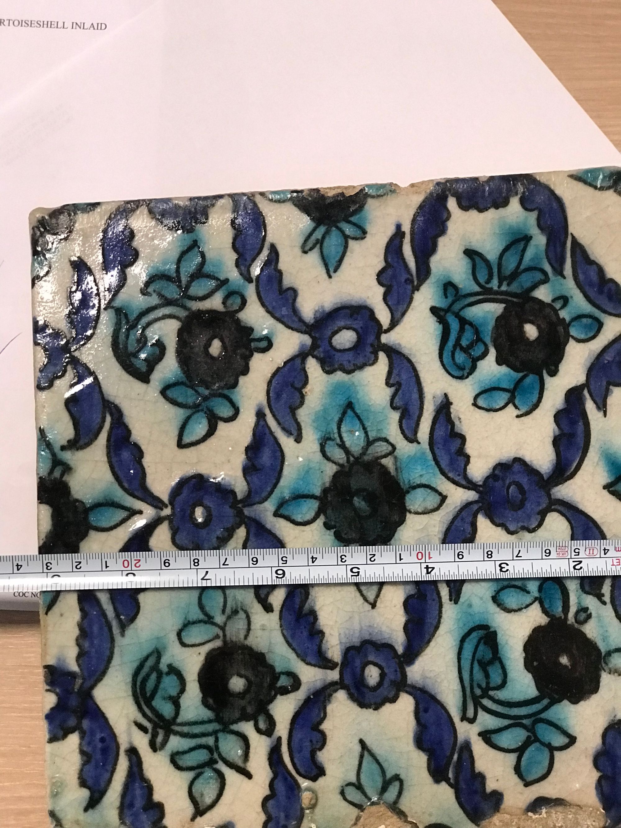 Decorated in blue, turquoise and black with flower heads amongst leaves. 23 by 23 cm.