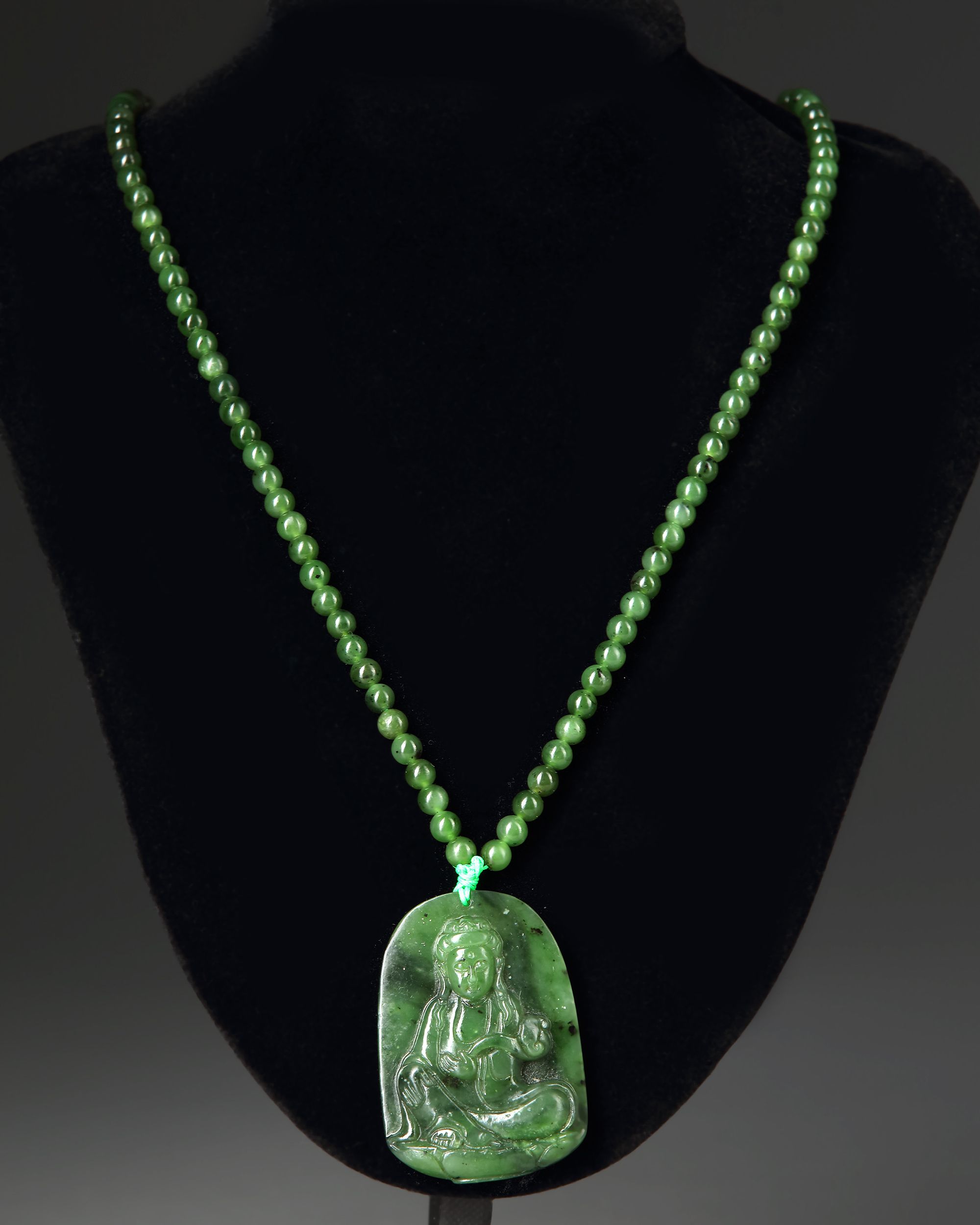 A Chinese nephrite necklace with a jade pendant carved with a seated Guanyin holding a ruyi scepter. 31 cm. without pendant
