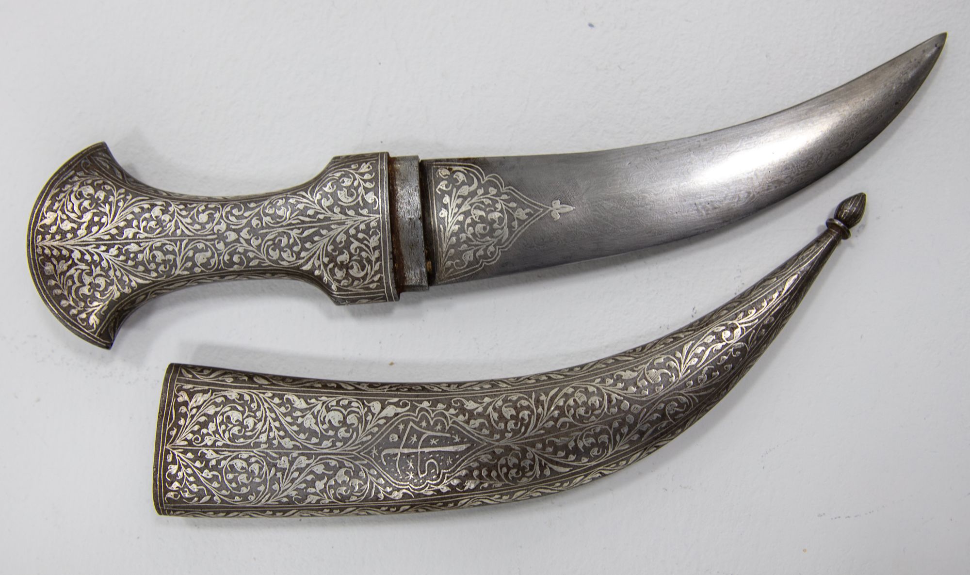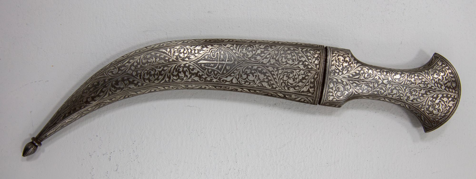 The double-edged curving tapering watered steel blade with armour-piercing tip, the forte with silver damascened floral spray, the sheath decorated in silver with a design of floral sprays.