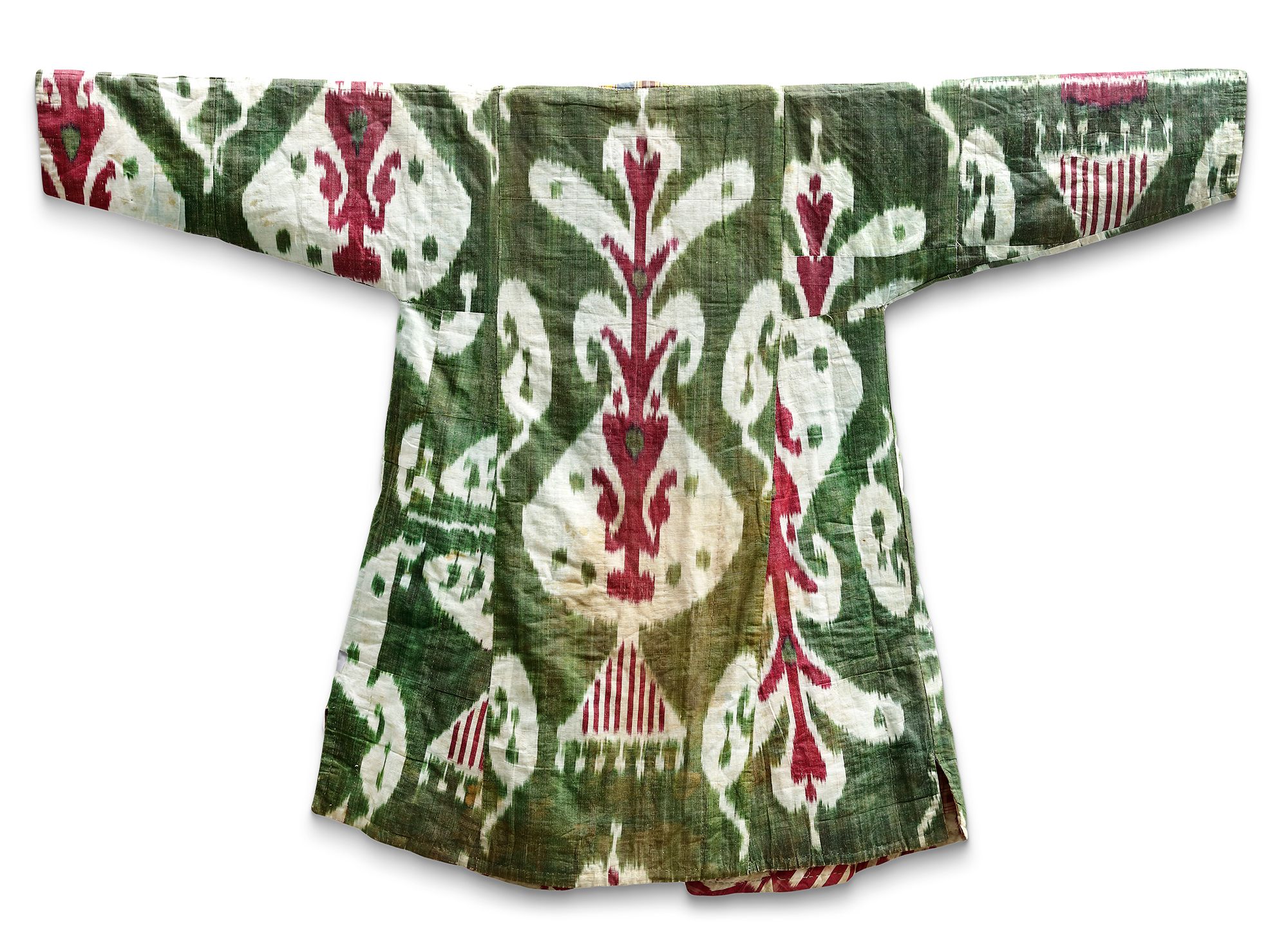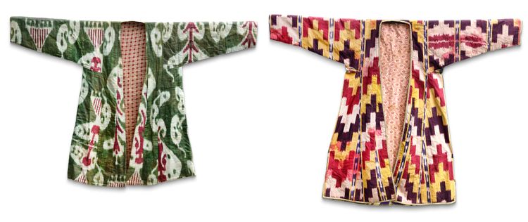 Central Asian ikat textiles are a testament to the power of pattern and are influenced by the various cultures along the historic Silk Road. Employing creative use of scale, proportion, and orientation, with hues that are compelling in their purposeful contrast, these luxury fabrics functioned as beacons of kaleidoscopic color that reflected the wealth and sophistication of its patrons. During the 19th and early 20th centuries, the region experienced a renaissance in ikat, a technique where silk threads were bound and resist-dyed with a design before weaving into cloth. The result were vivid patterns with blurred, cloud-like juxtapositions of color, known locally as abrbandi (literally “cloud binding”). When worn on the body or decorating the home, these textiles resonated against the Central Asian landscape.