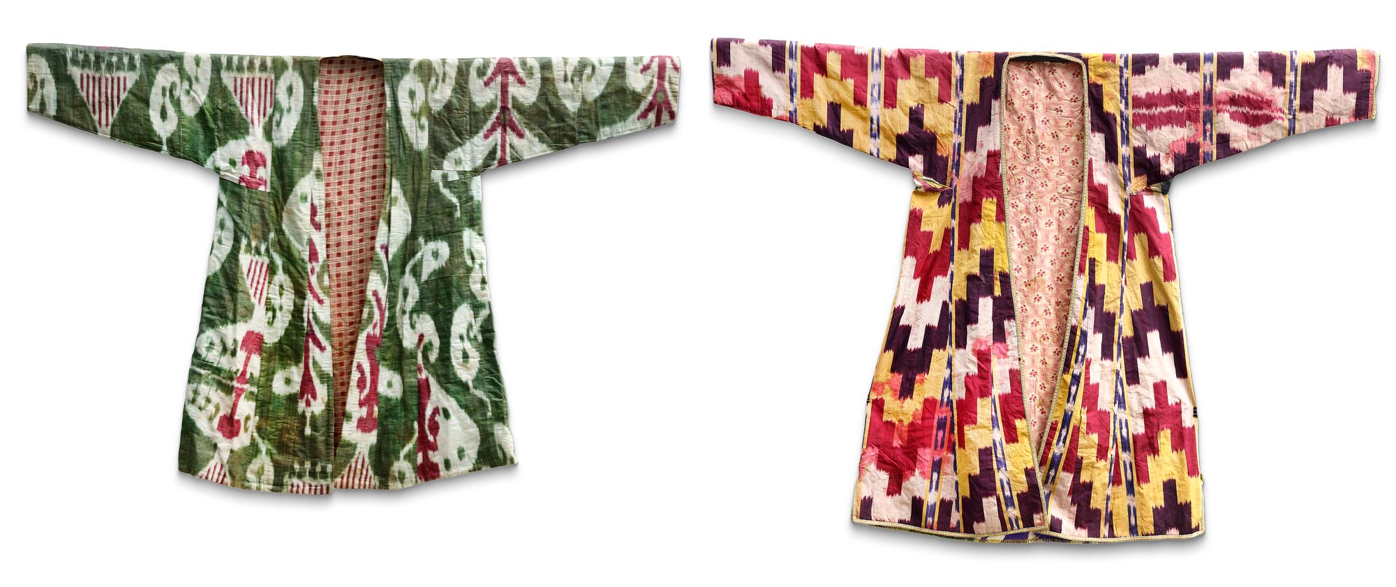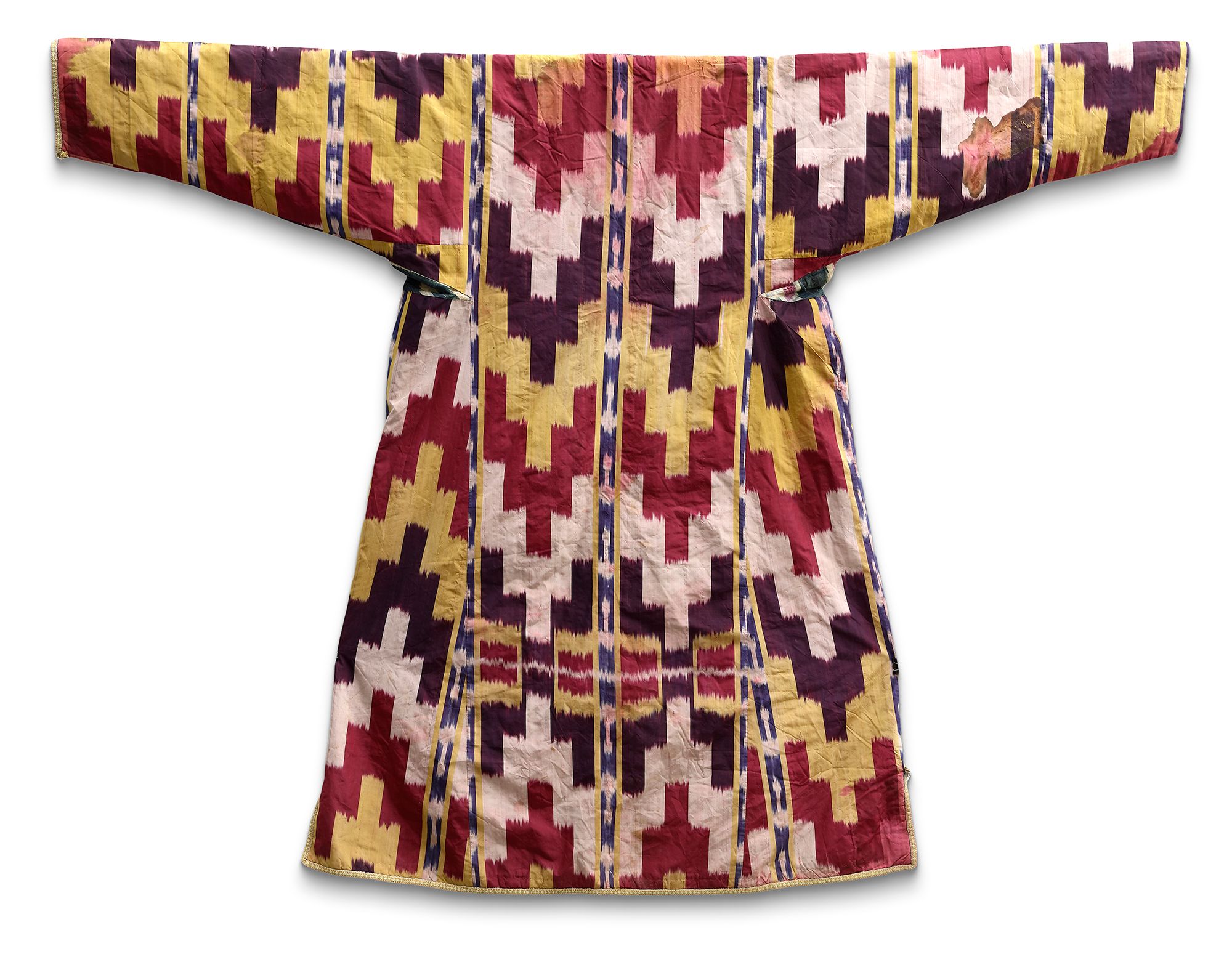 A beautiful Uzbek Ikat robe from Bukhara, The lovely colour compliment the patterns with natural red, yellow, purple and white.