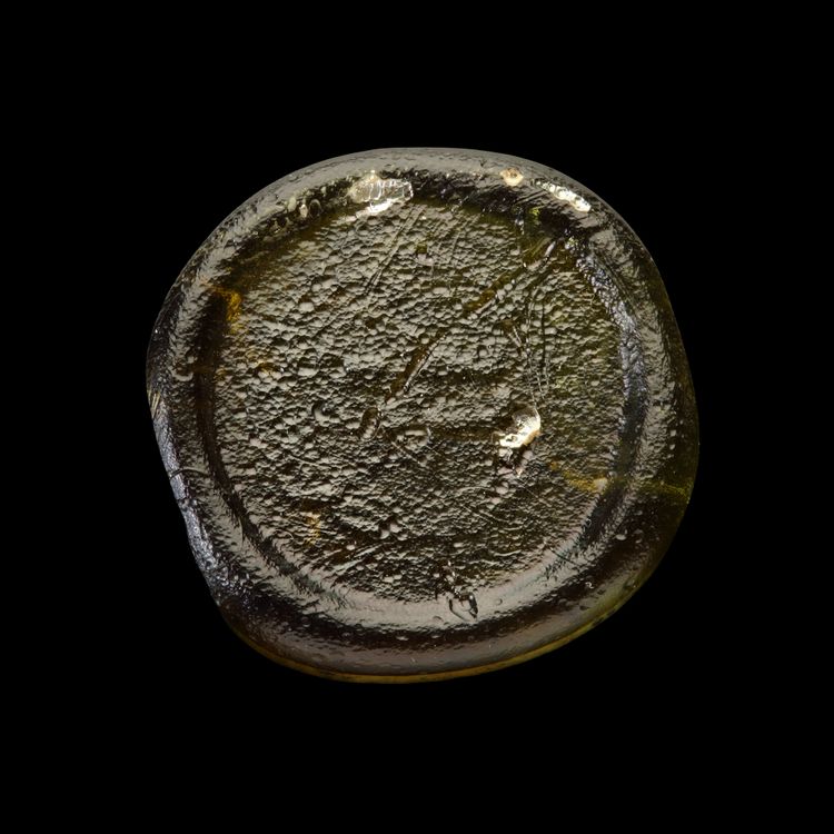 Glass weight, moulded and stamped, transparent light-green in colour, citing in the centre with 2 lines of undeciphered Arabic text.