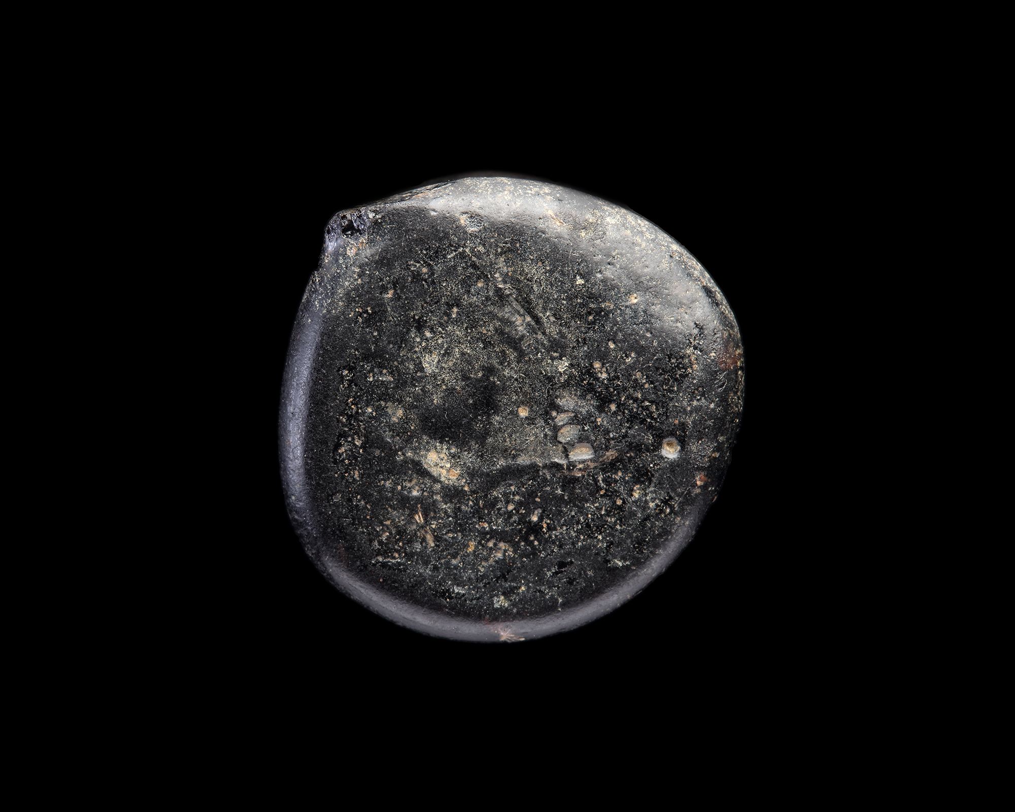 Glass weight, moulded and stamped, opaque-black in colour, citing in the centre with 2 lines of undeciphered Arabic text.