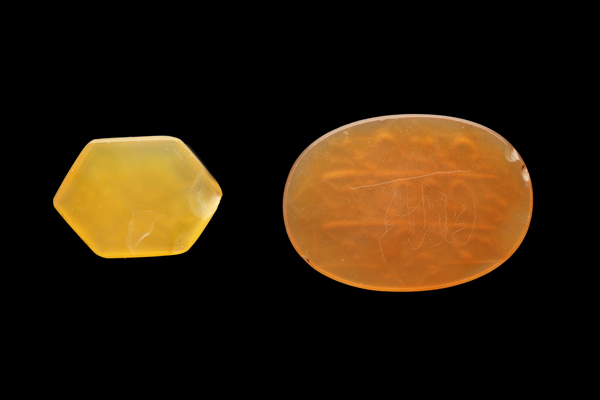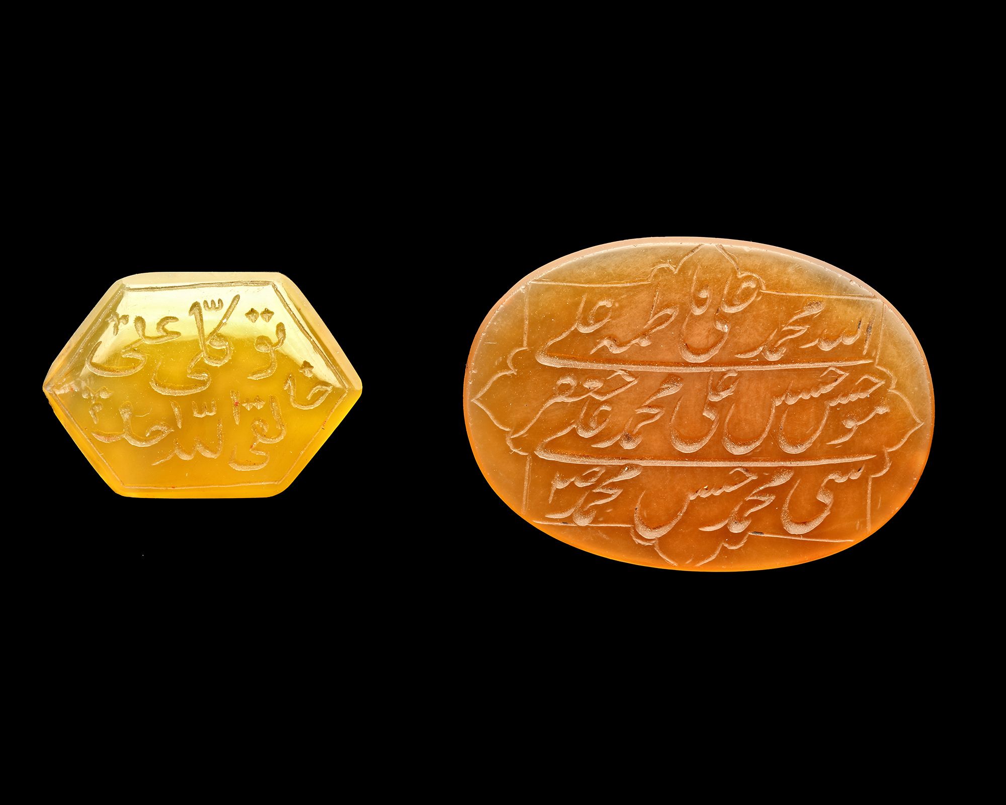A Qajar agate amulet of hexagonal form, engraved in nastaliq script with "توكلي على خالقي الله أحد", light brown in colour, 21 cm.