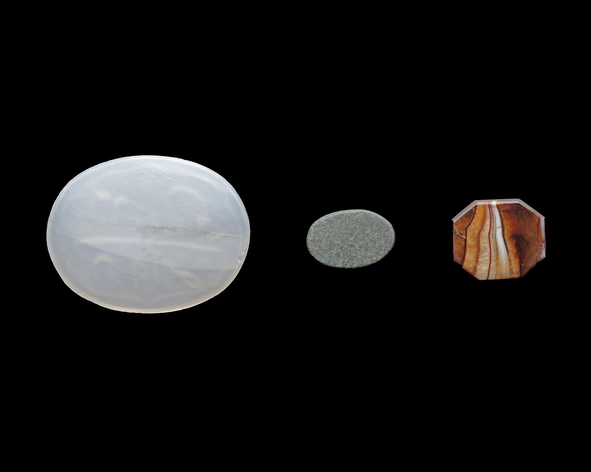 A Qajar white amulet of rounded form, engraved in nastaliq script with "صراط علي حق نمسكه", transparent with in colour, 26 cm.