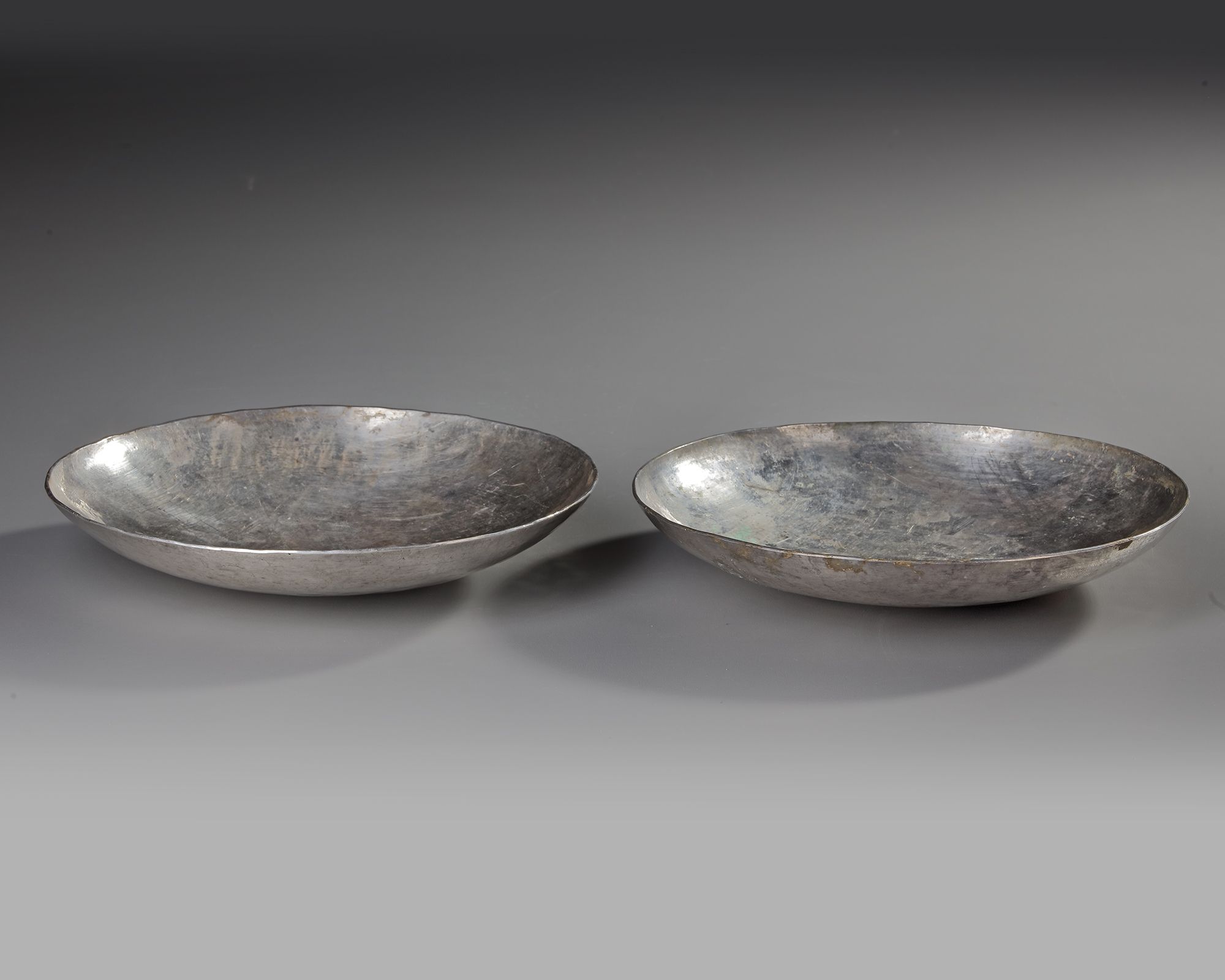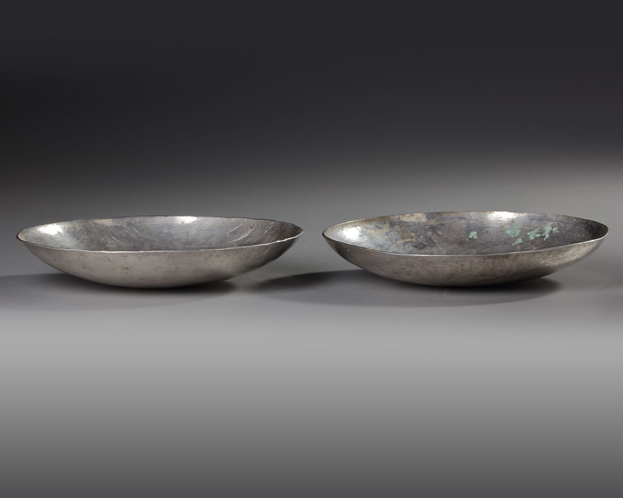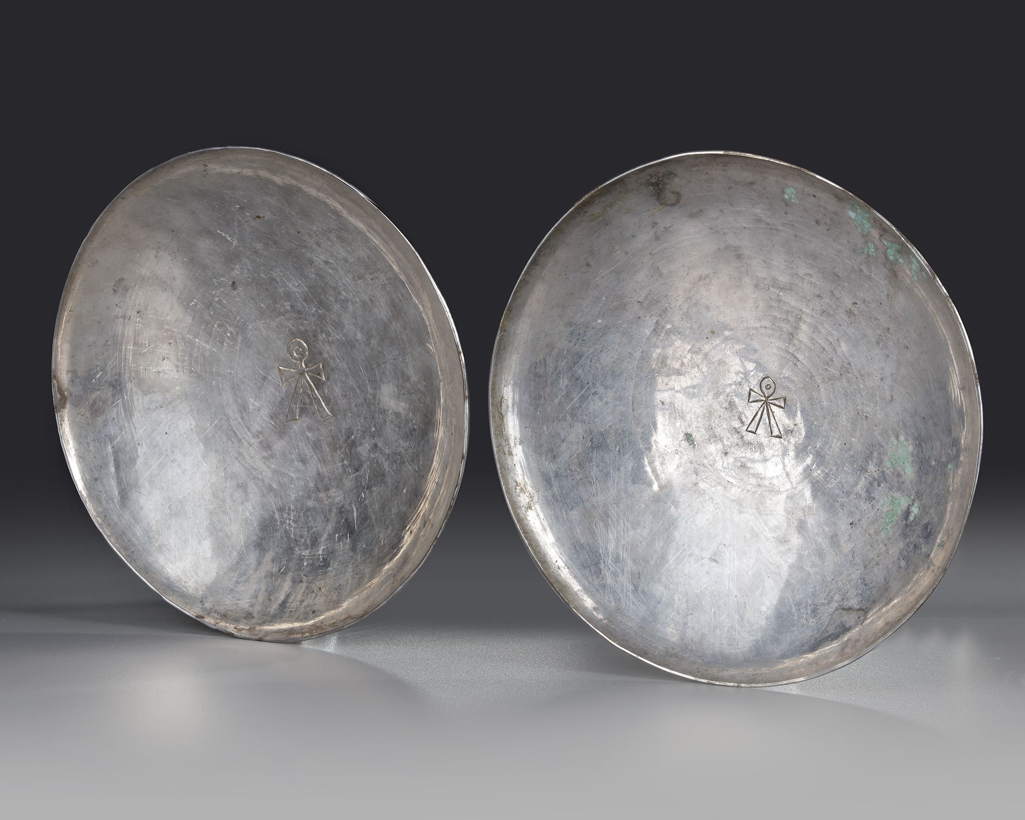 Shallow Sassanian silver bowl with an engraved symbol. 5th - 6th century AD. The symbol occurs similar on Sassanian coins and can be interpreted as symbol for the royal diadem or of Frahwar.
