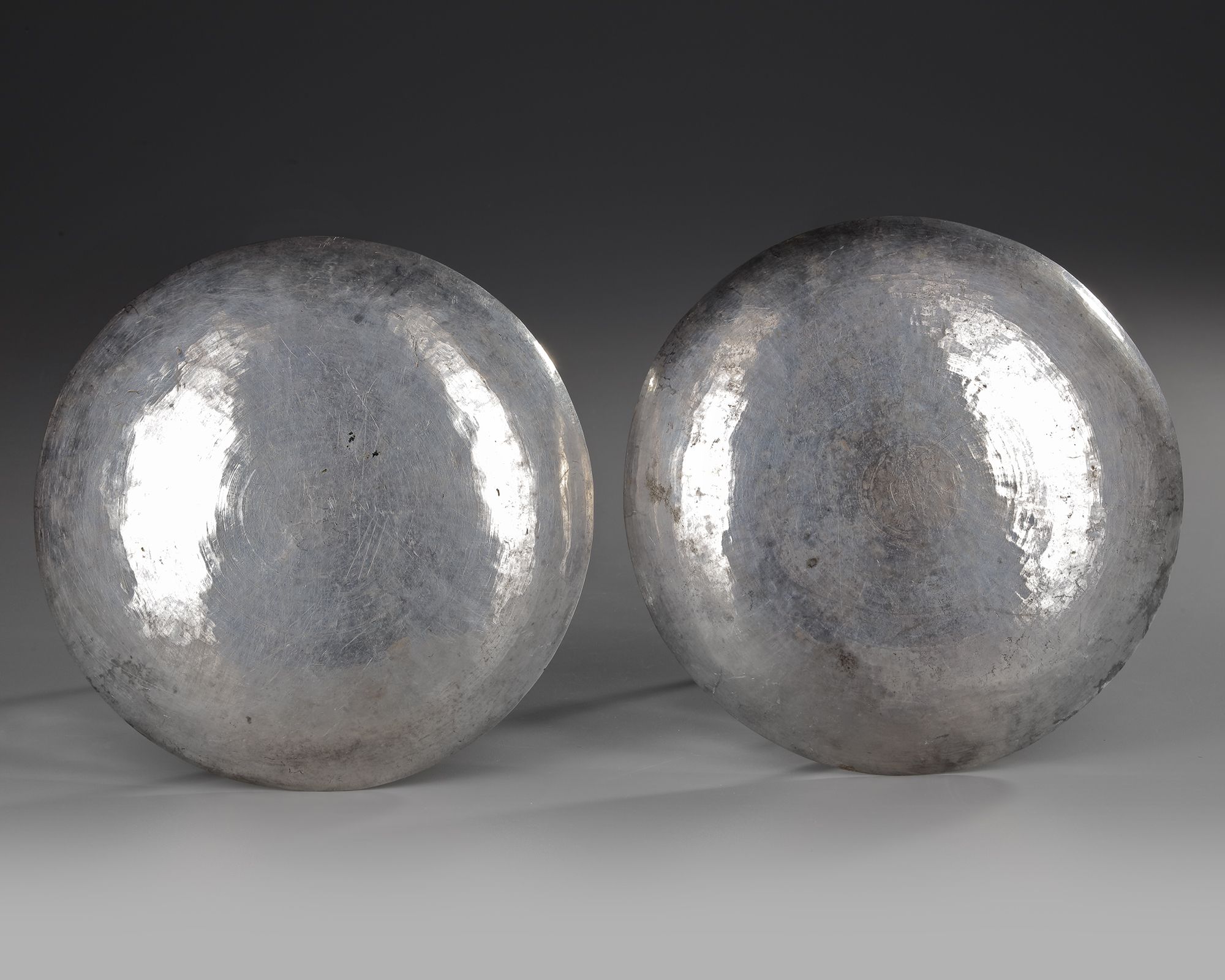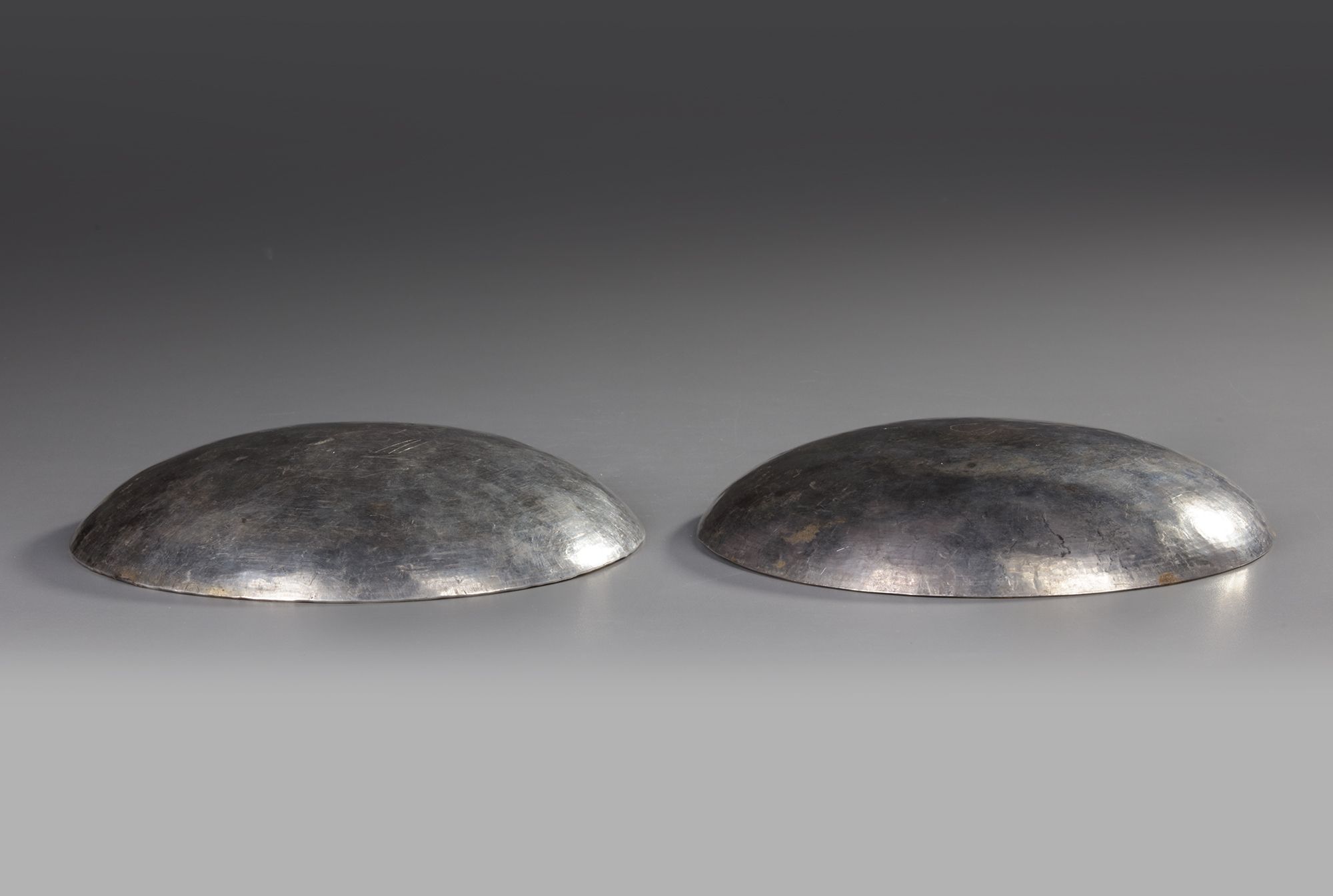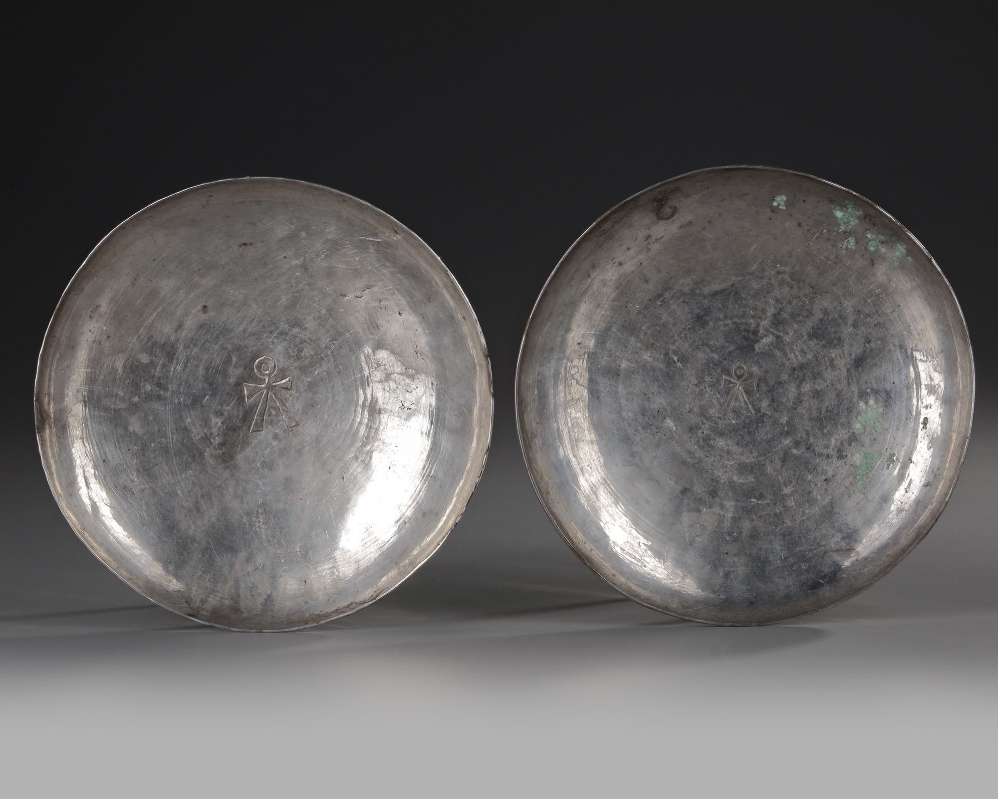 Shallow Sassanian silver bowl with an engraved symbol. 5th - 6th century AD. The symbol occurs similar on Sassanian coins and can be interpreted as symbol for the royal diadem or of Frahwar.