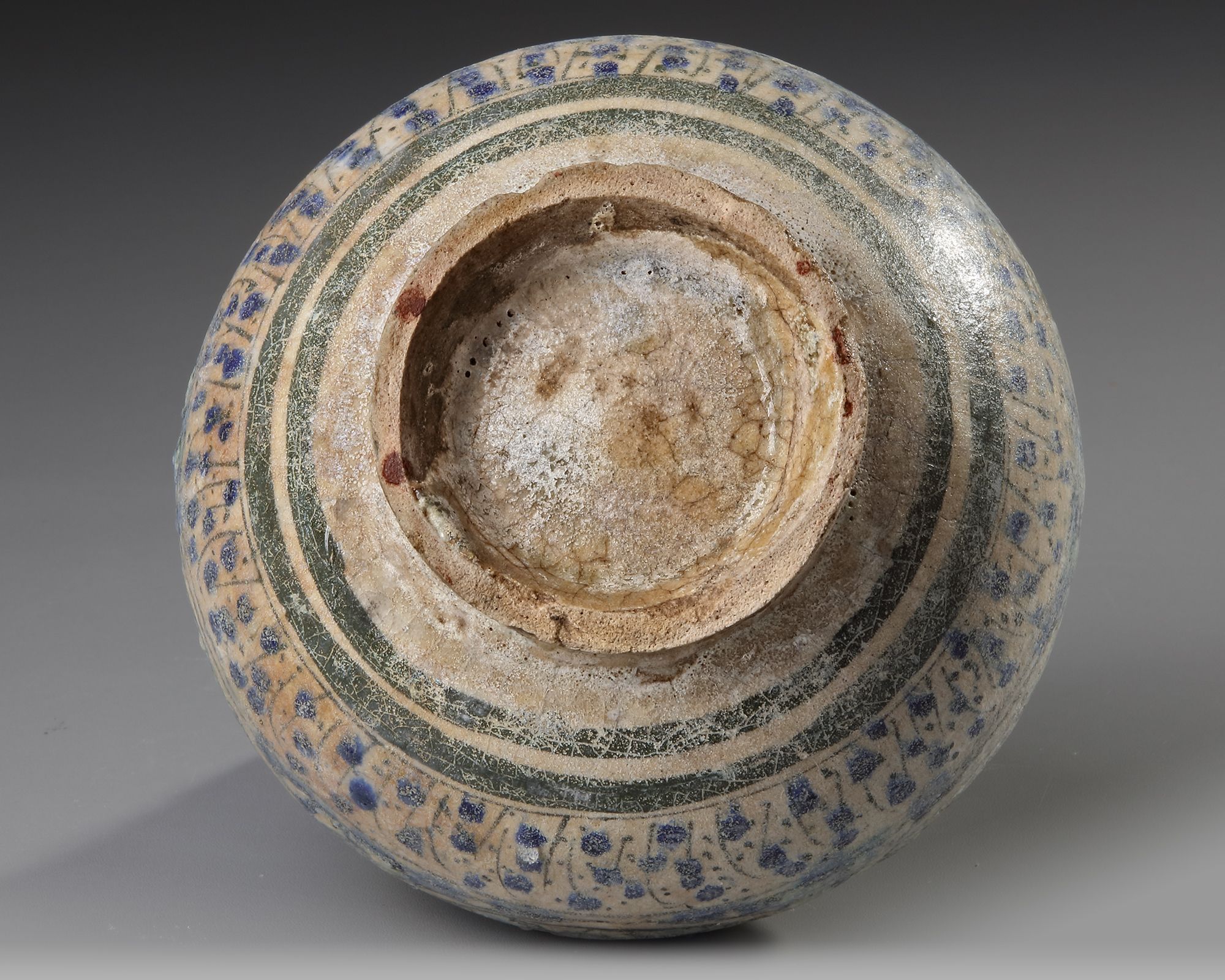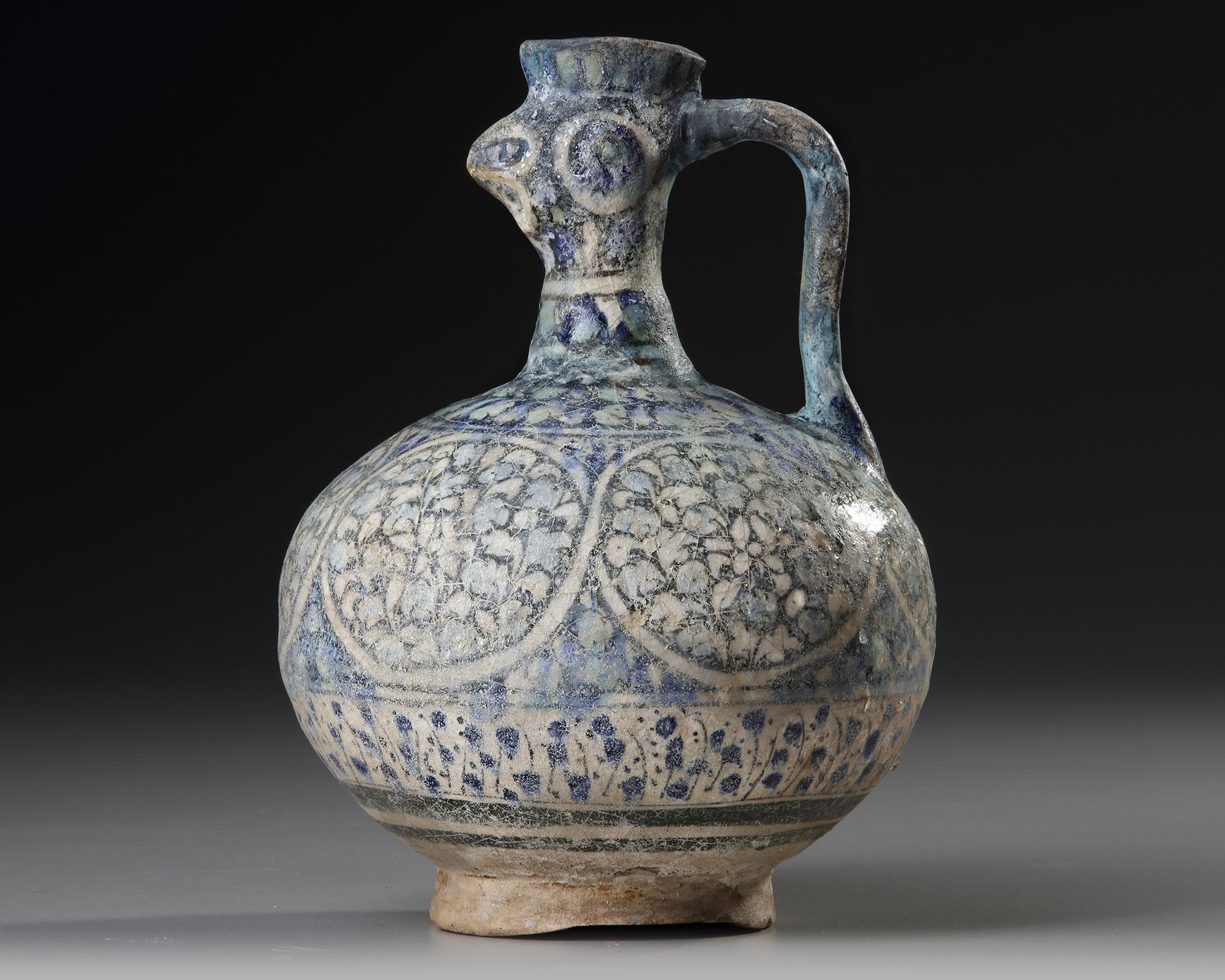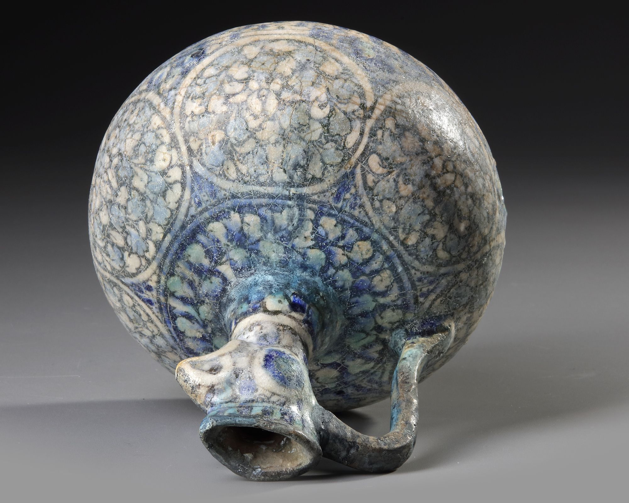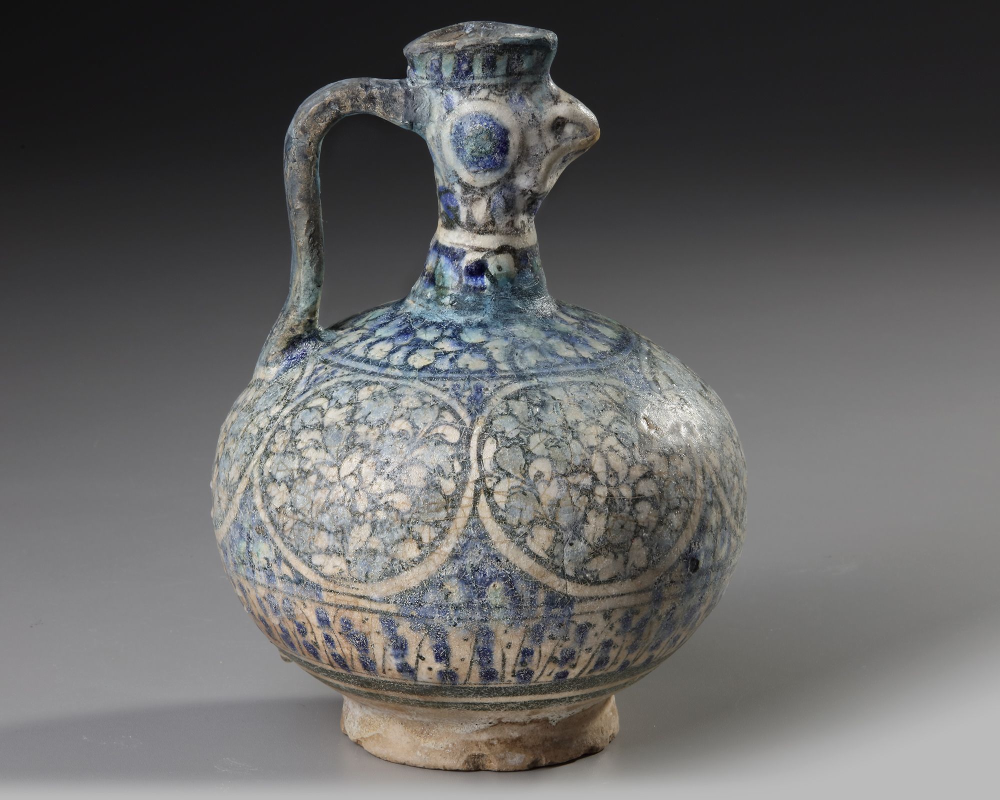With compressed globular body rising from short vertical foot to cockerel-head mouth with pronounced comb, simple handle connecting the mouth with the body, decorated in cobalt blue and turquoise with a band of roundels enclosing flower heads amongst foliage under a band of foliage to the shoulder.