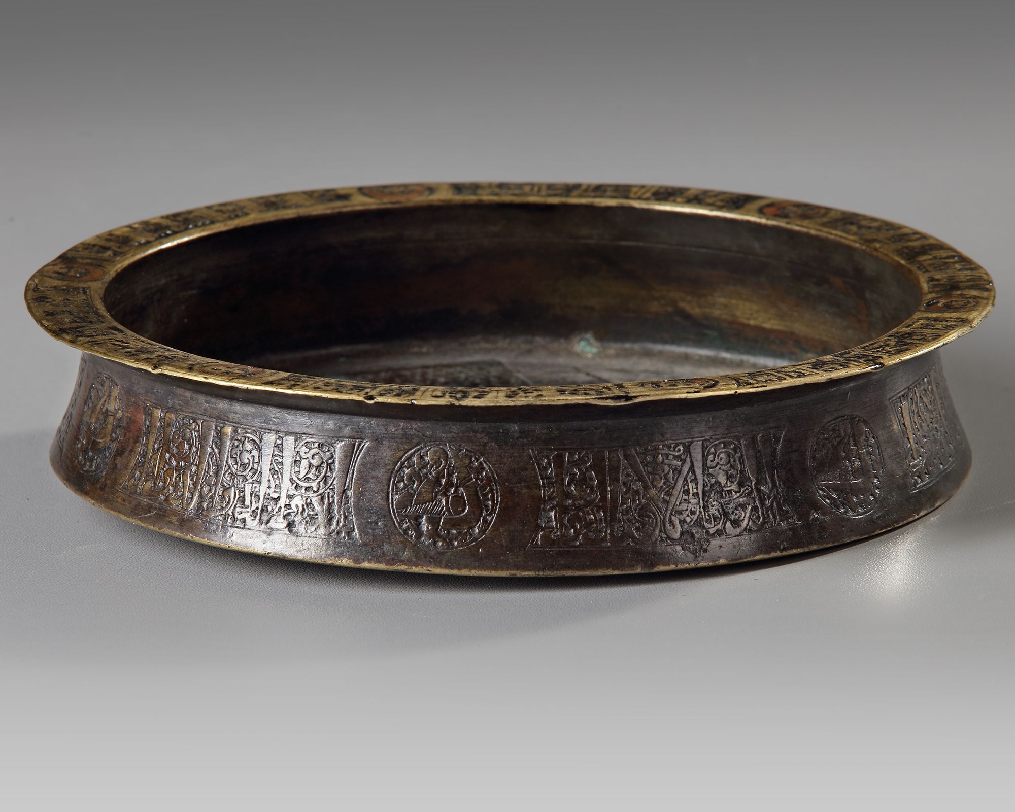 a royal seated figure, the rim with inscriptions, the exterior of the sides with cartouches filled with inscriptions, punctuated by roundels with birds.