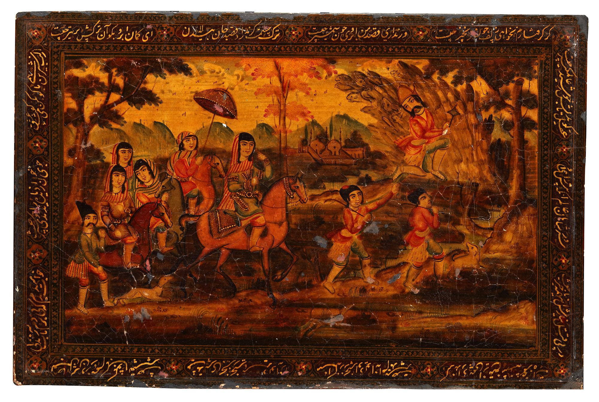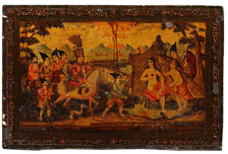 Each of rectangular form, with a detailed depiction of Khusraw discovering Shirin bathing, surrounded by a band containing cartouches enclosing inscriptions in Nastali'q script.
