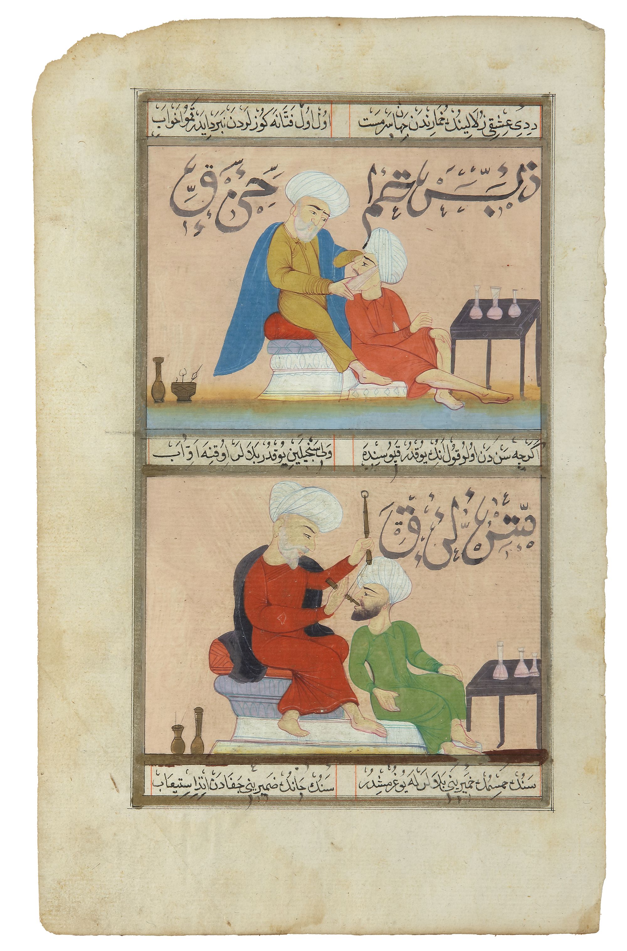 Opaque colour on paper depicting Ottoman Turk dentist and patients. Note the use of a bow-drill in the lower figures. 27 by 17 cm.