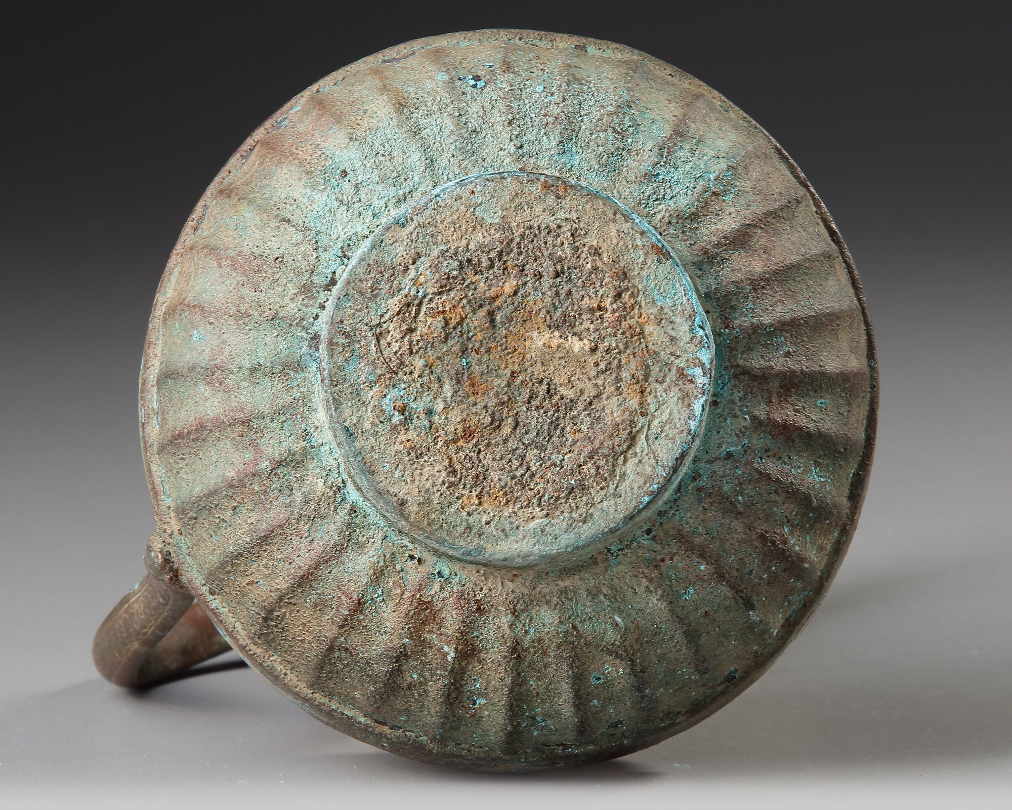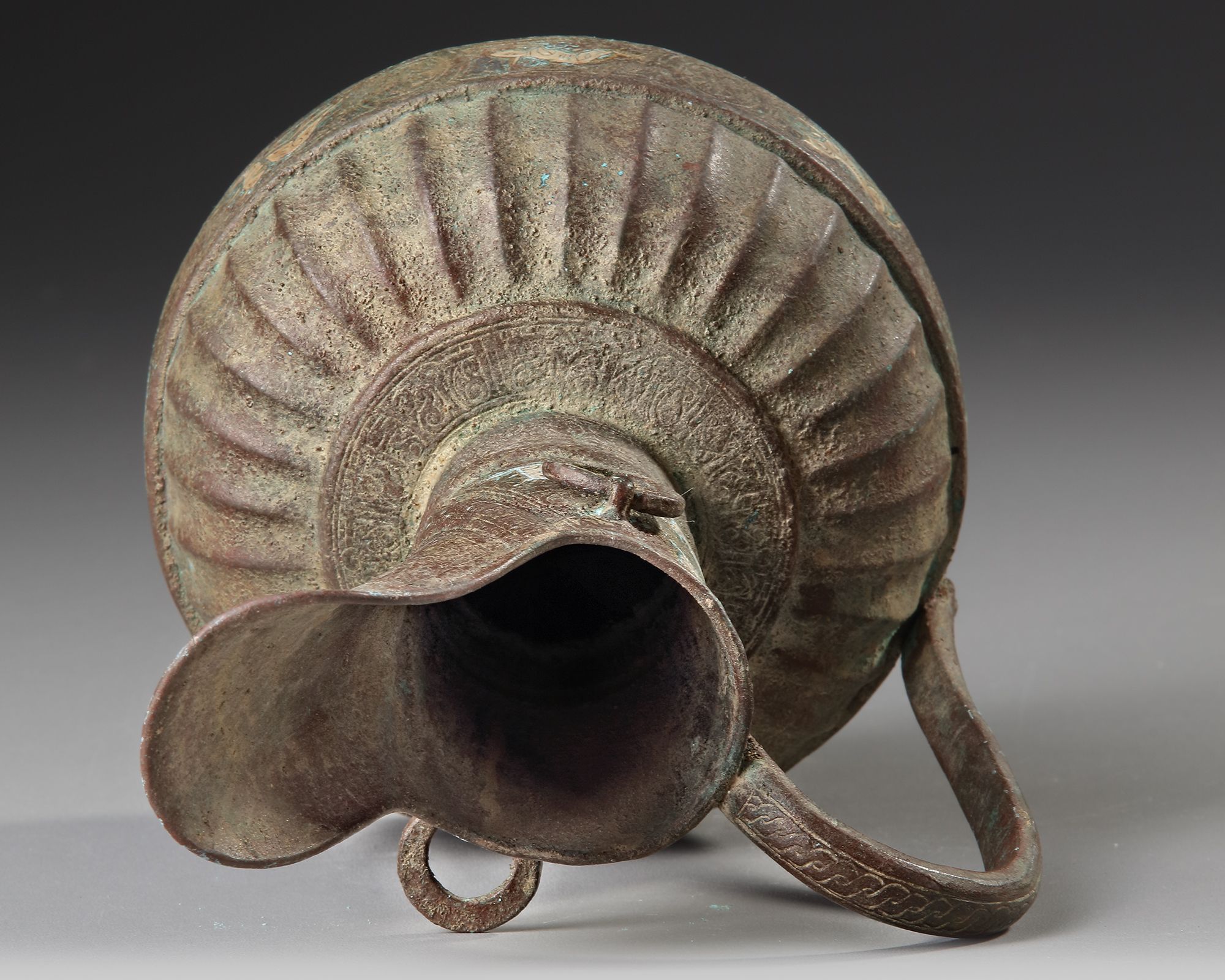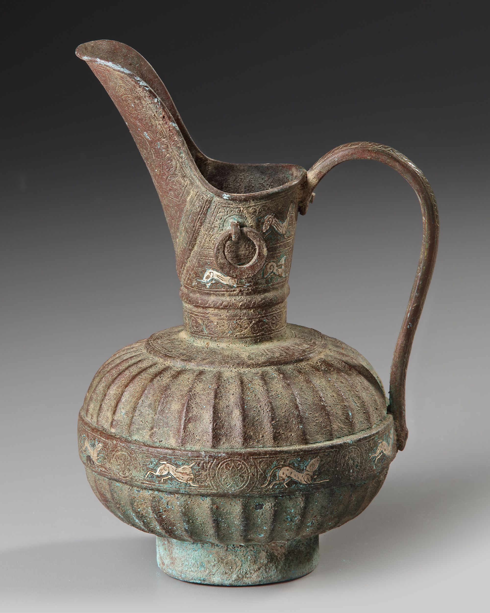 The compressed globular slightly upward opening body rests on a spreading base, the cylindrical neck has a collar at its lower part and on top is a high semi-opened spout, a simple handle connecting the mouthrim with the body, carved around the body and the mouth with gilt animals on a ground carved with scrolls.
