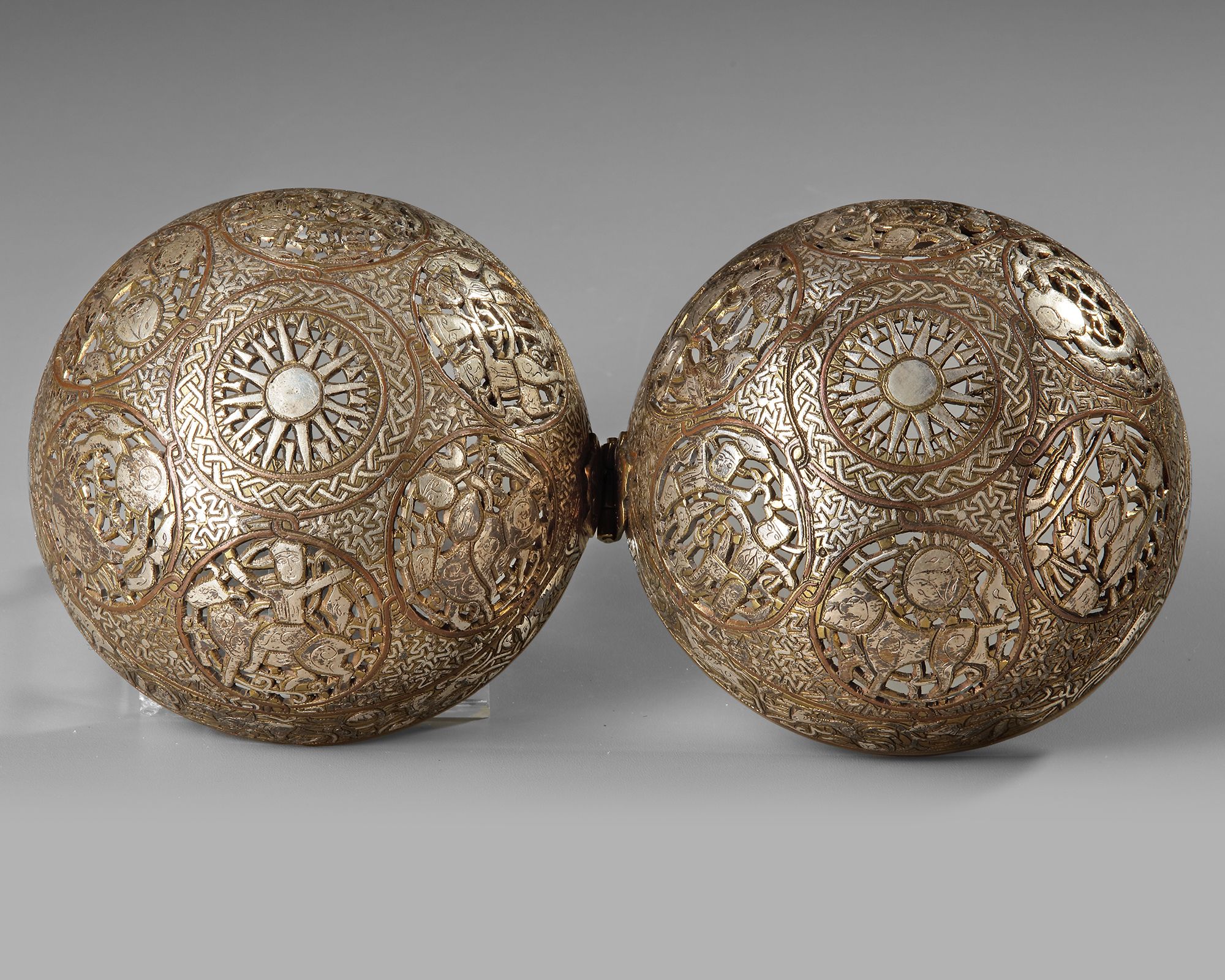 A spherical shaped brass censer, decorated with silver inlaid roundels containing the twelve pierced zodiac signs, a band around each rim decorated with rabbits chased by dogs in a hunting scene.