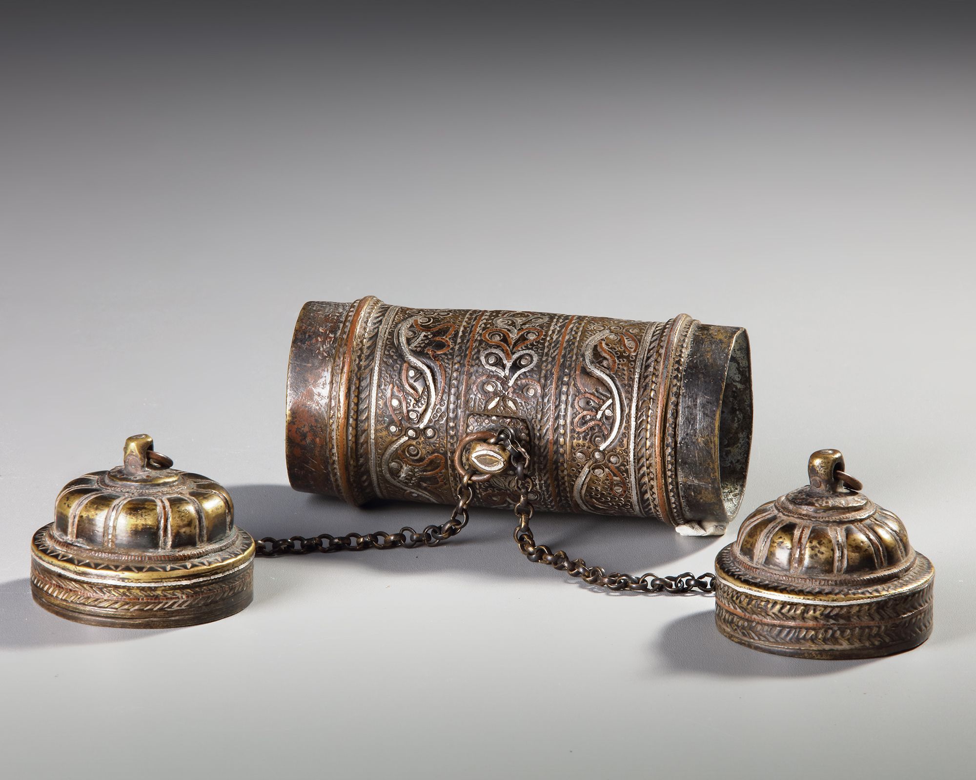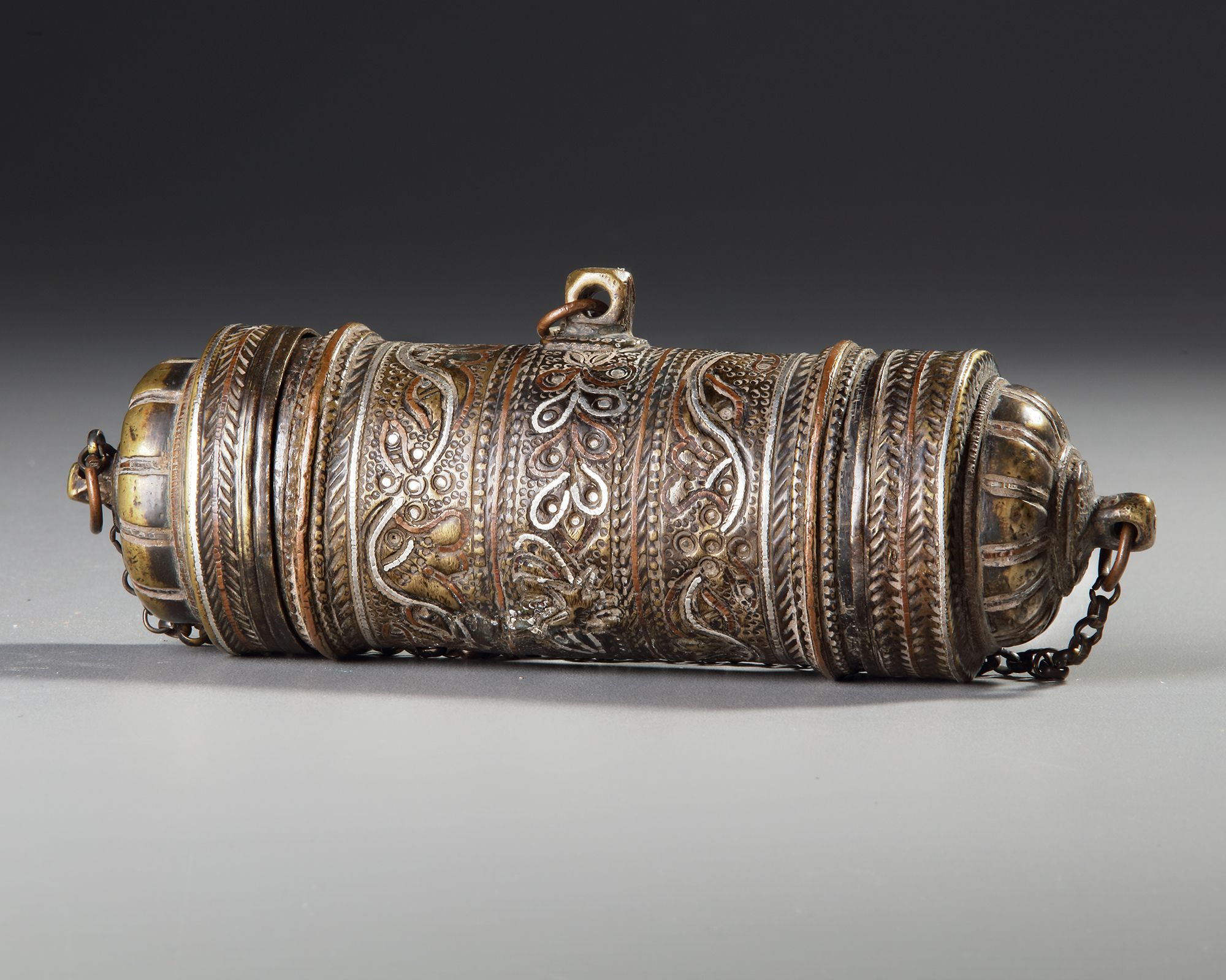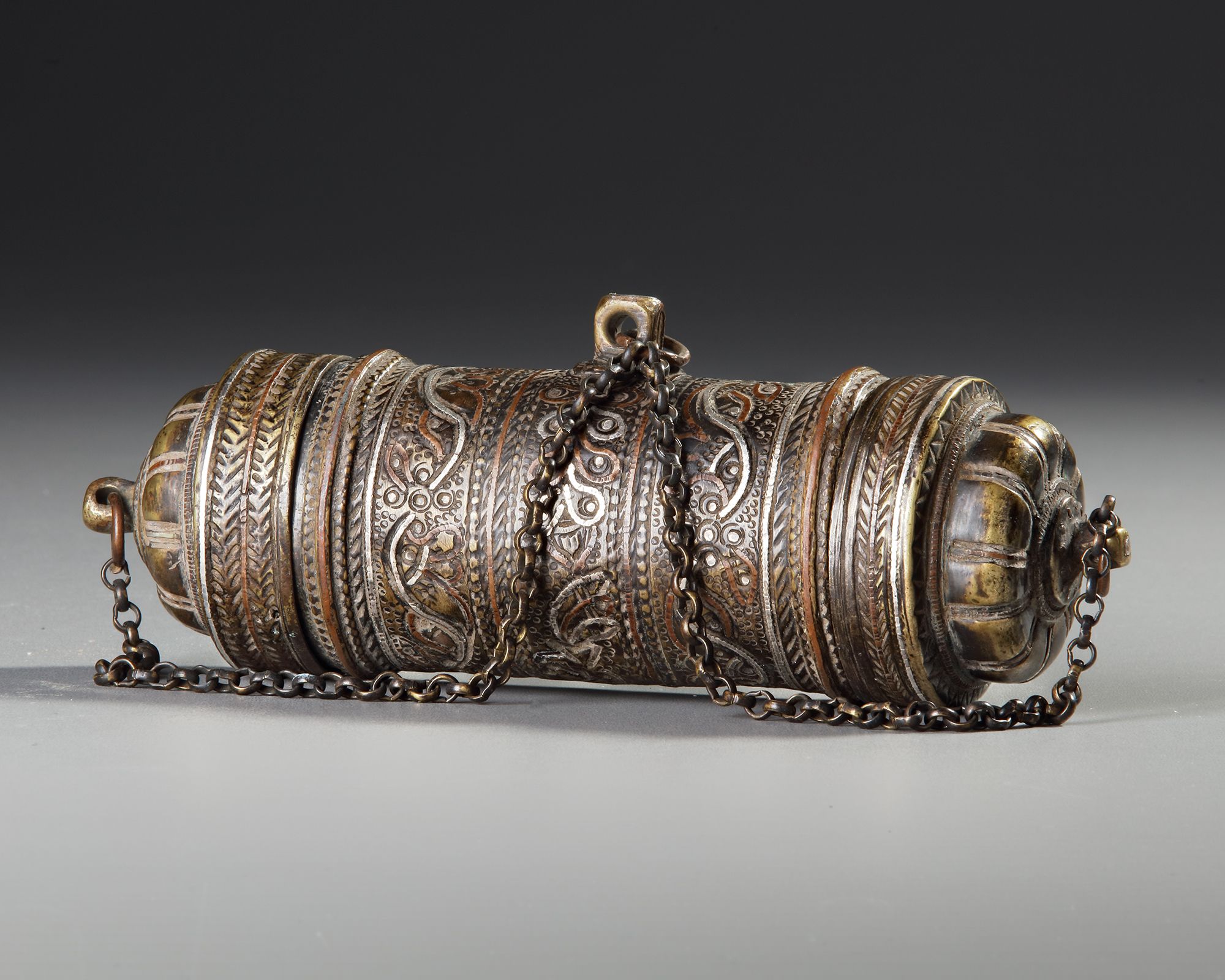 A cylindrical case engraved with copper and silver inlaid floral scrolls. 19 cm.