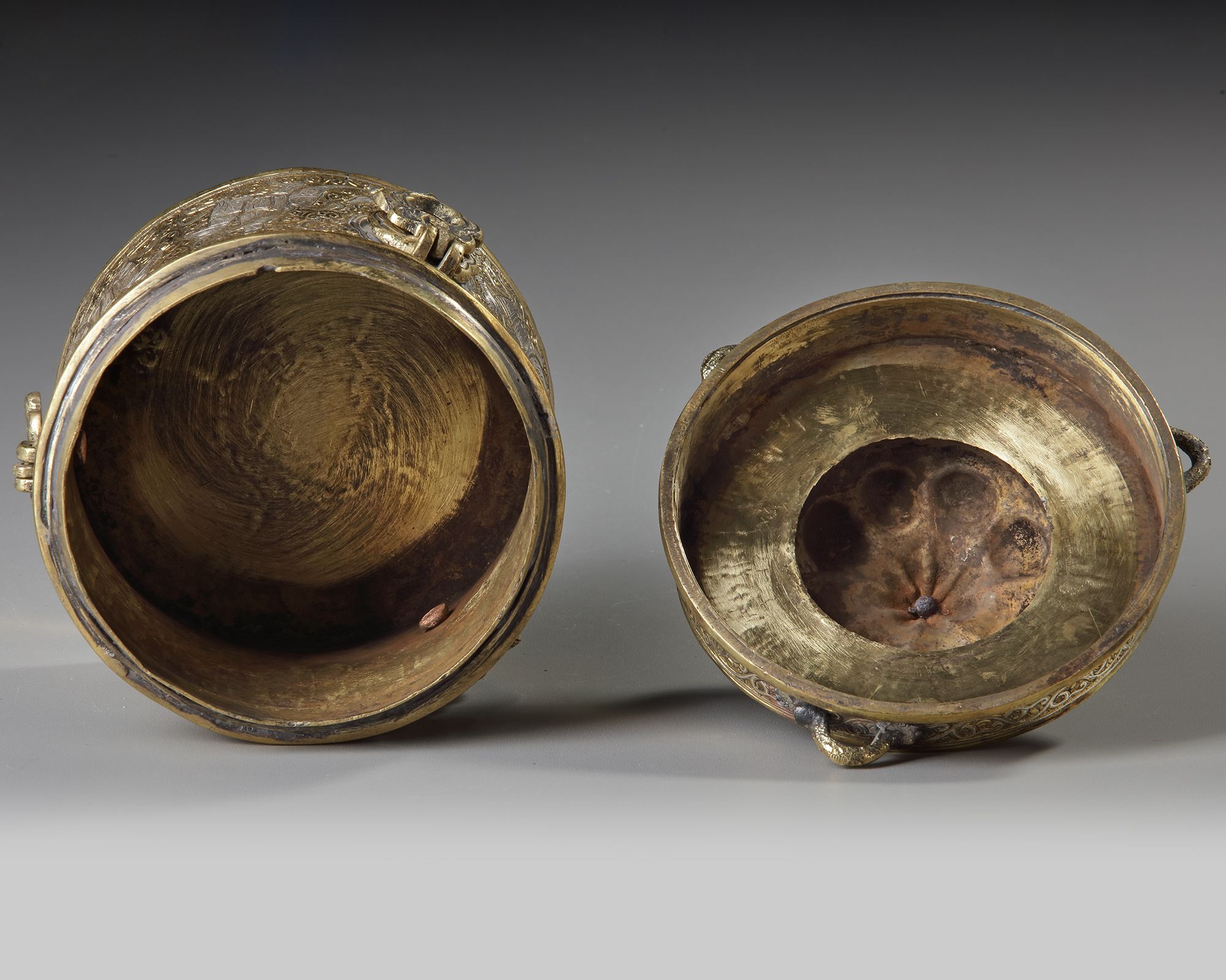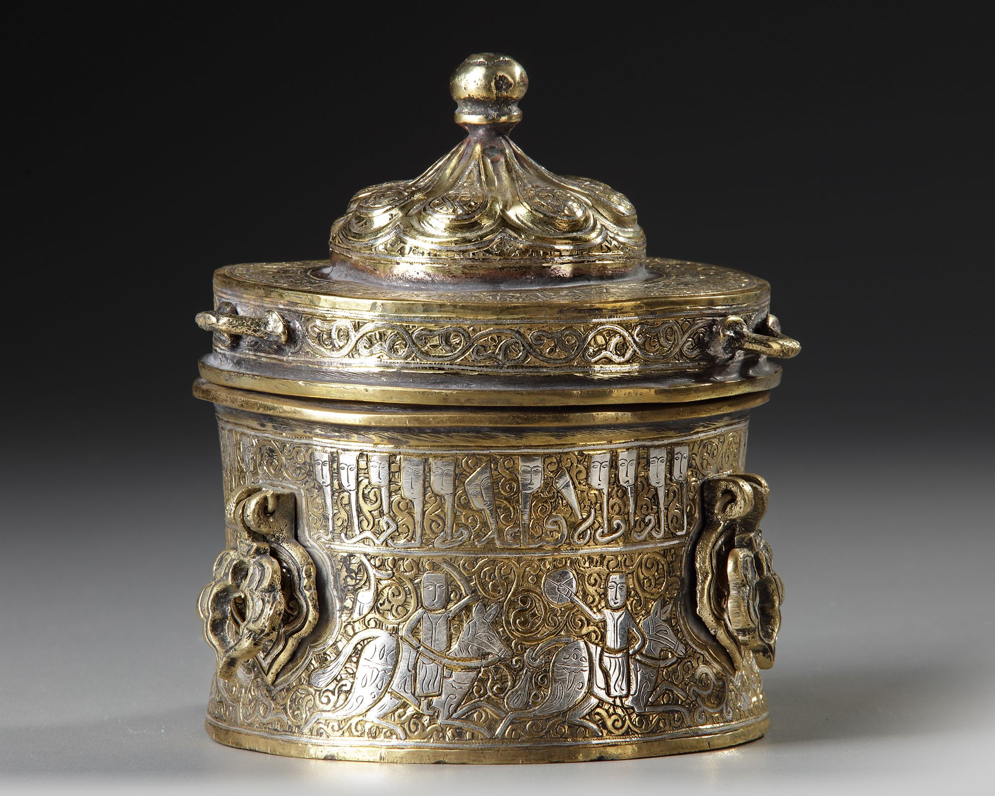 Of cylindrical form applied with three hinged handles, decorated in silver inlay with two bands containing inscriptions in kufic script and horsemen in fight scenes. The underside of base with a roundel enclosing a seated figure with flower heads, the cover with a central domed section surmounted by a bud finial and engraved with a band of silver inlaid inscriptions in kufic script, with three loop handle.