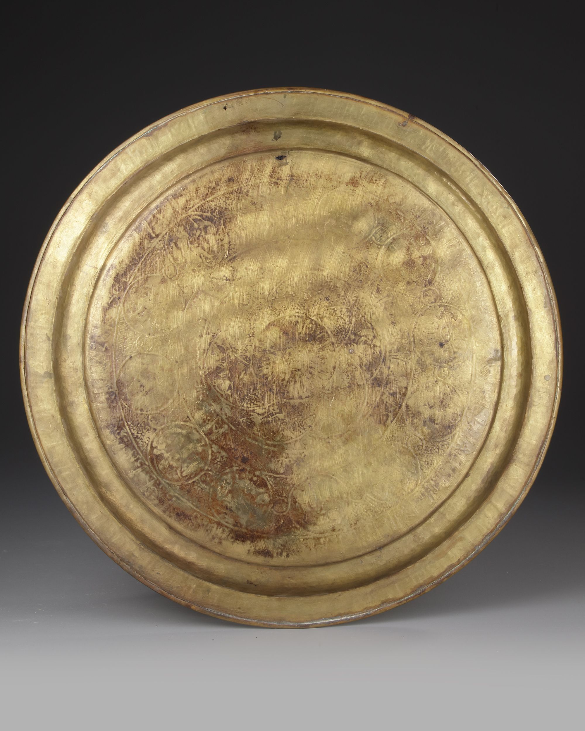 Of circular form, profusely engraved and decorated in silver inlay with concentric bands containing inscription filled bands, twelve roundels enclosing the zodiac signs, palmette motifs, interlocking birds and scrolling foliate vines.