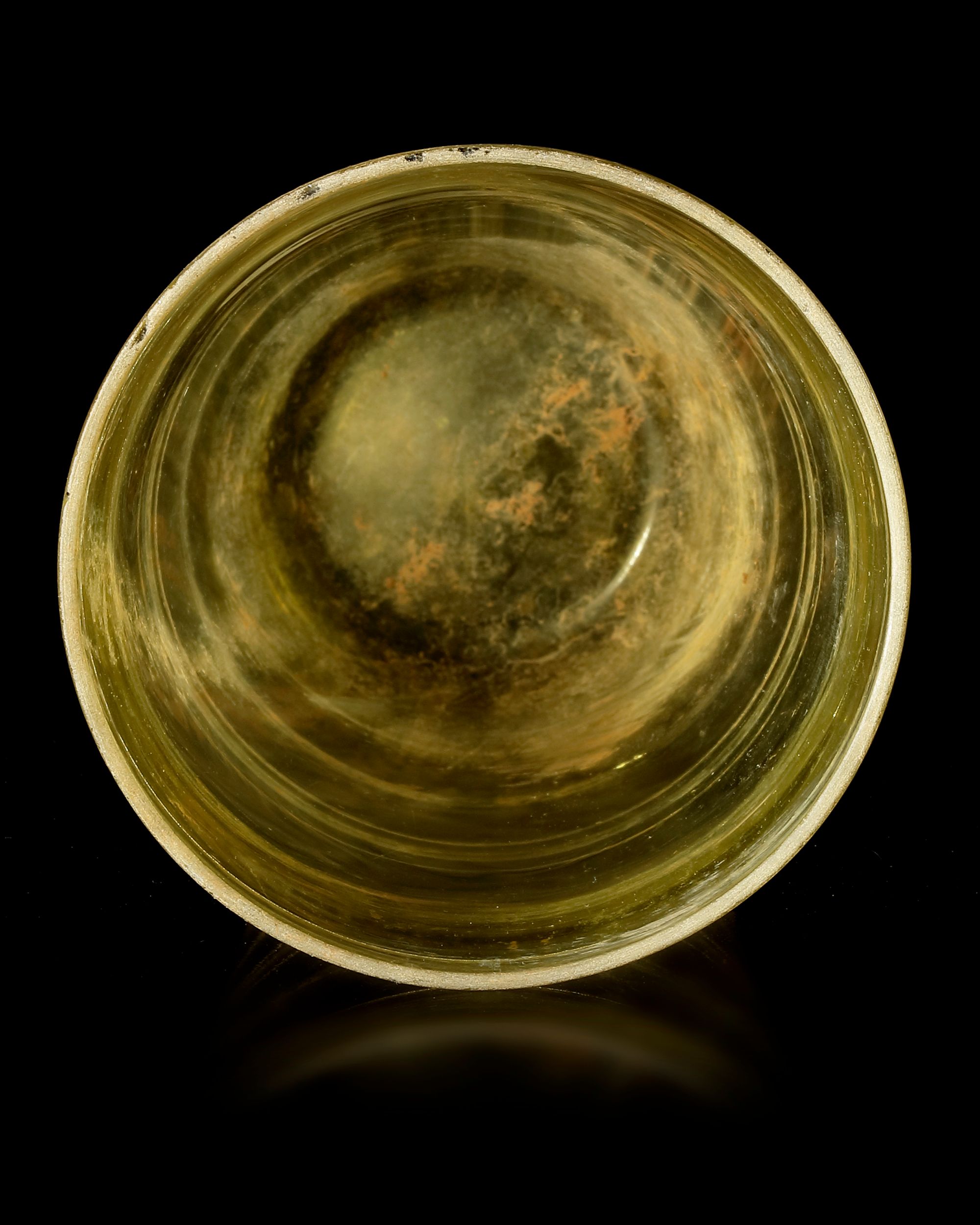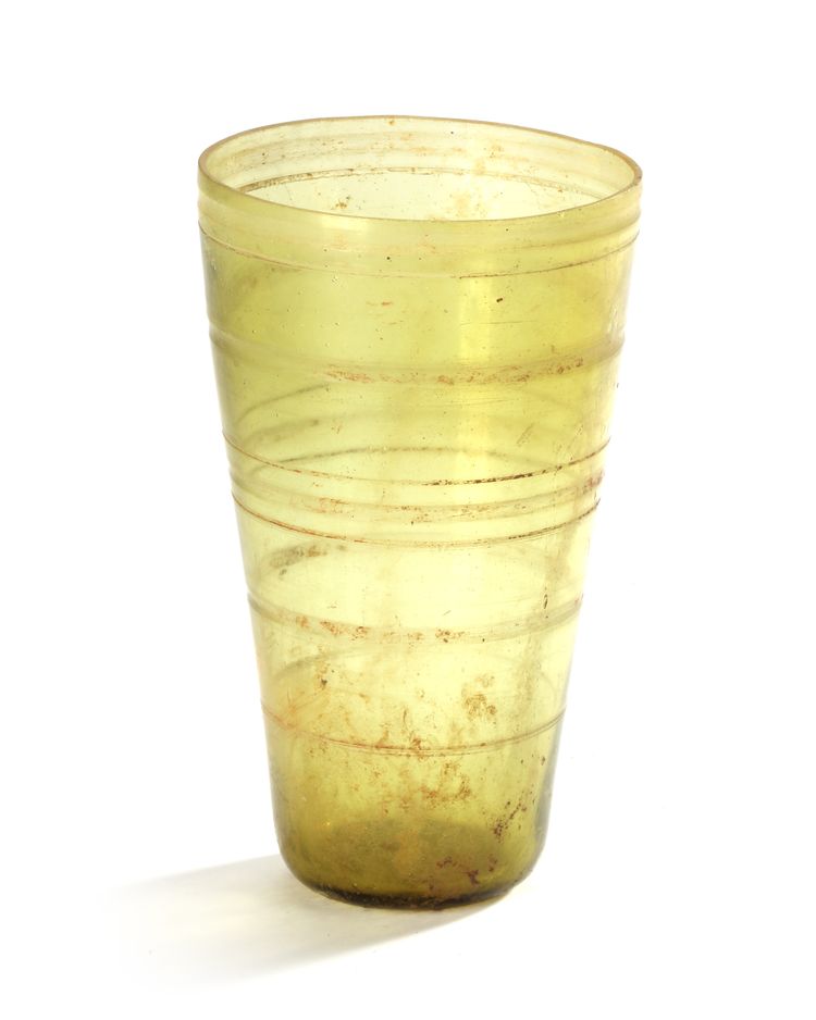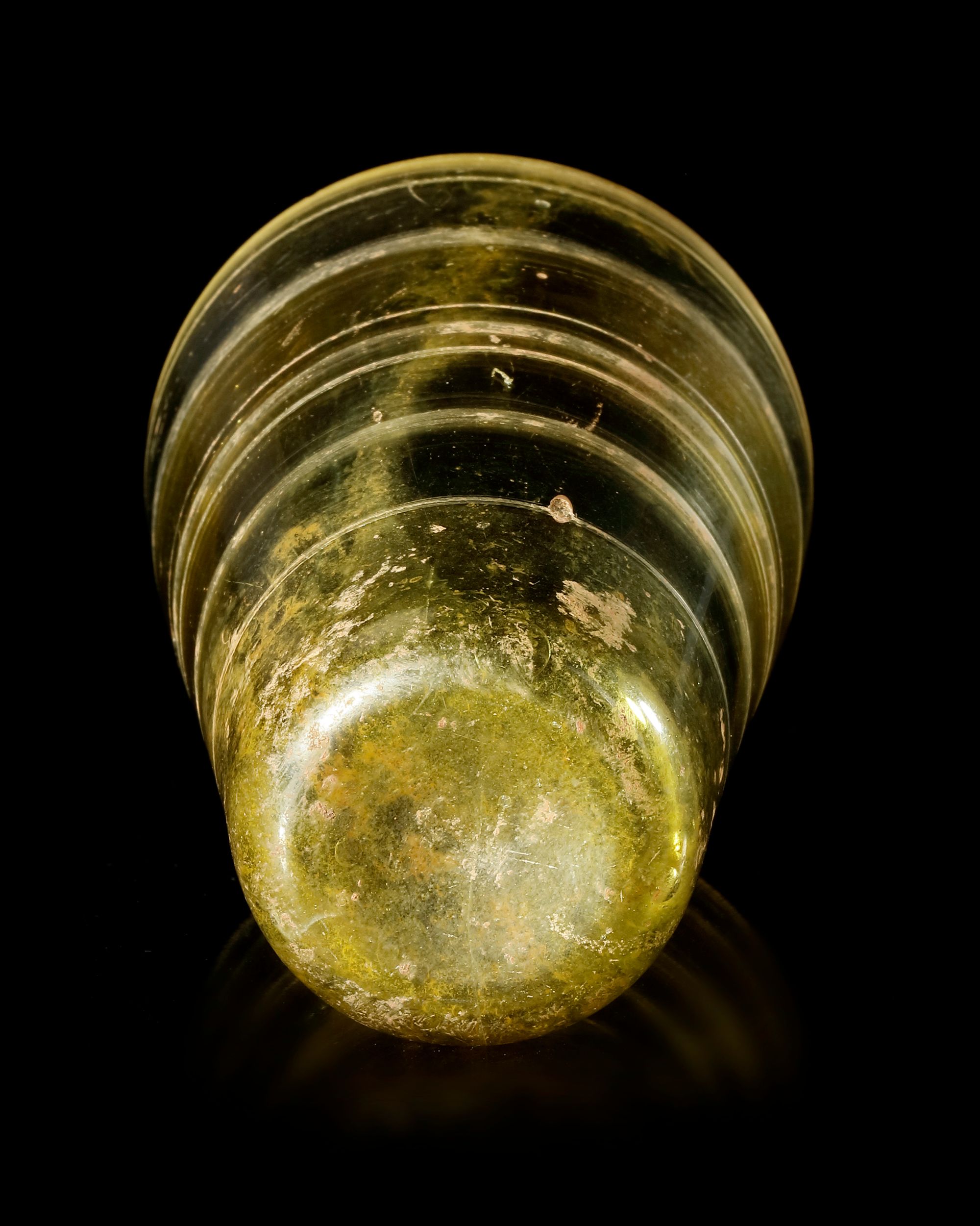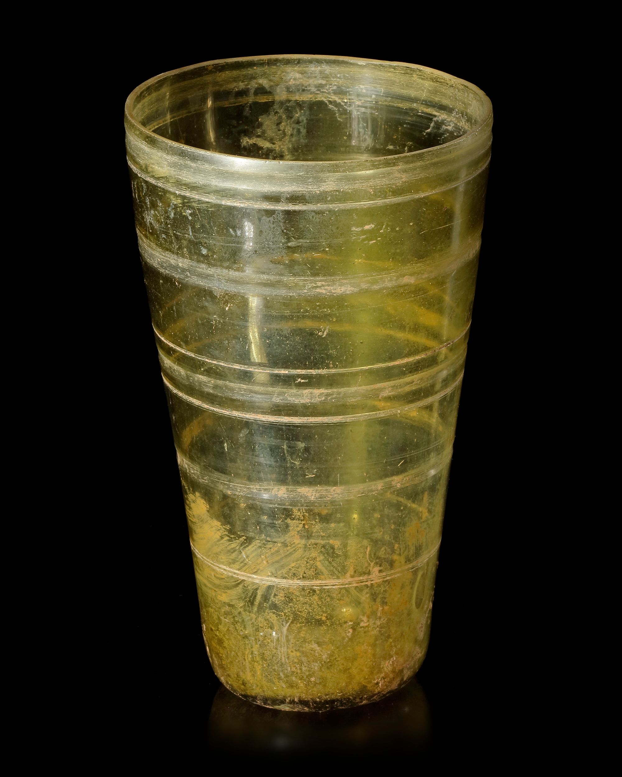 Of tapering cylindrical form broadening toward the mouth, clear glass body with rings around it. 14.7 by 8.5 cm.