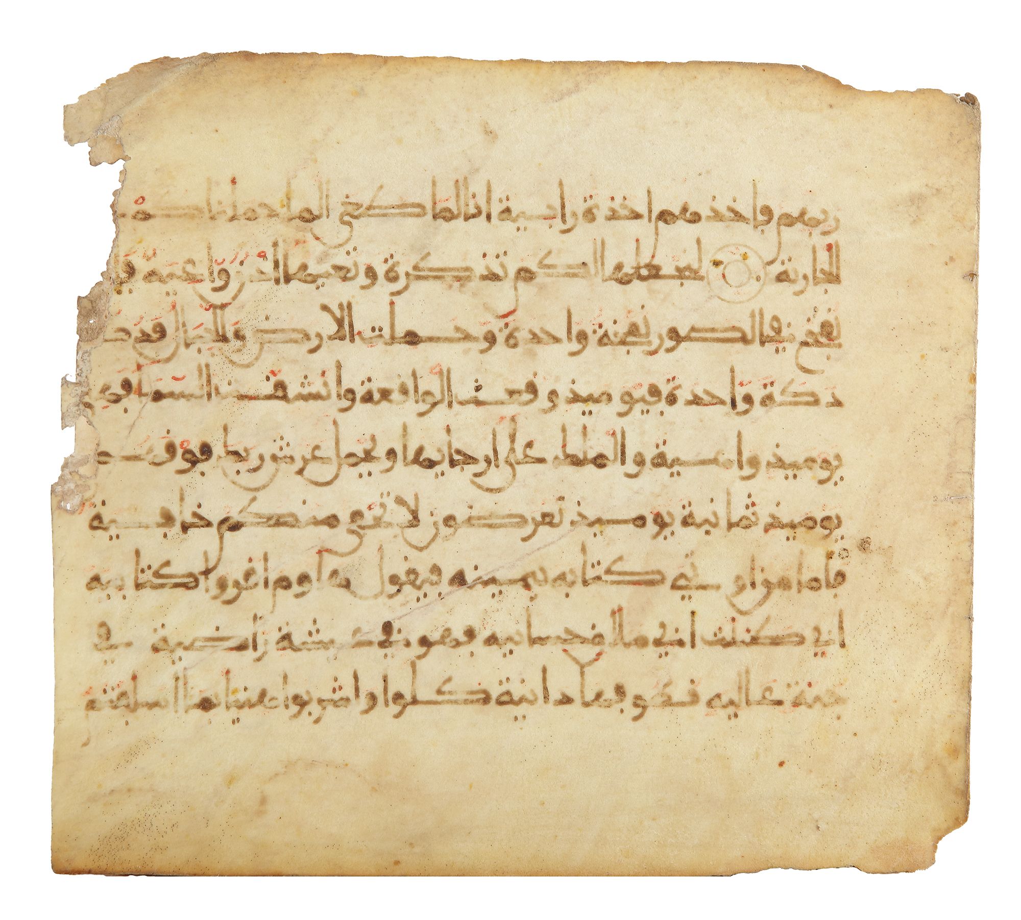 Arabic manuscript on vellum, each page with 9 lines written in maghribi script in sepia ink, double brown roundel verse markers, red diacritic marks.