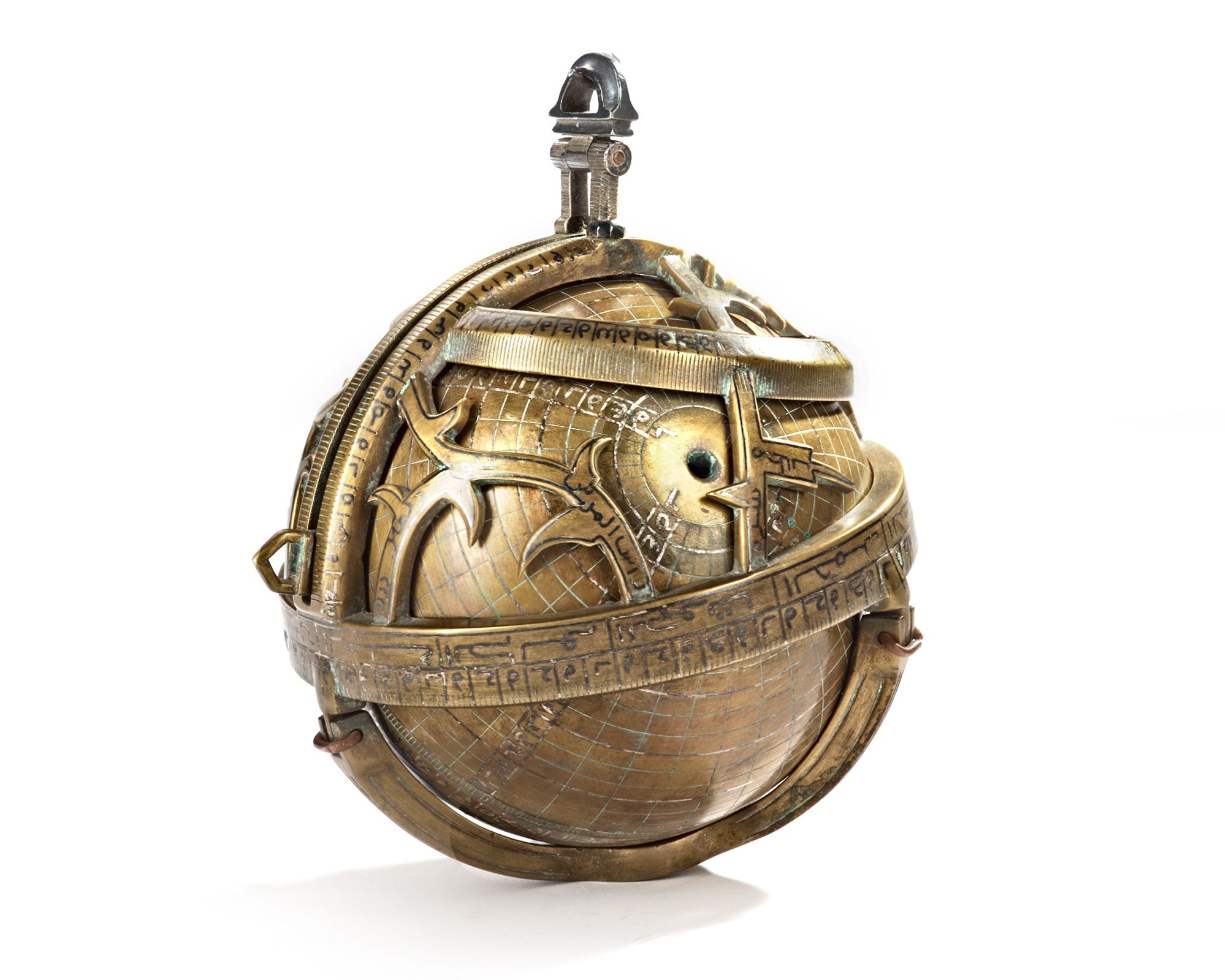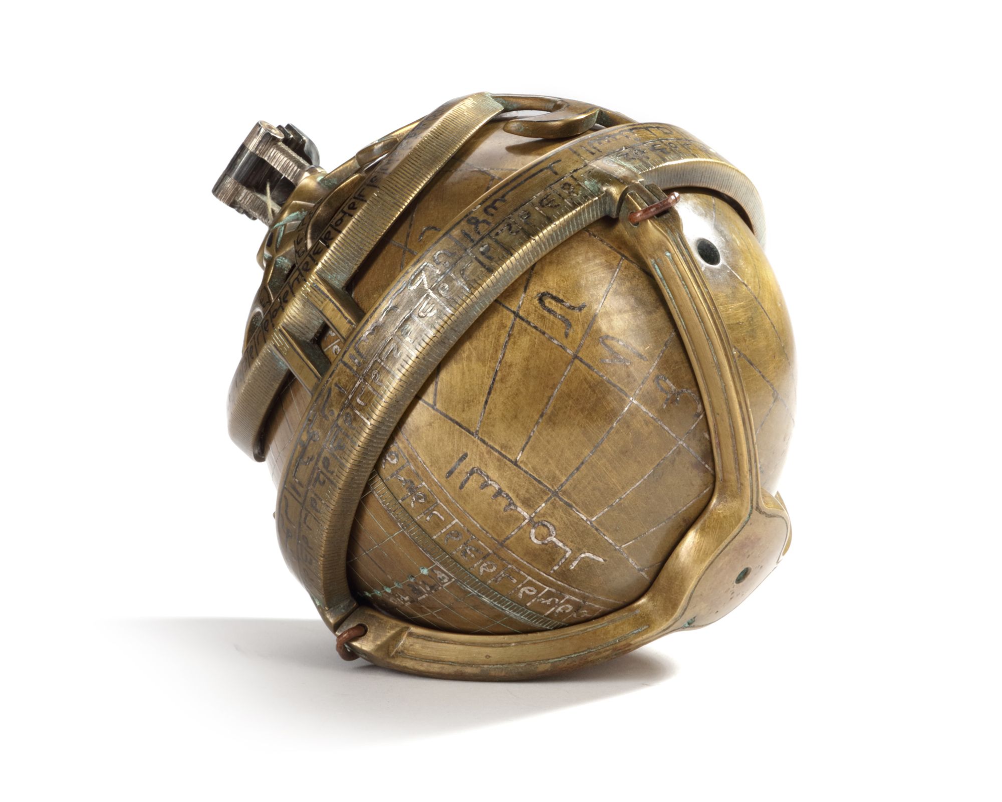 Engraved brass sphere, indicating the lines of the ecliptic and the equator, the meridian lines, the two poles, the twelve signs of the zodiac and the fixed stars with cursive inscriptions.