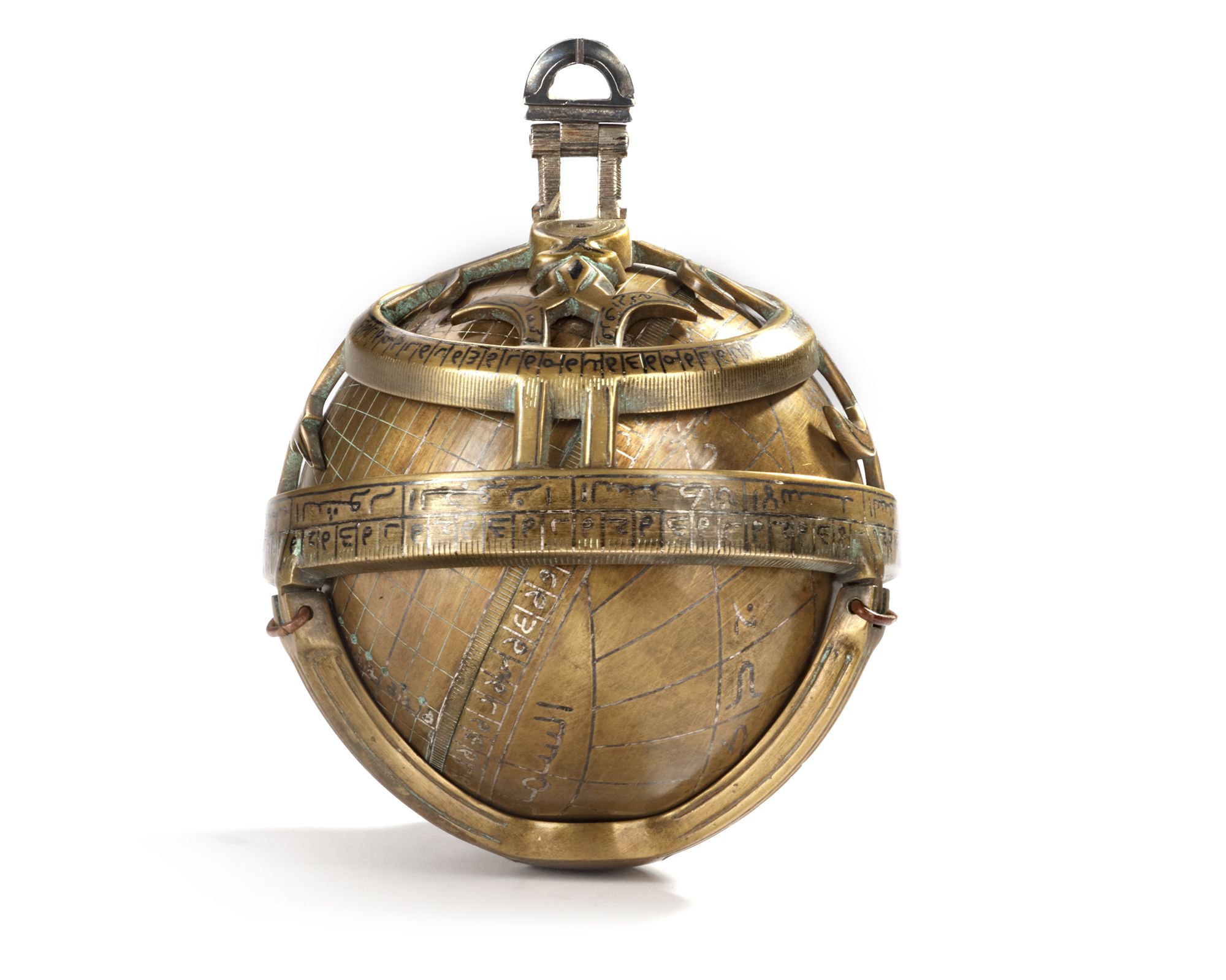 The ecliptic and celestial equator divided into degrees and minutes, with tropical and polar circles. The maker signed and dated the globe, “The work of Mūsa. Year 885.”