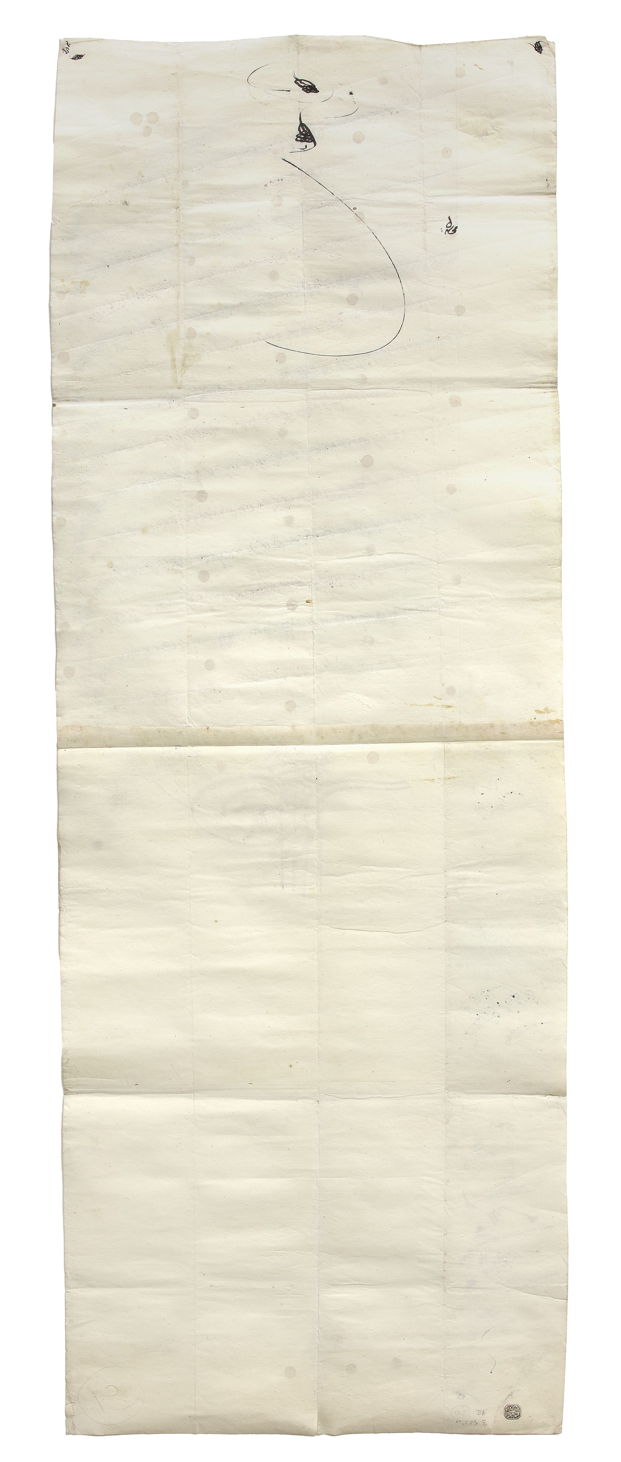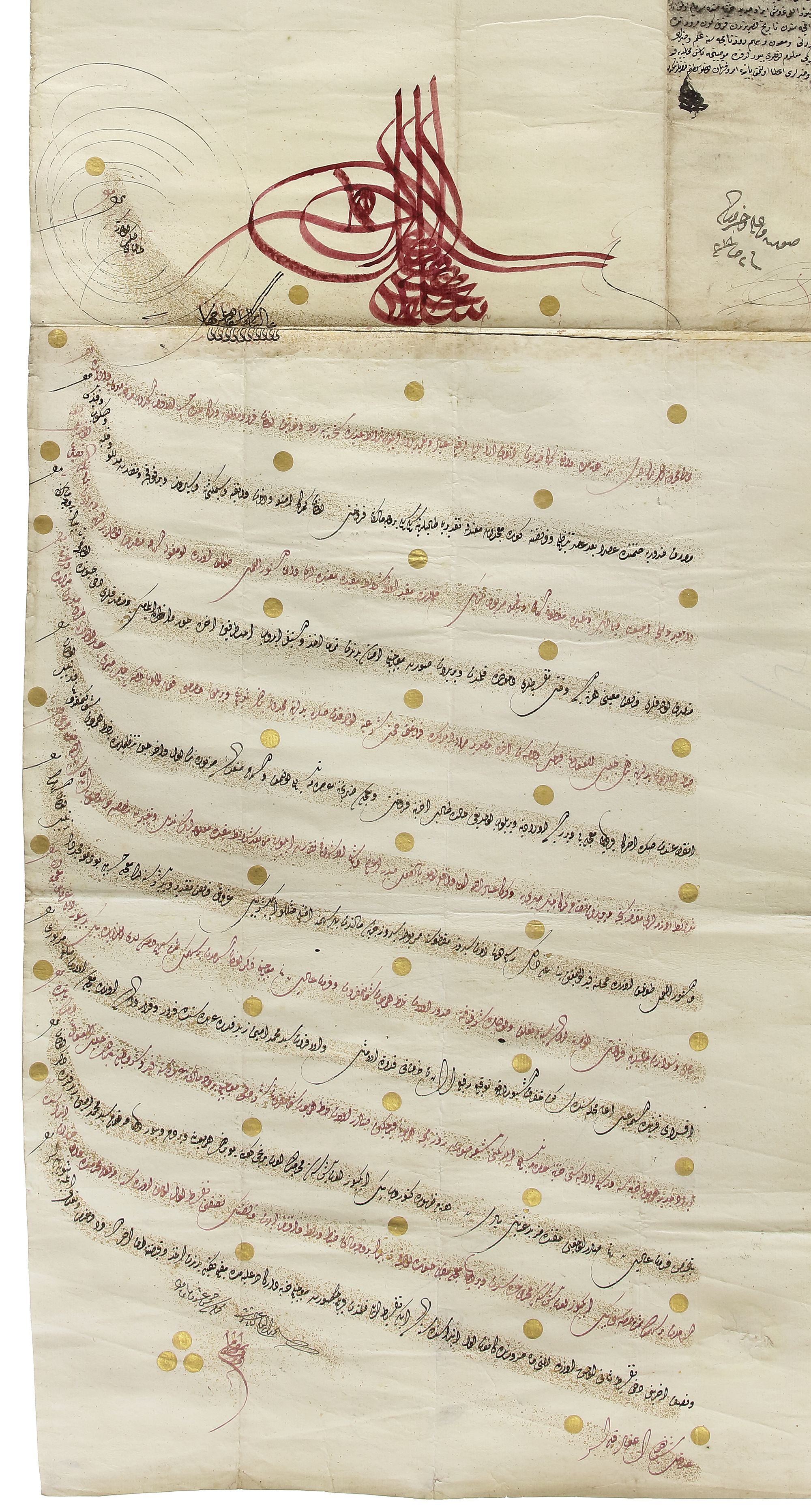Ink and gold on burnished paper, with the tughra of Sultan Selim III in red surmounting 16 lines of elegant diwani in alternating black and red, a small line in red at the end and a series of gold dots as stops between the lines.